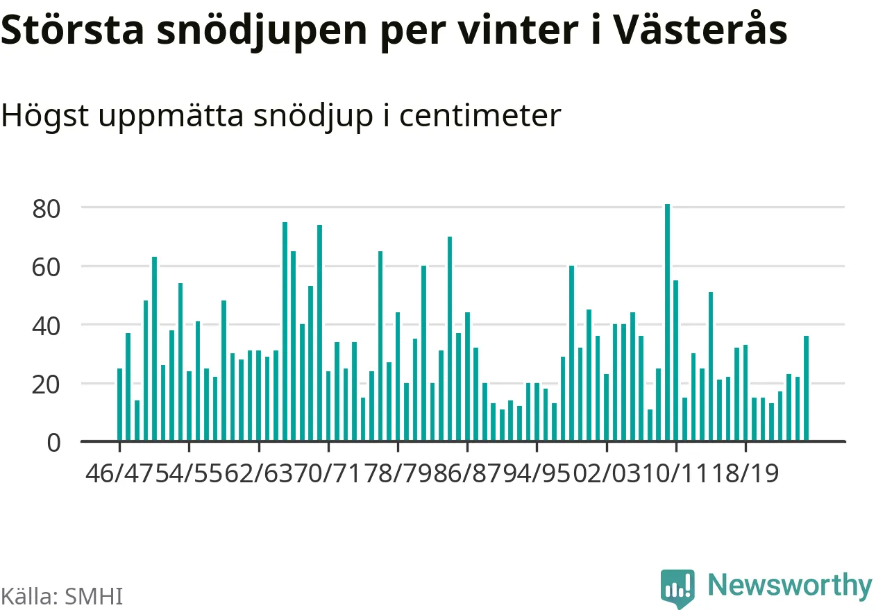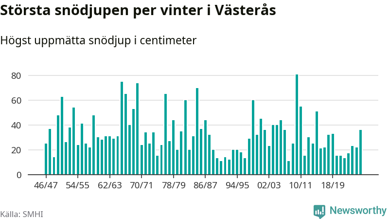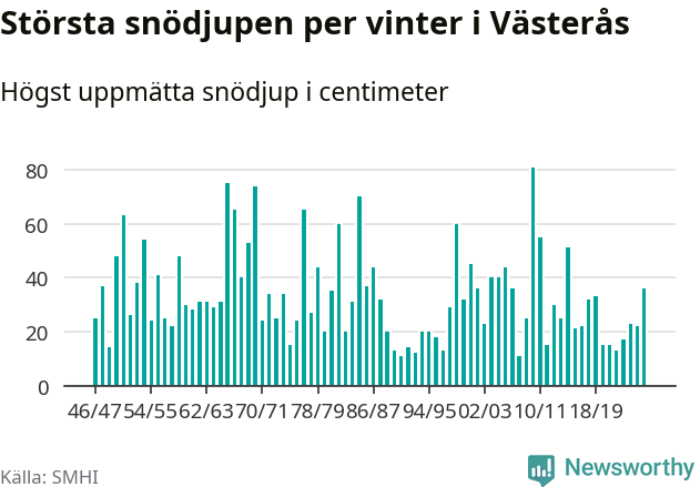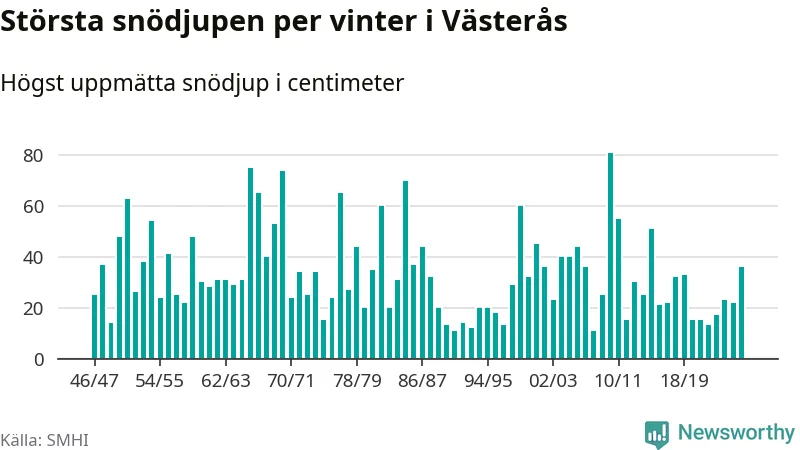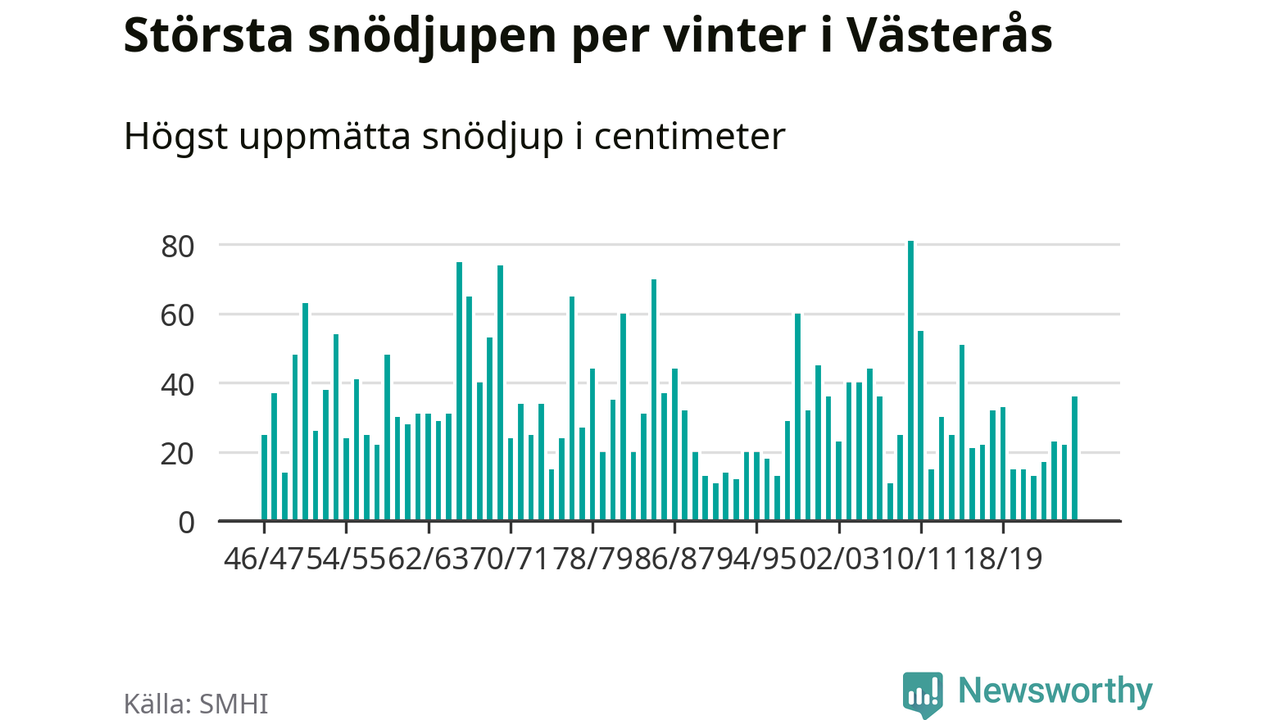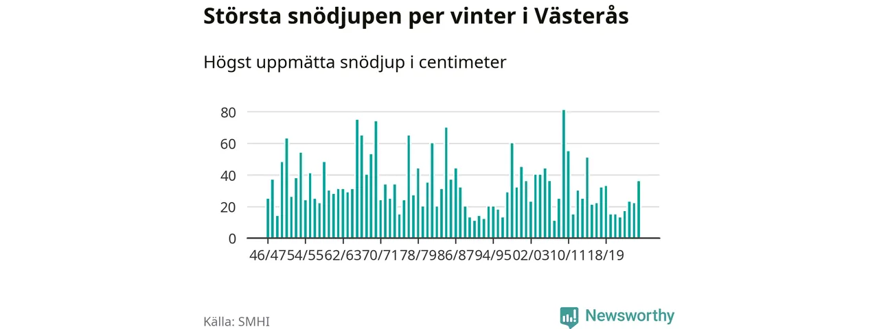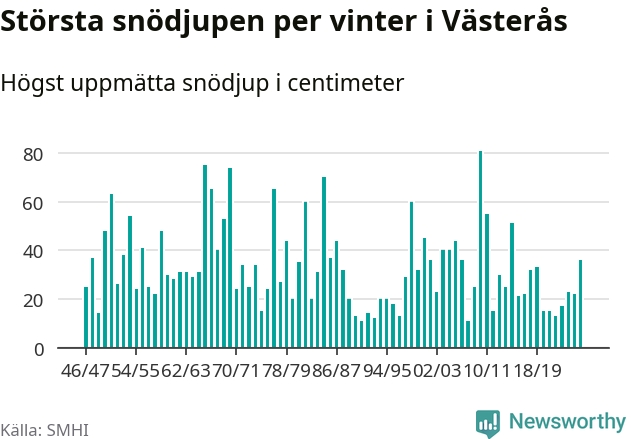 Men hur står sig det snödjupet historiskt sett? Newsworthy har tittat på det största snödjup som SMHI har uppmätt i Västerås kommun varje år sedan vintern 1946/47 – och hittills tar sig årets vinter inte in bland de 25 vintrarna med störst uppmätt snödjup i kommunen.