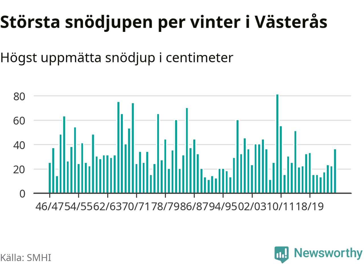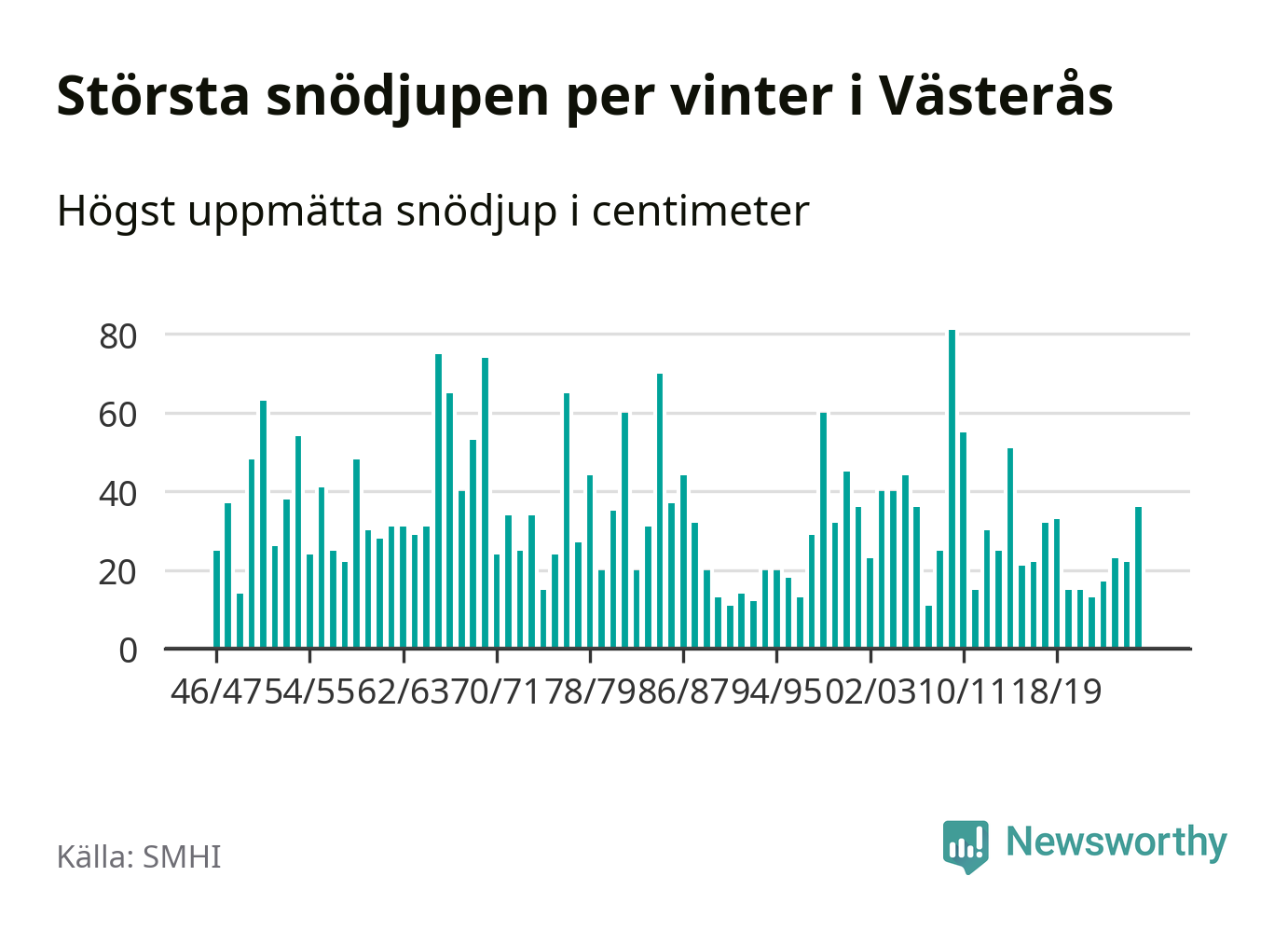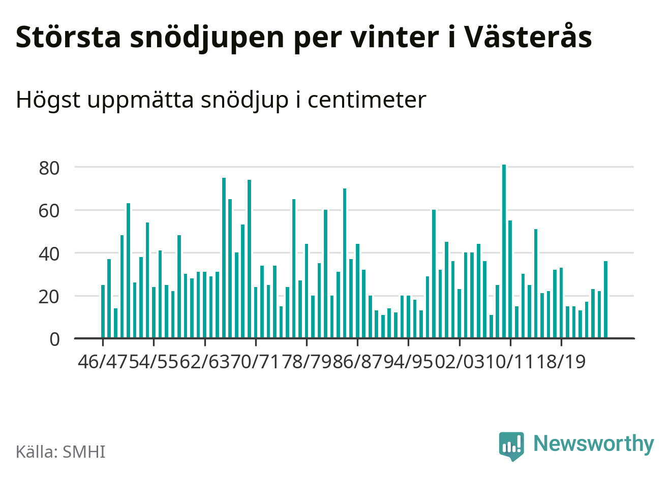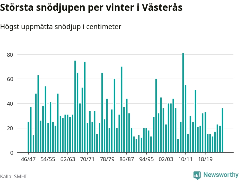 Men hur står sig det snödjupet historiskt sett? Newsworthy har tittat på det största snödjup som SMHI har uppmätt i Västerås kommun varje år sedan vintern 1946/47 – och hittills tar sig årets vinter inte in bland de 25 vintrarna med störst uppmätt snödjup i kommunen.