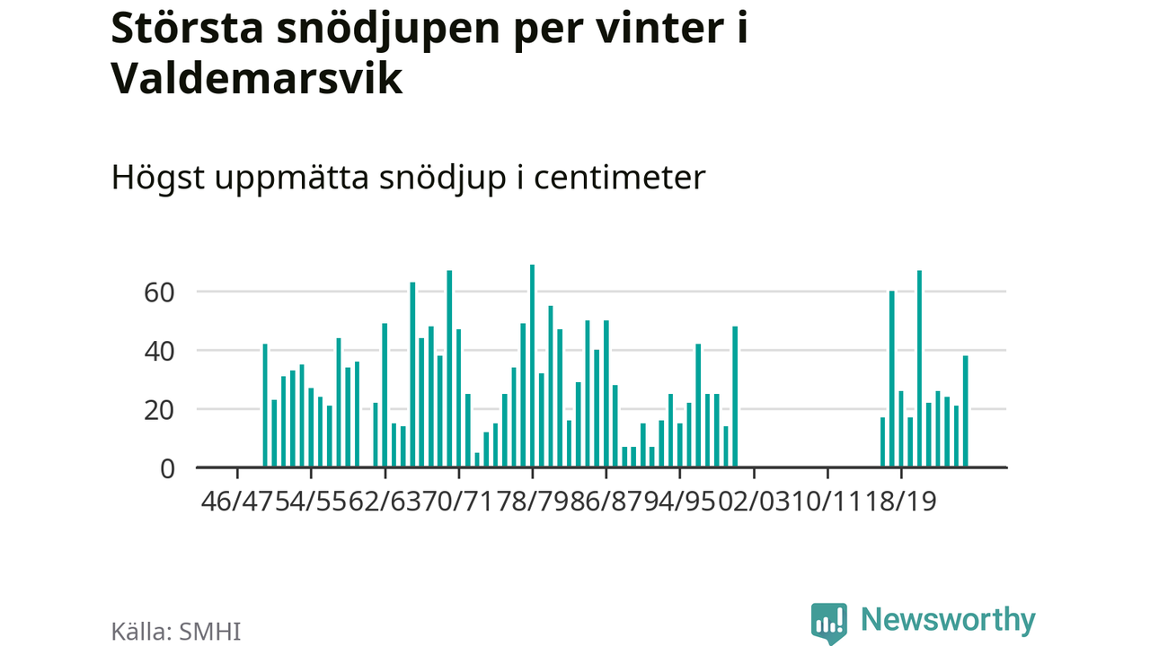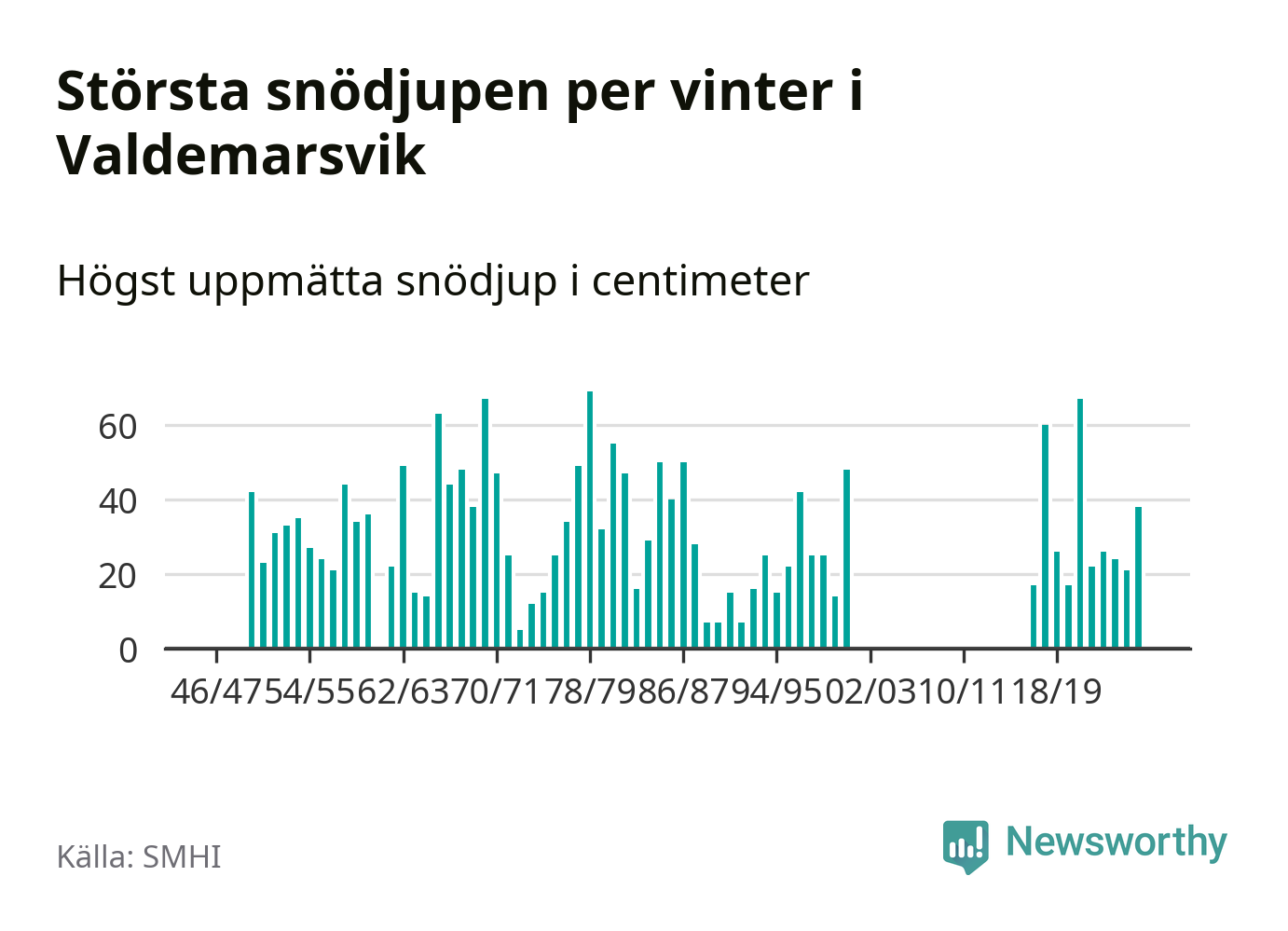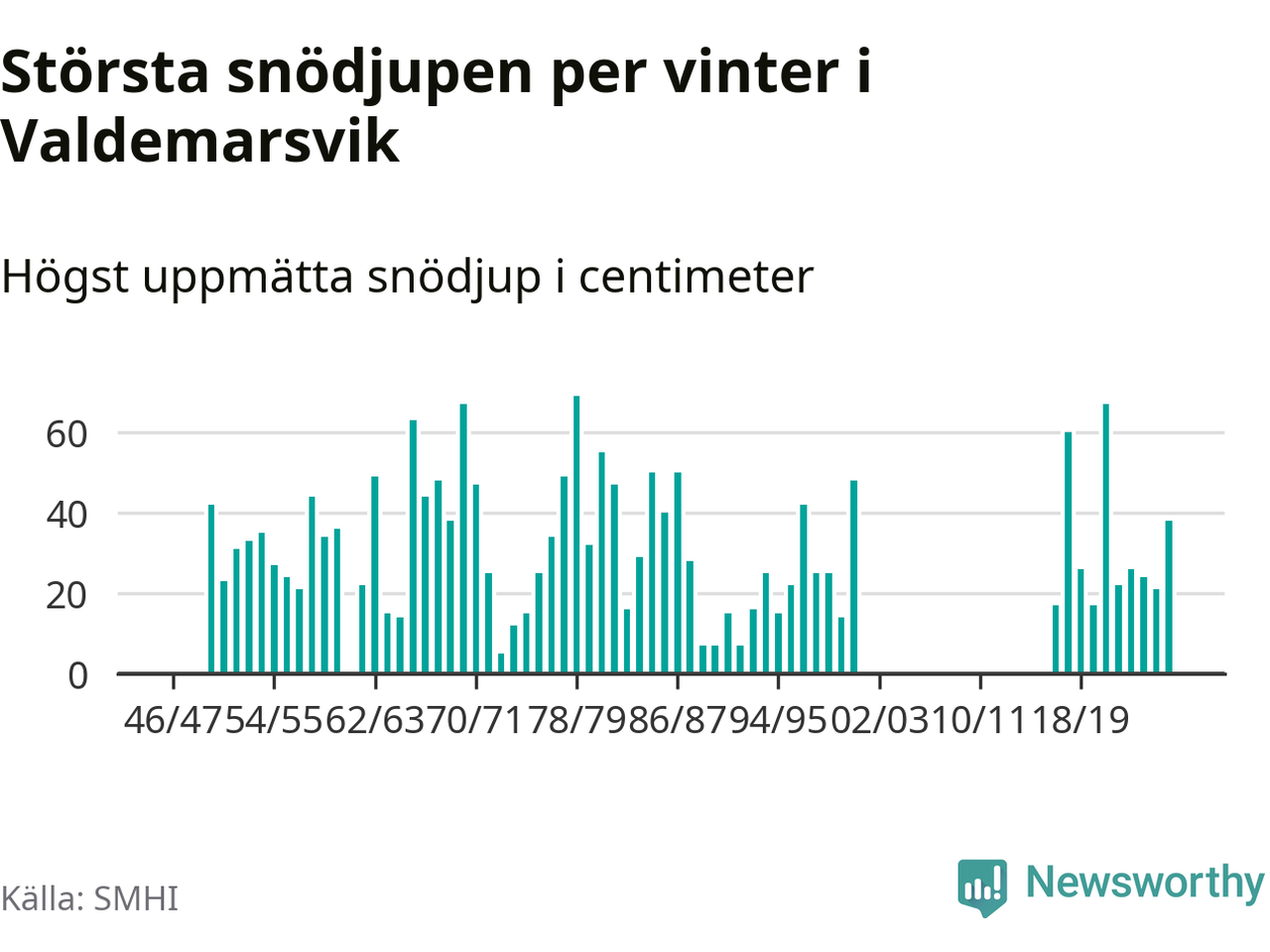 Men hur står sig det snödjupet historiskt sett? Newsworthy har tittat på det största snödjup som SMHI har uppmätt i Valdemarsviks kommun varje år sedan vintern 1946/47. 19 vintrar har det uppmätts större snödjup. Det ska sägas att det inte finns några noteringar för åren 1961 och 2003–2016.