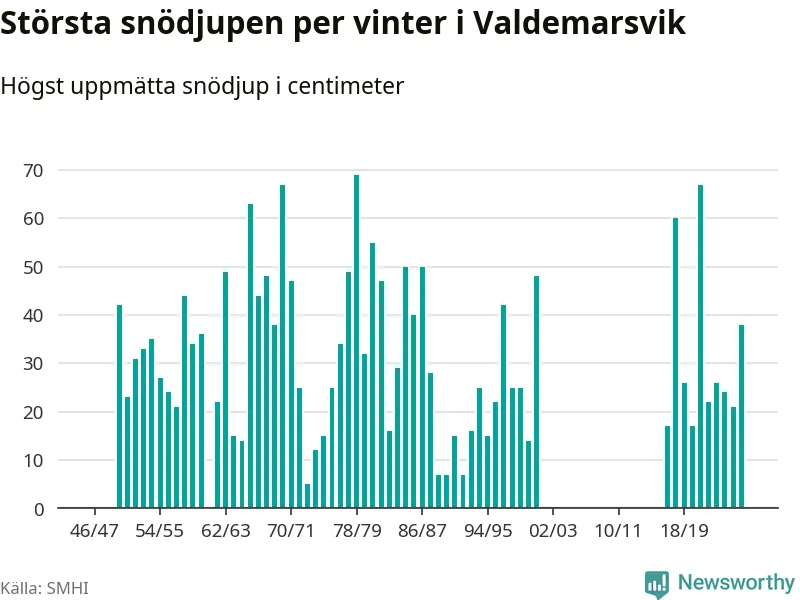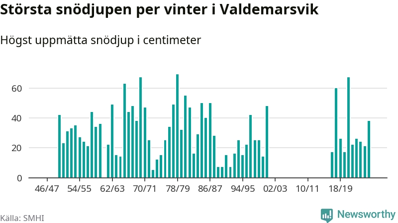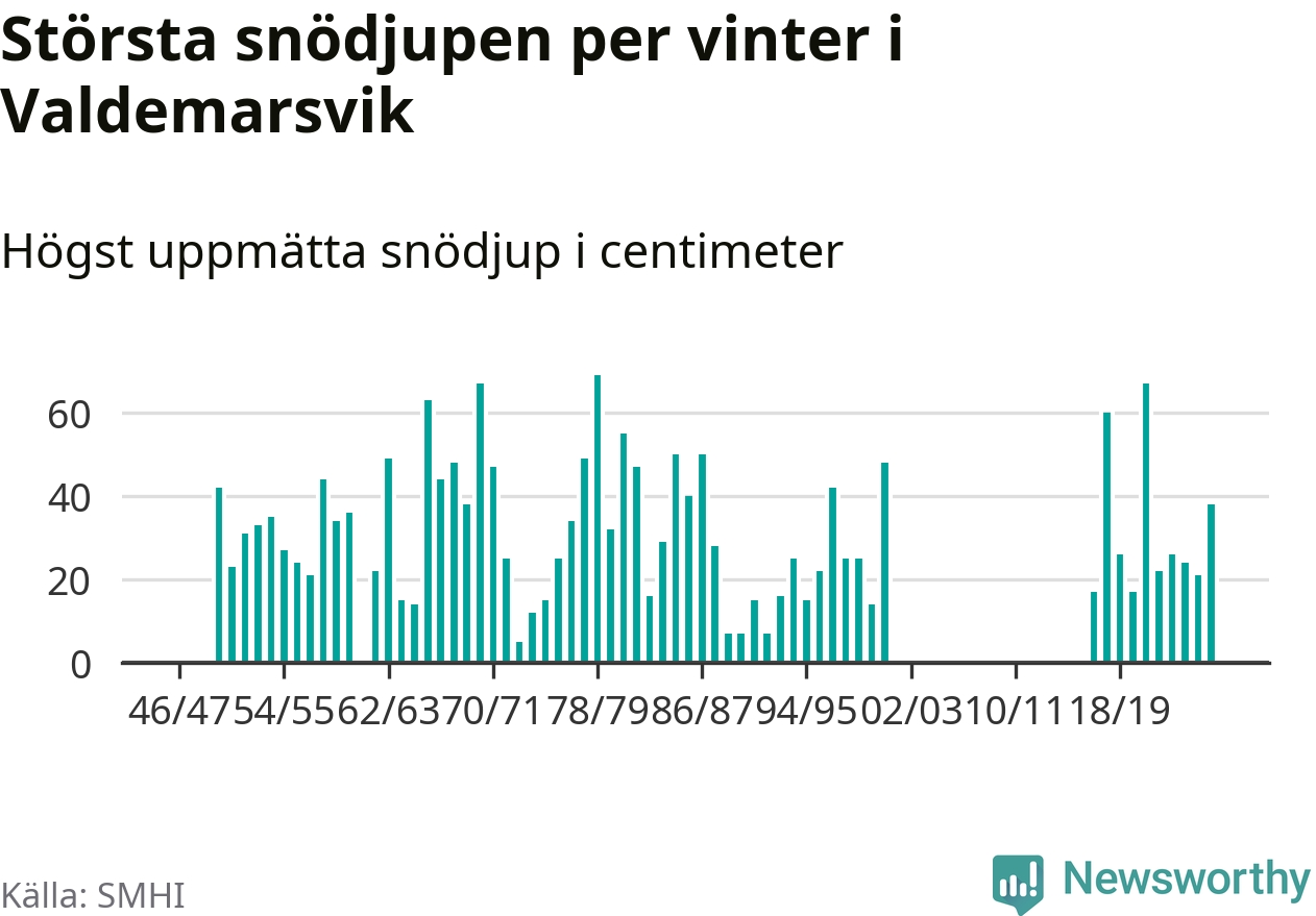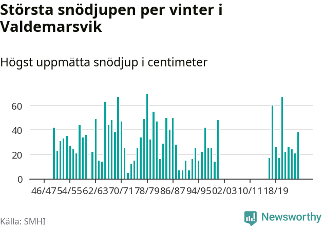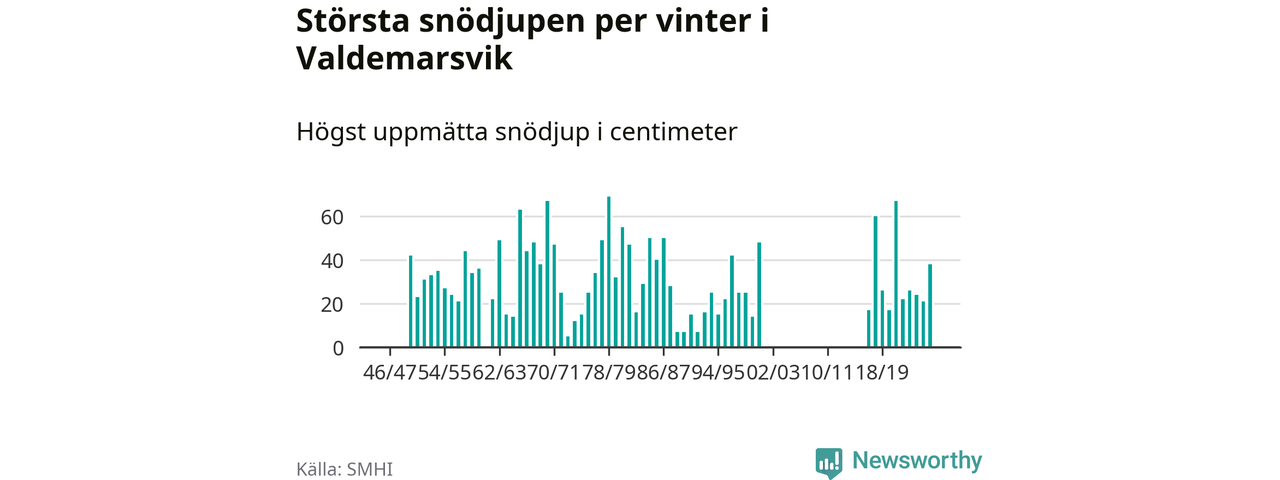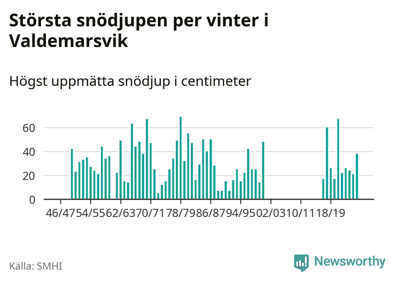 Men hur står sig det snödjupet historiskt sett? Newsworthy har tittat på det största snödjup som SMHI har uppmätt i Valdemarsviks kommun varje år sedan vintern 1946/47. 19 vintrar har det uppmätts större snödjup. Det ska sägas att det inte finns några noteringar för åren 1961 och 2003–2016.