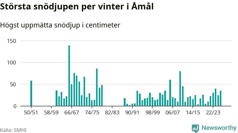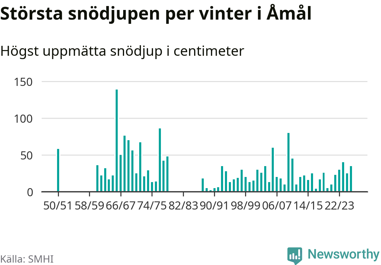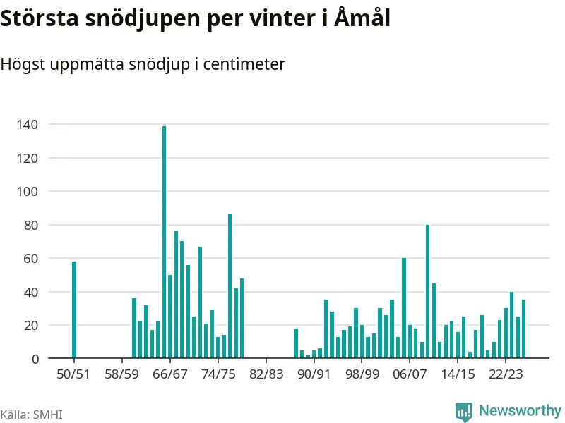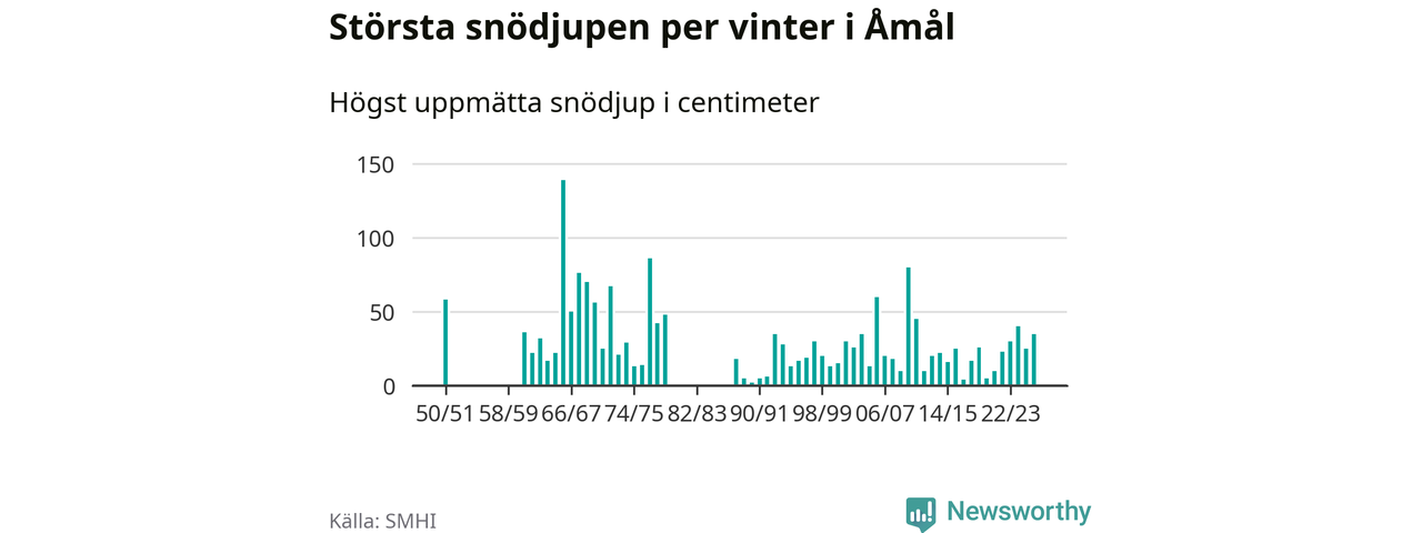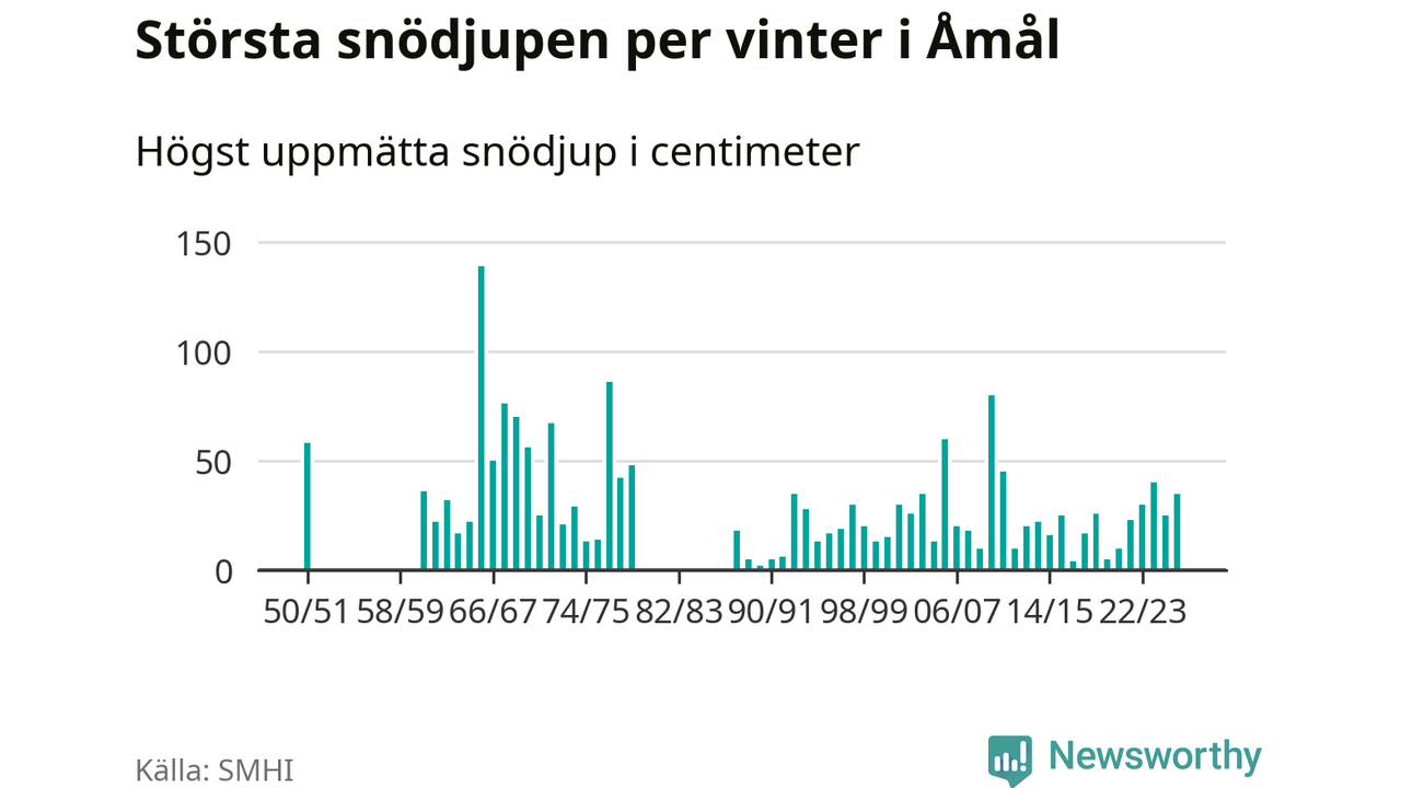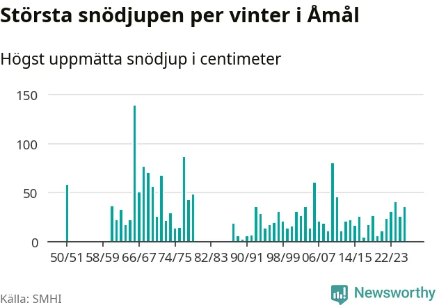 Men hur står sig det snödjupet historiskt sett? Newsworthy har tittat på det största snödjup som SMHI har uppmätt i Åmåls kommun varje år sedan vintern 1950/51. 15 vintrar har det uppmätts större snödjup. Det ska sägas att det inte finns några noteringar för åren 1952–1960 och 1980–1987.
