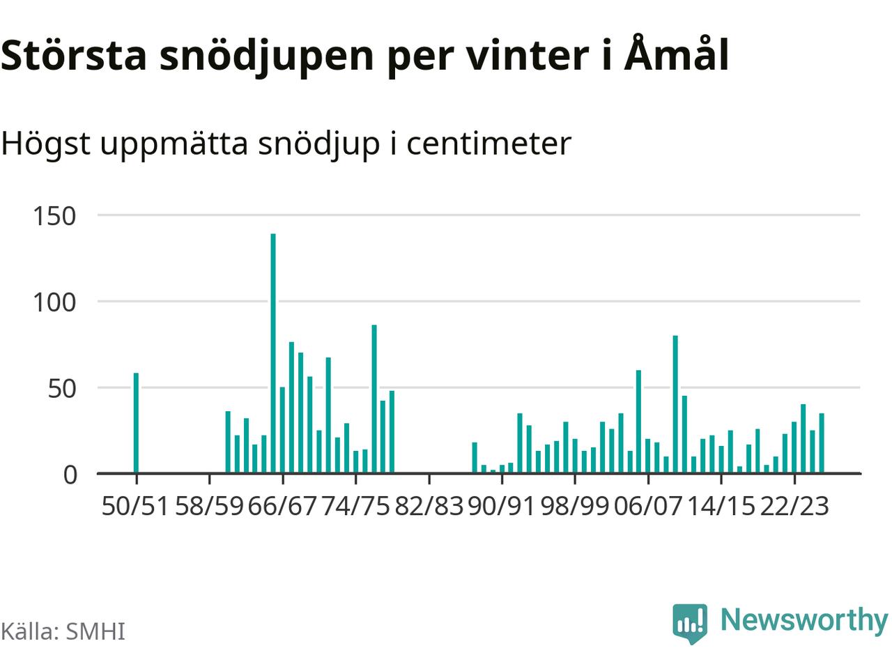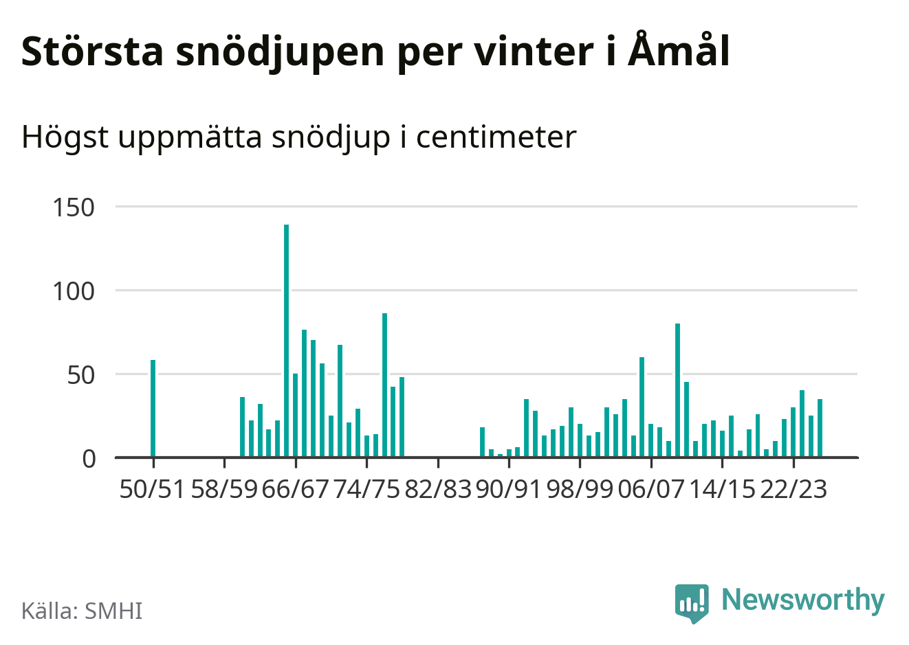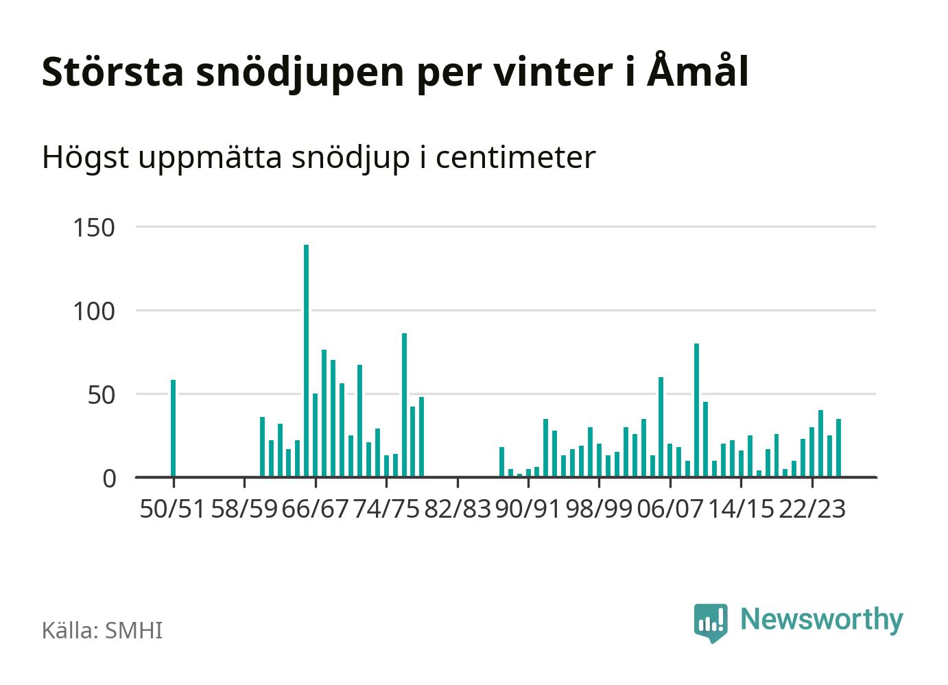 Men hur står sig det snödjupet historiskt sett? Newsworthy har tittat på det största snödjup som SMHI har uppmätt i Åmåls kommun varje år sedan vintern 1950/51. 15 vintrar har det uppmätts större snödjup. Det ska sägas att det inte finns några noteringar för åren 1952–1960 och 1980–1987.