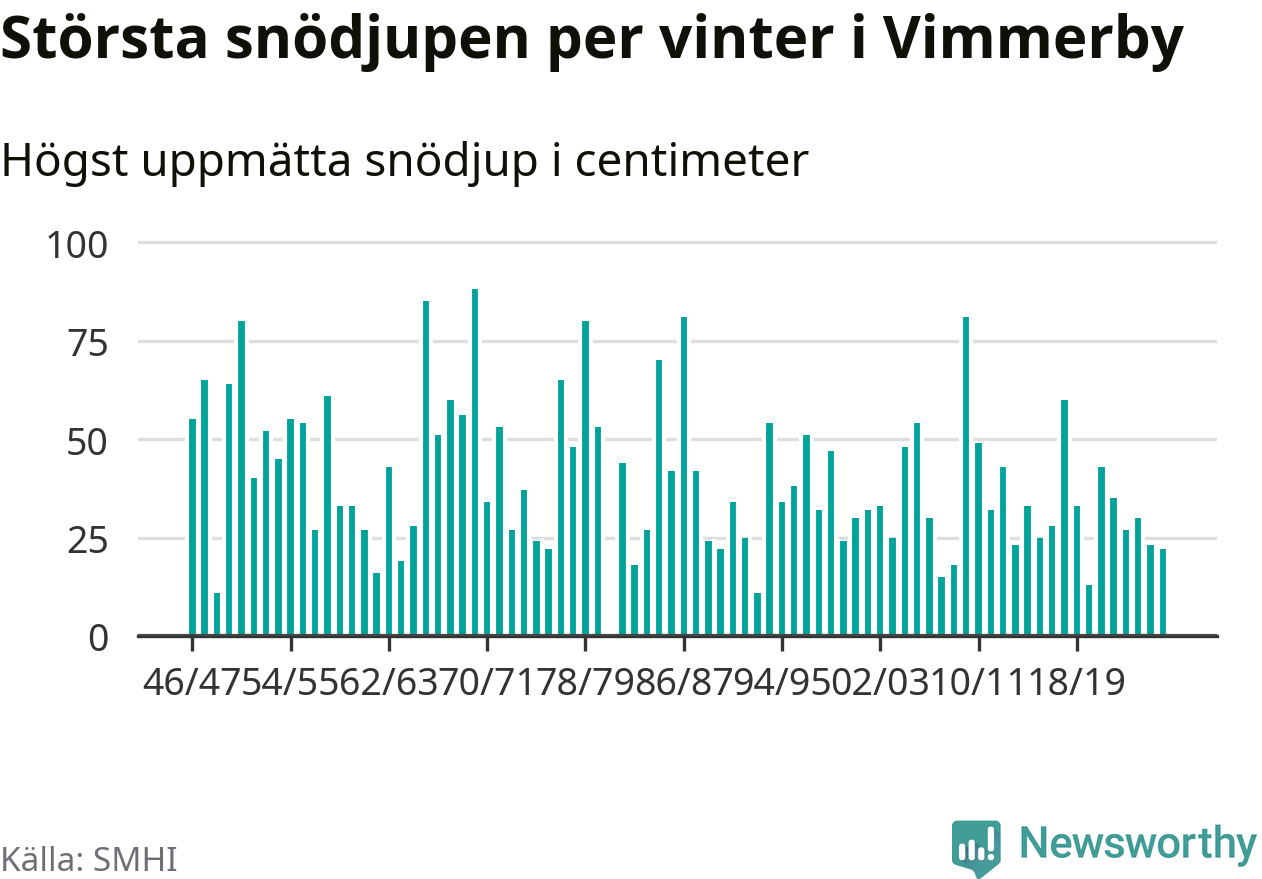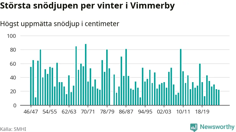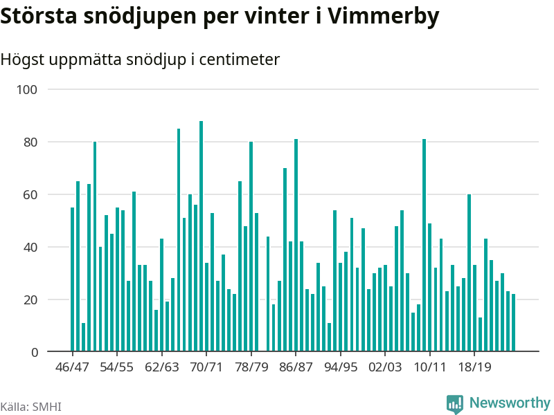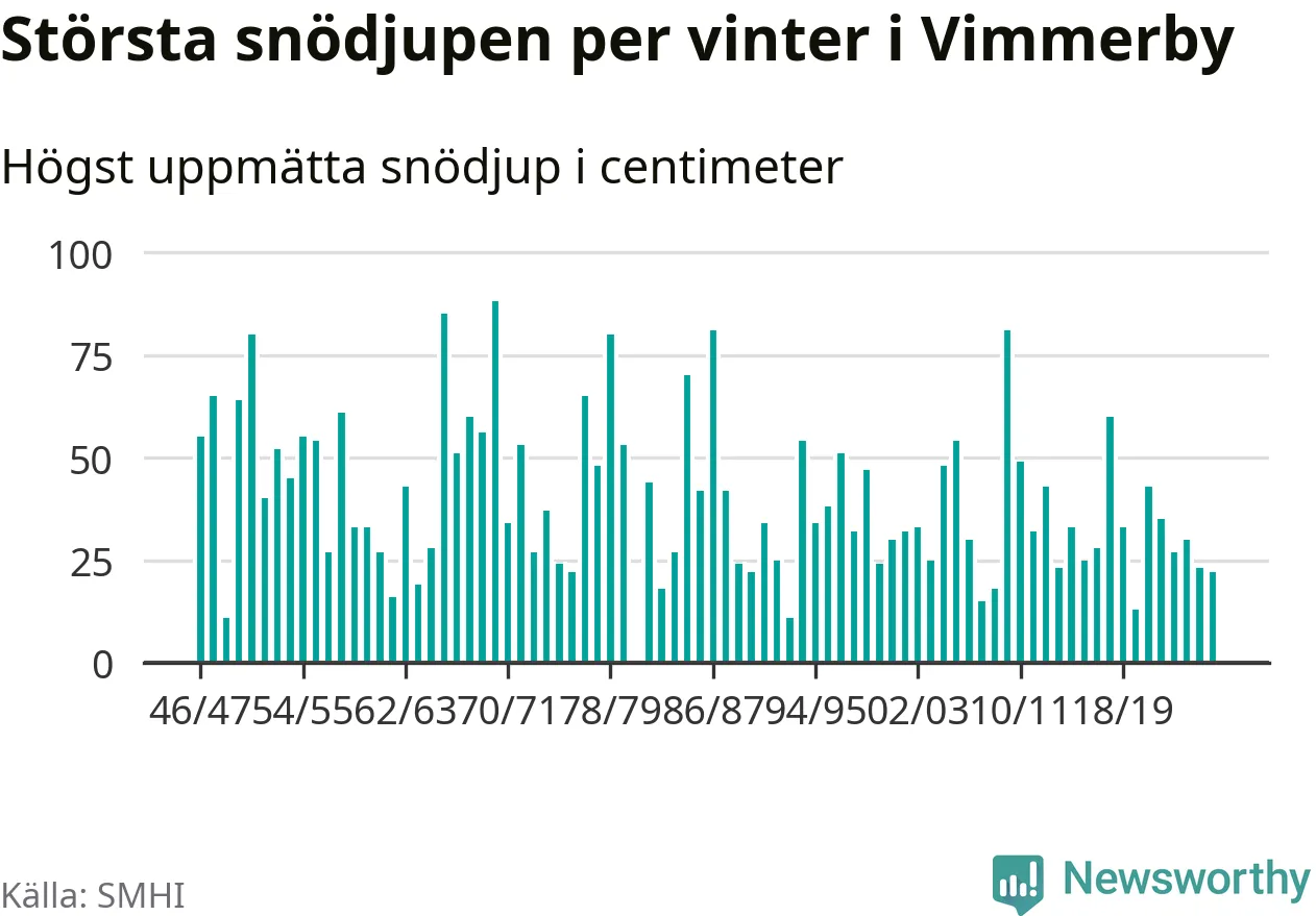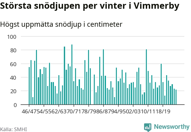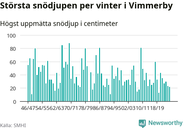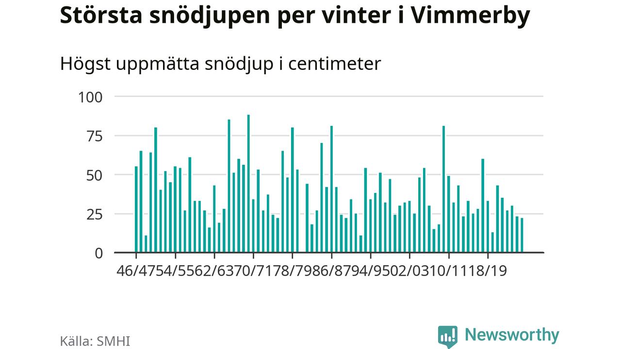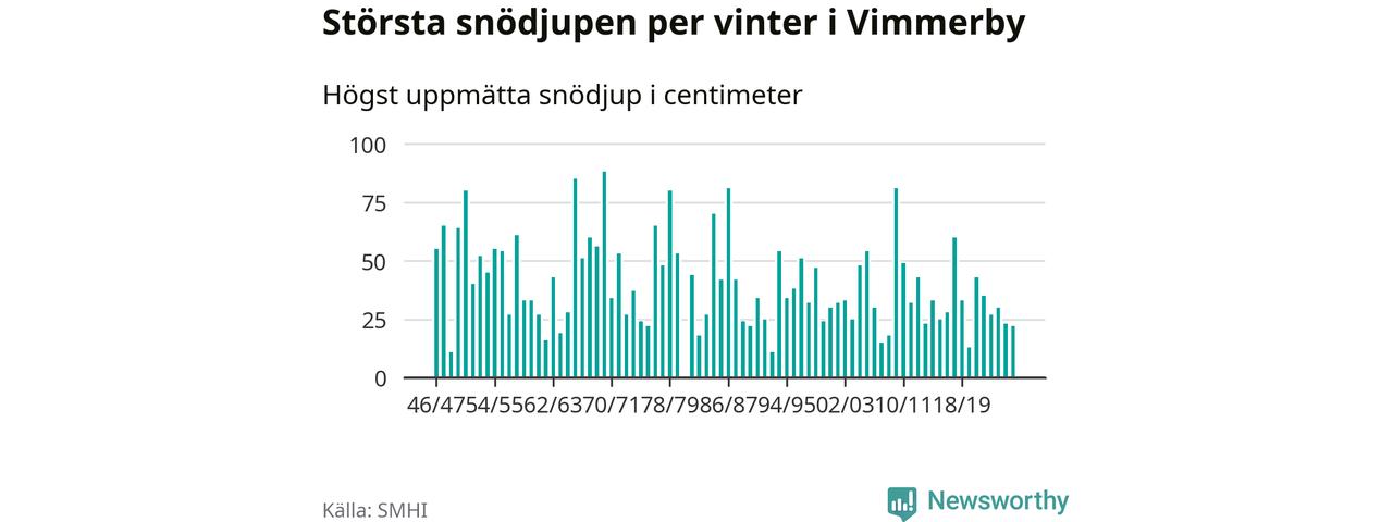 Men hur står sig det snödjupet historiskt sett? Newsworthy har tittat på det största snödjup som SMHI har uppmätt i Vimmerby kommun varje år sedan vintern 1946/47 – och hittills tar sig årets vinter inte in bland de 25 vintrarna med störst uppmätt snödjup i kommunen.