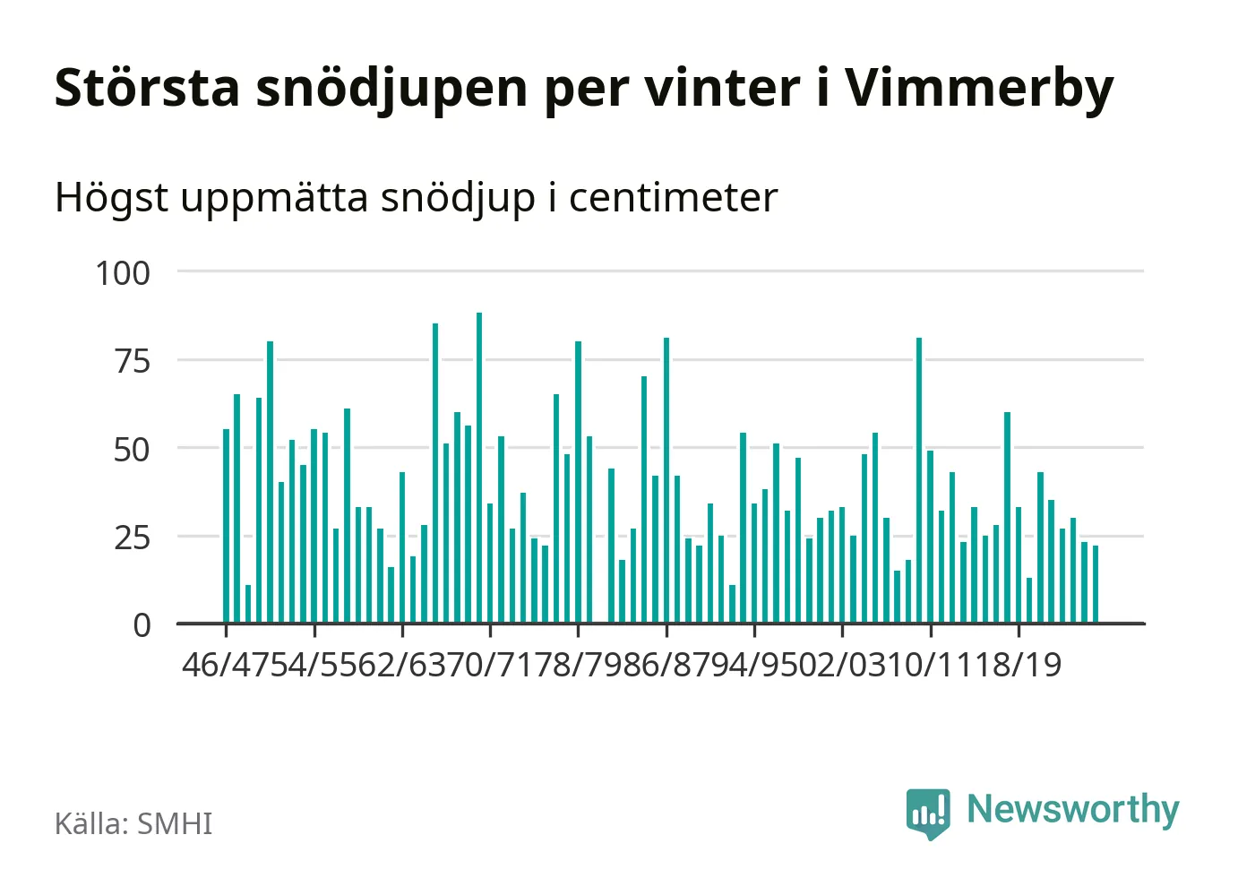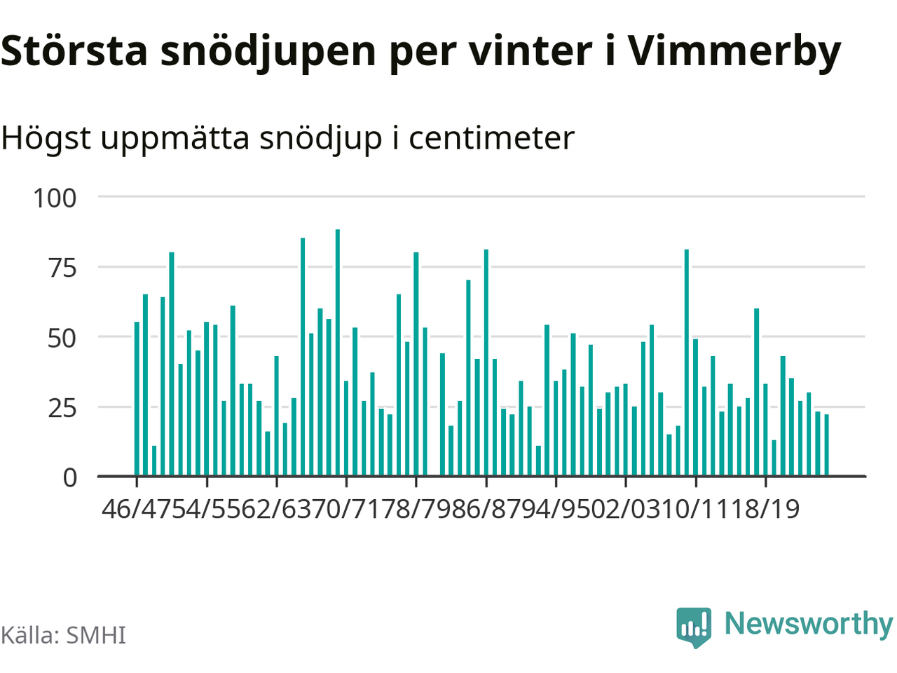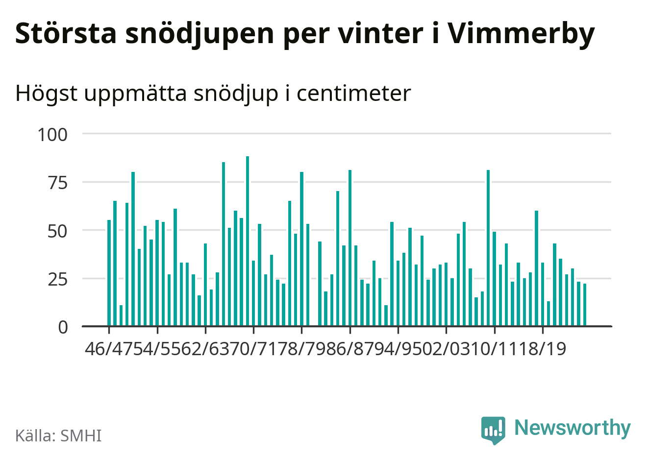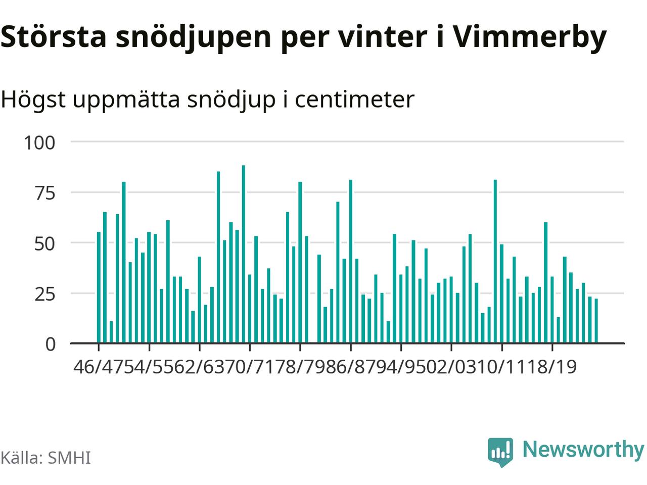 Men hur står sig det snödjupet historiskt sett? Newsworthy har tittat på det största snödjup som SMHI har uppmätt i Vimmerby kommun varje år sedan vintern 1946/47 – och hittills tar sig årets vinter inte in bland de 25 vintrarna med störst uppmätt snödjup i kommunen.