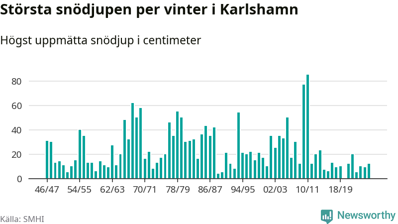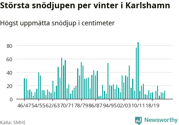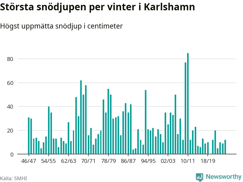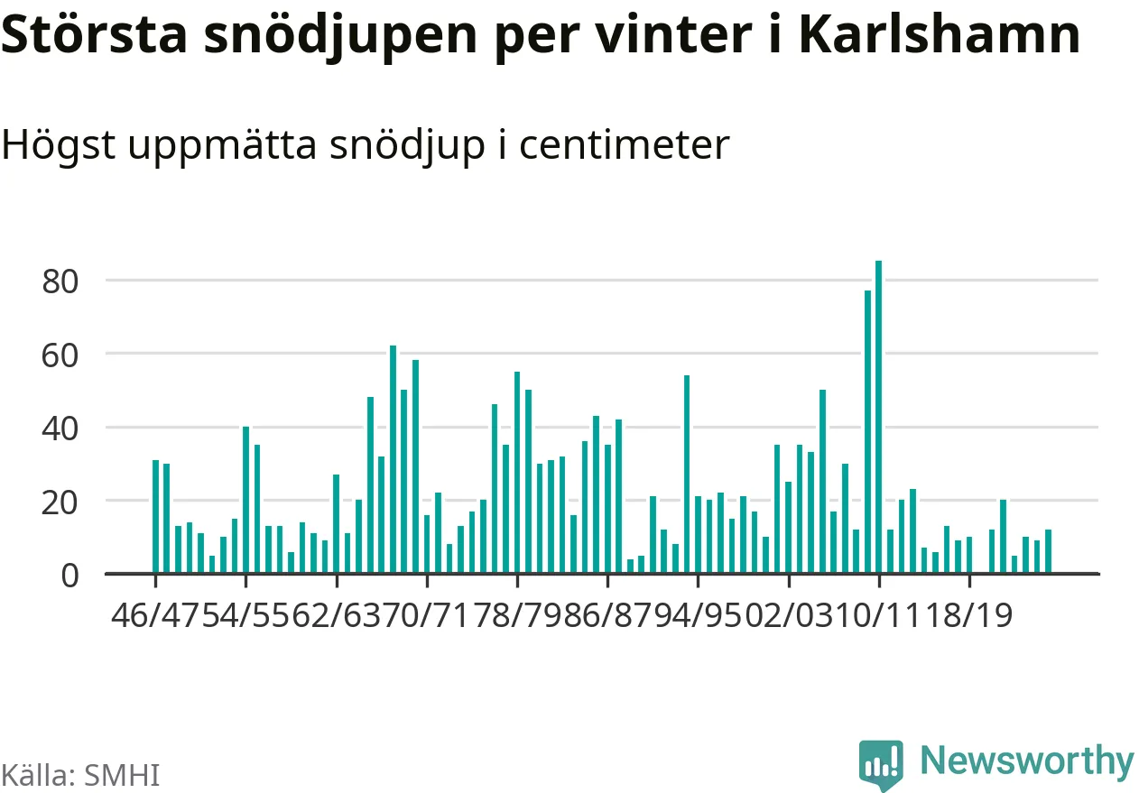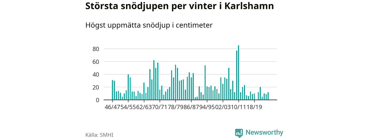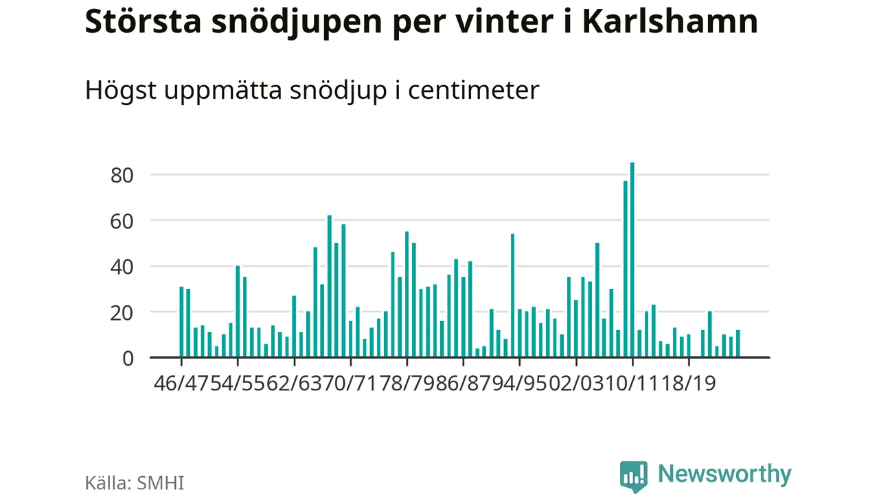 Men hur står sig det snödjupet historiskt sett? Newsworthy har tittat på det största snödjup som SMHI har uppmätt i Karlshamns kommun varje år sedan vintern 1946/47 – och hittills tar sig årets vinter inte in bland de 25 vintrarna med störst uppmätt snödjup i kommunen.