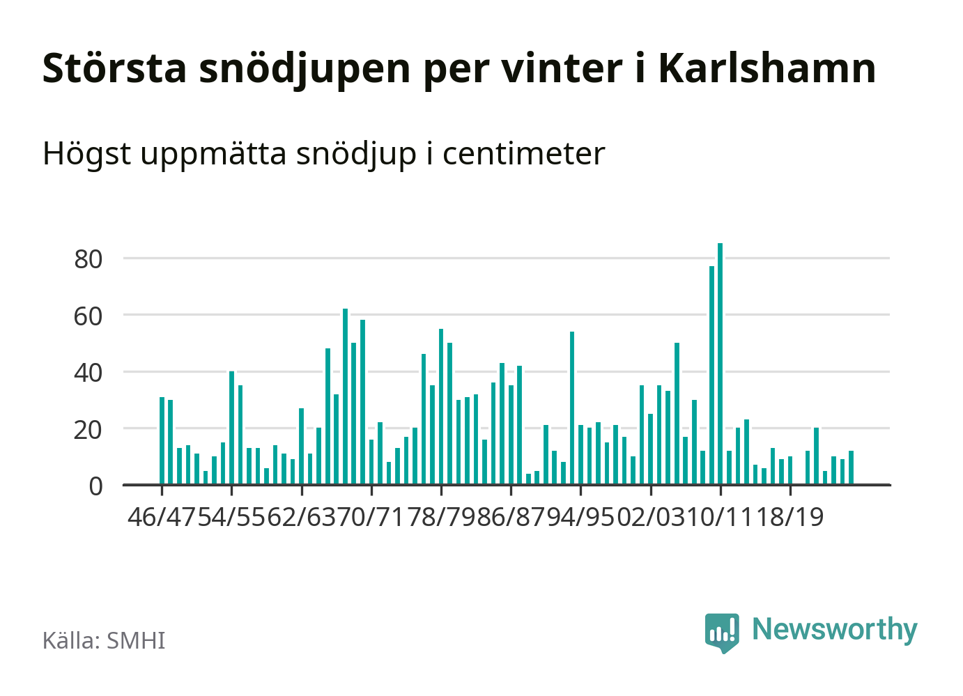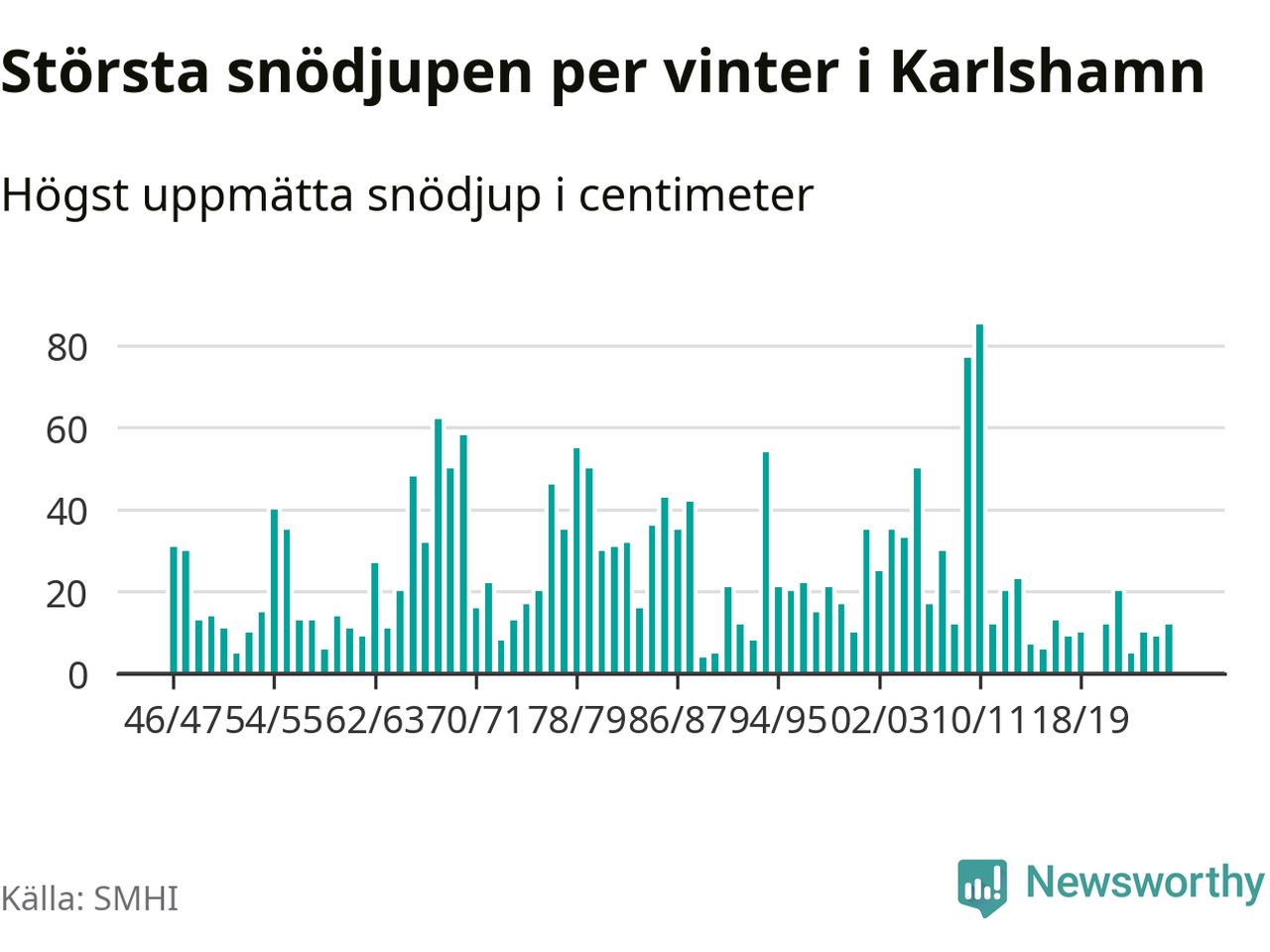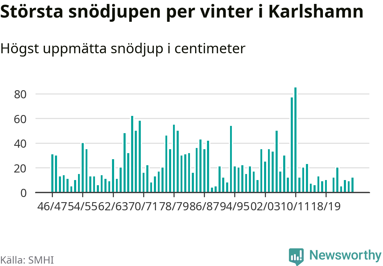 Men hur står sig det snödjupet historiskt sett? Newsworthy har tittat på det största snödjup som SMHI har uppmätt i Karlshamns kommun varje år sedan vintern 1946/47 – och hittills tar sig årets vinter inte in bland de 25 vintrarna med störst uppmätt snödjup i kommunen.