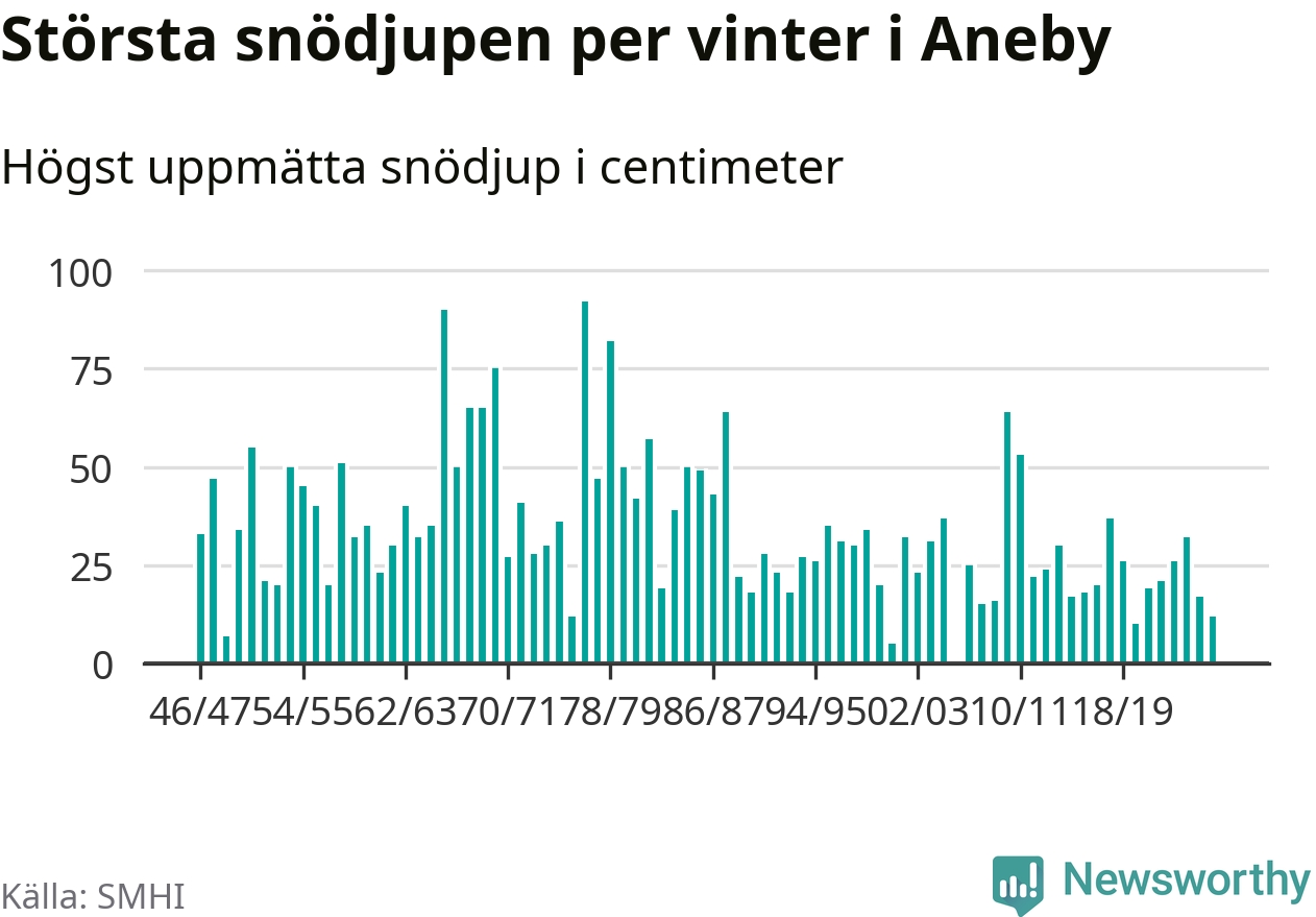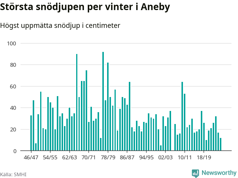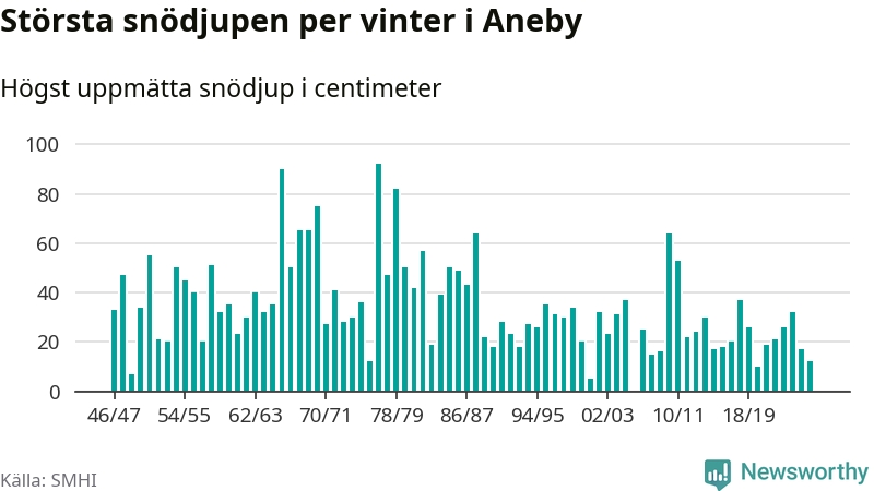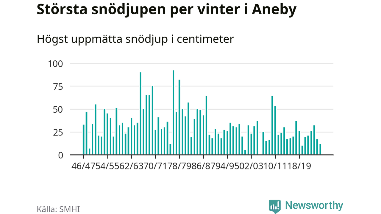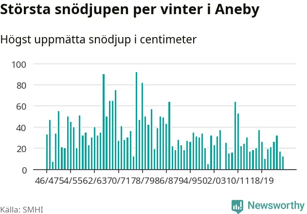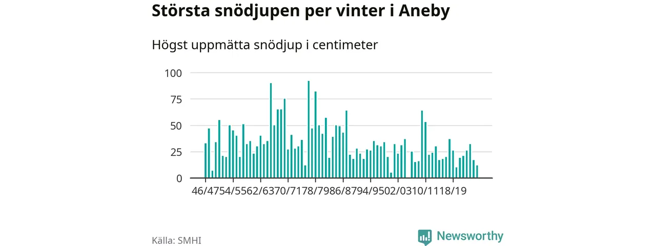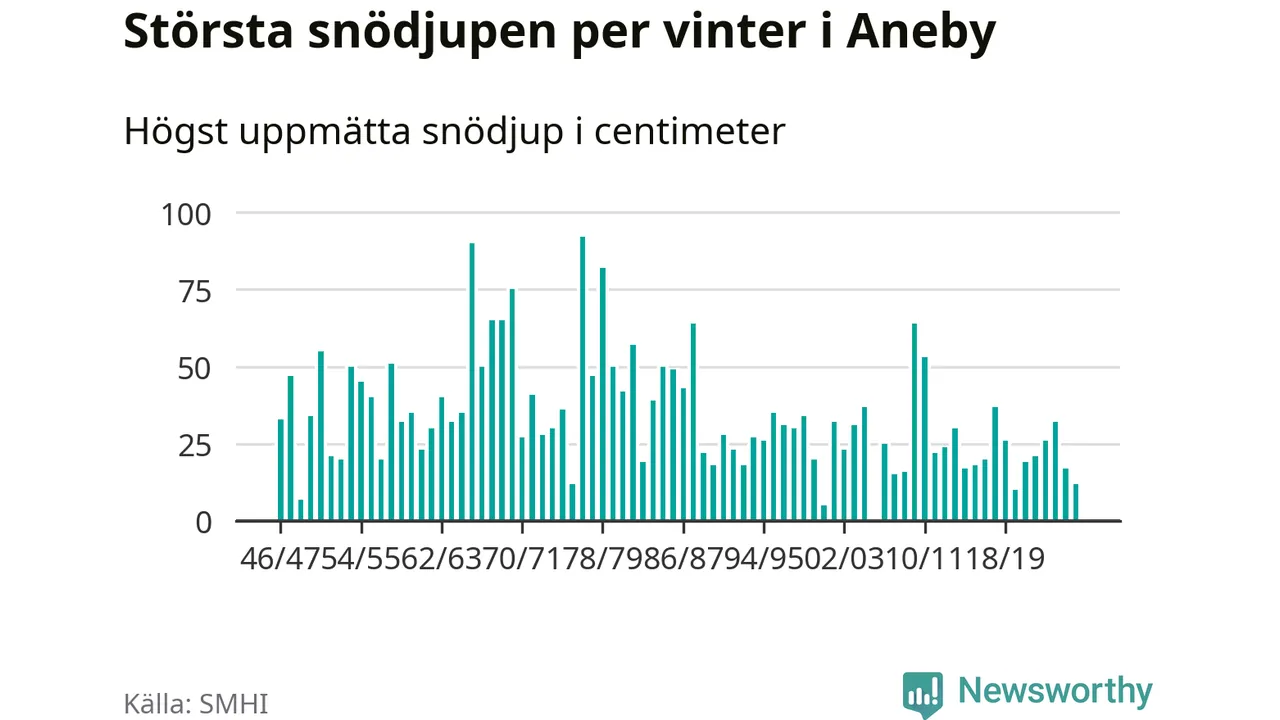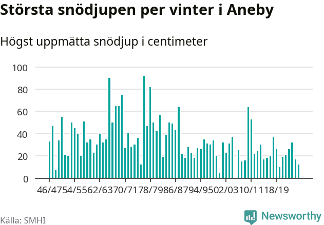 Men hur står sig det snödjupet historiskt sett? Newsworthy har tittat på det största snödjup som SMHI har uppmätt i Aneby kommun varje år sedan vintern 1946/47 – och hittills tar sig årets vinter inte in bland de 25 vintrarna med störst uppmätt snödjup i kommunen. Det ska sägas att det inte finns någon notering för 2006.
