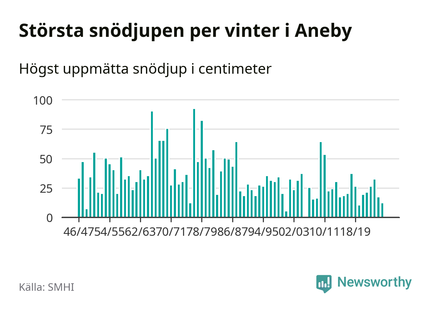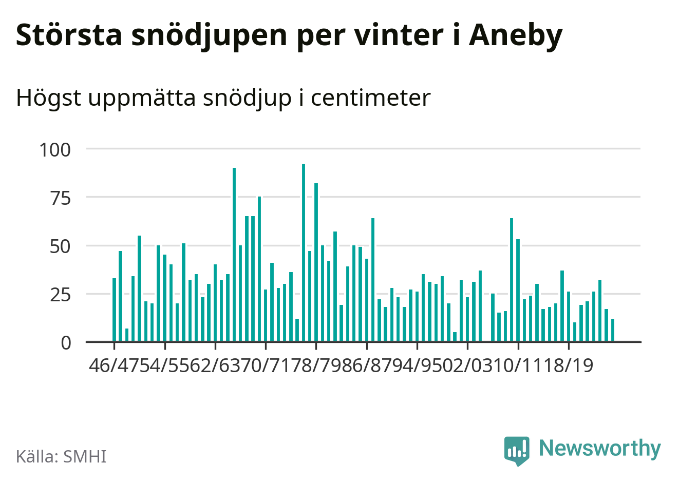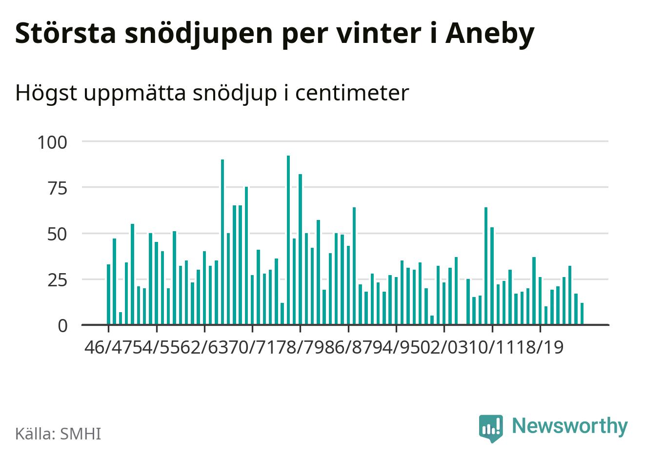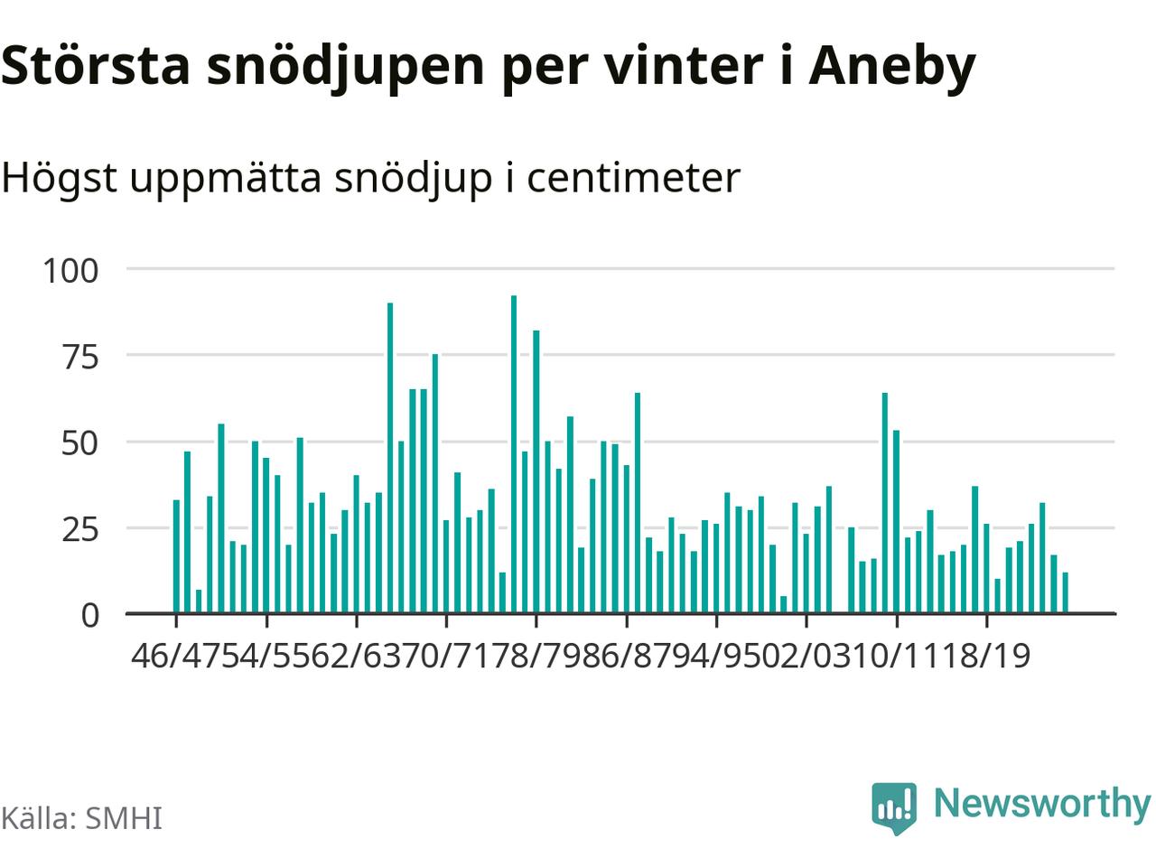 Men hur står sig det snödjupet historiskt sett? Newsworthy har tittat på det största snödjup som SMHI har uppmätt i Aneby kommun varje år sedan vintern 1946/47 – och hittills tar sig årets vinter inte in bland de 25 vintrarna med störst uppmätt snödjup i kommunen. Det ska sägas att det inte finns någon notering för 2006.