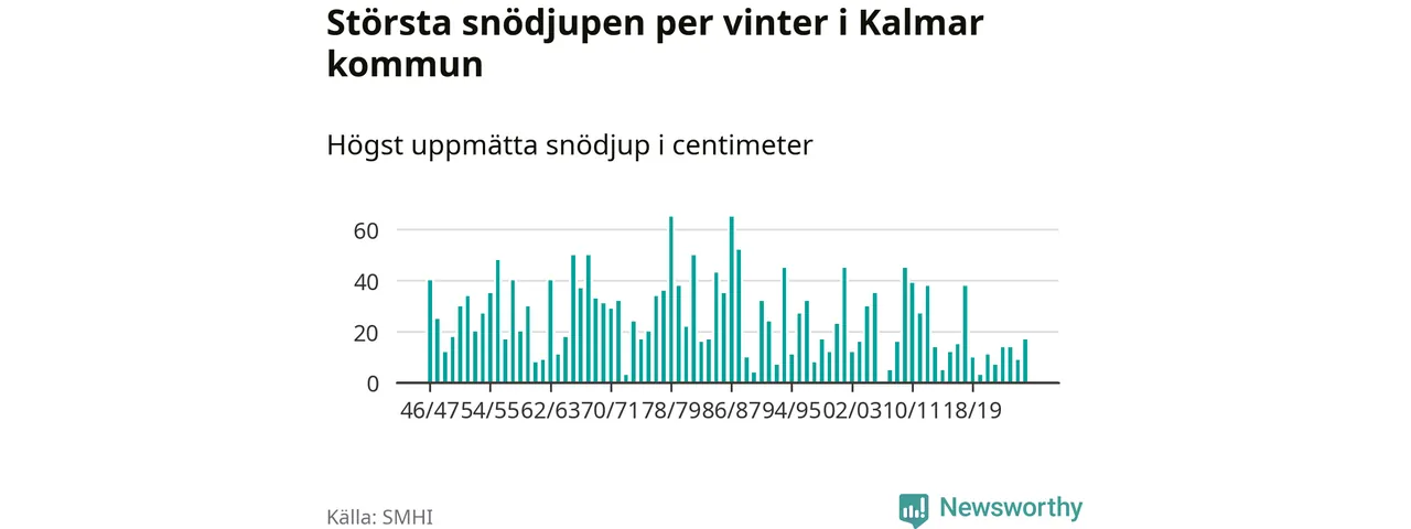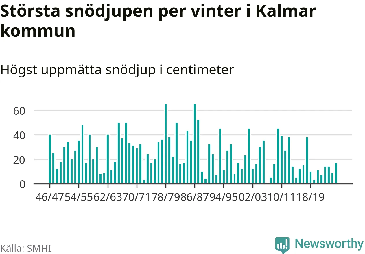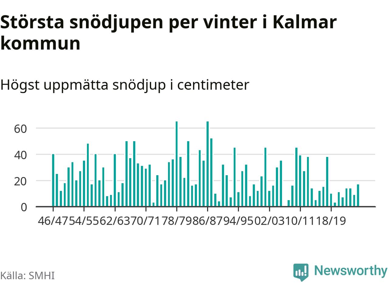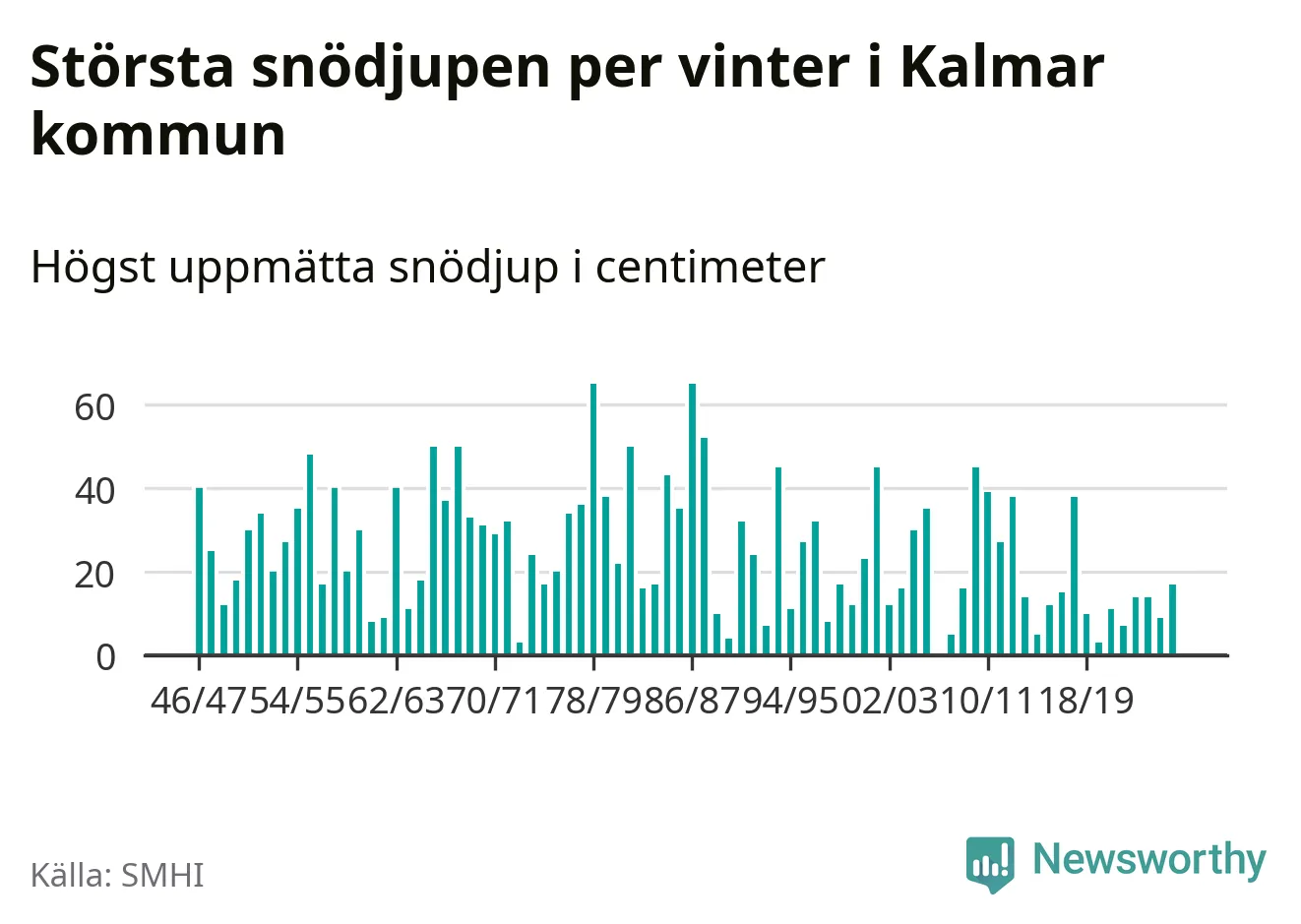 Men hur står sig det snödjupet historiskt sett? Newsworthy har tittat på det största snödjup som SMHI har uppmätt i Kalmar kommun varje år sedan vintern 1946/47 – och hittills tar sig årets vinter inte in bland de 25 vintrarna med störst uppmätt snödjup i kommunen.