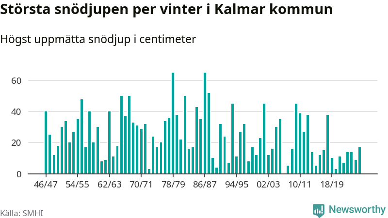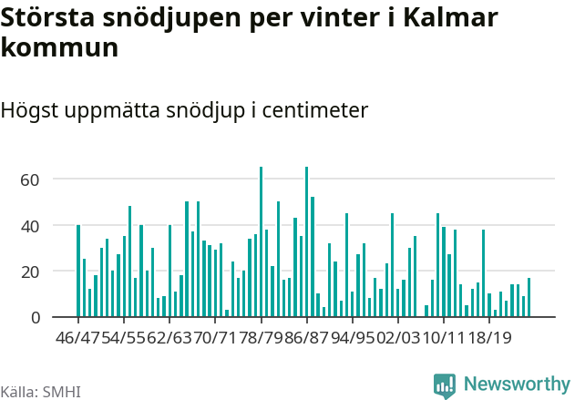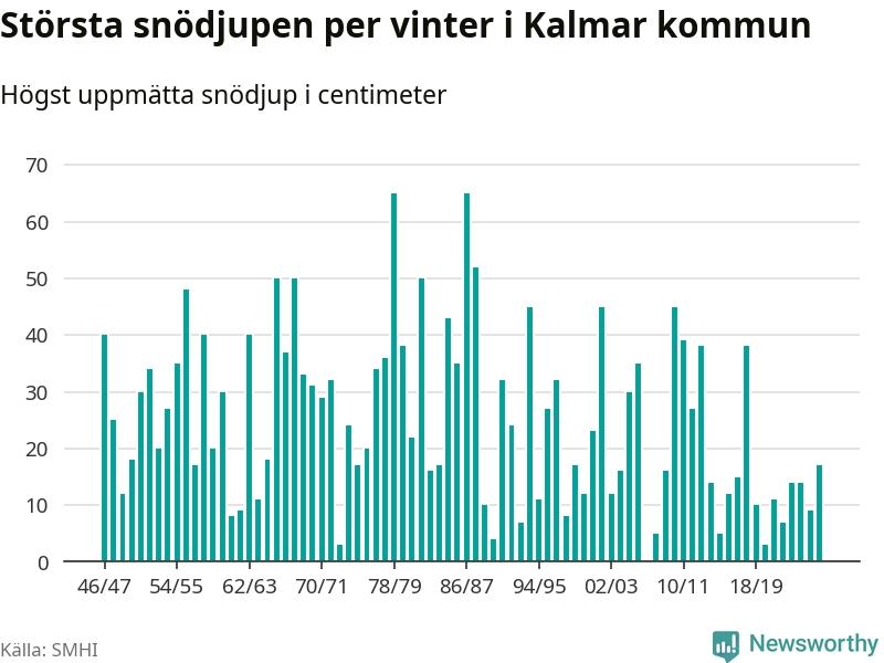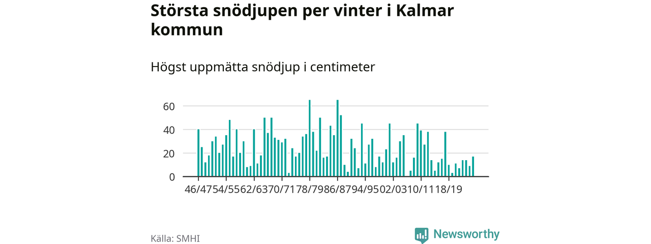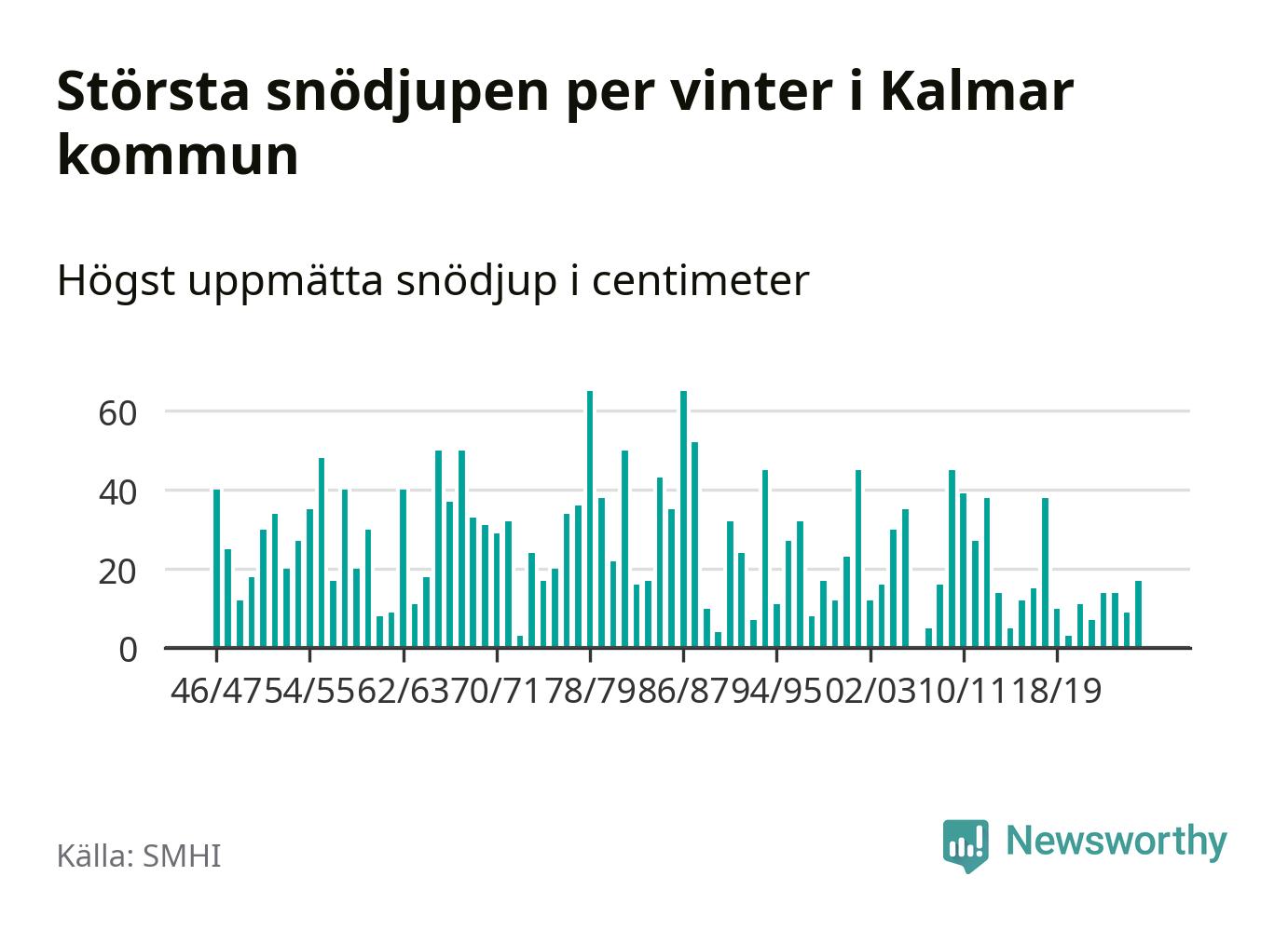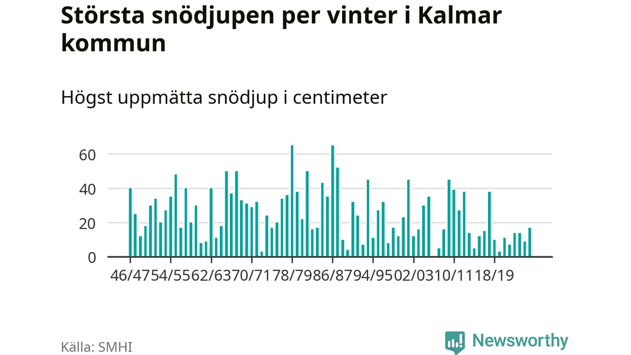 Men hur står sig det snödjupet historiskt sett? Newsworthy har tittat på det största snödjup som SMHI har uppmätt i Kalmar kommun varje år sedan vintern 1946/47 – och hittills tar sig årets vinter inte in bland de 25 vintrarna med störst uppmätt snödjup i kommunen.