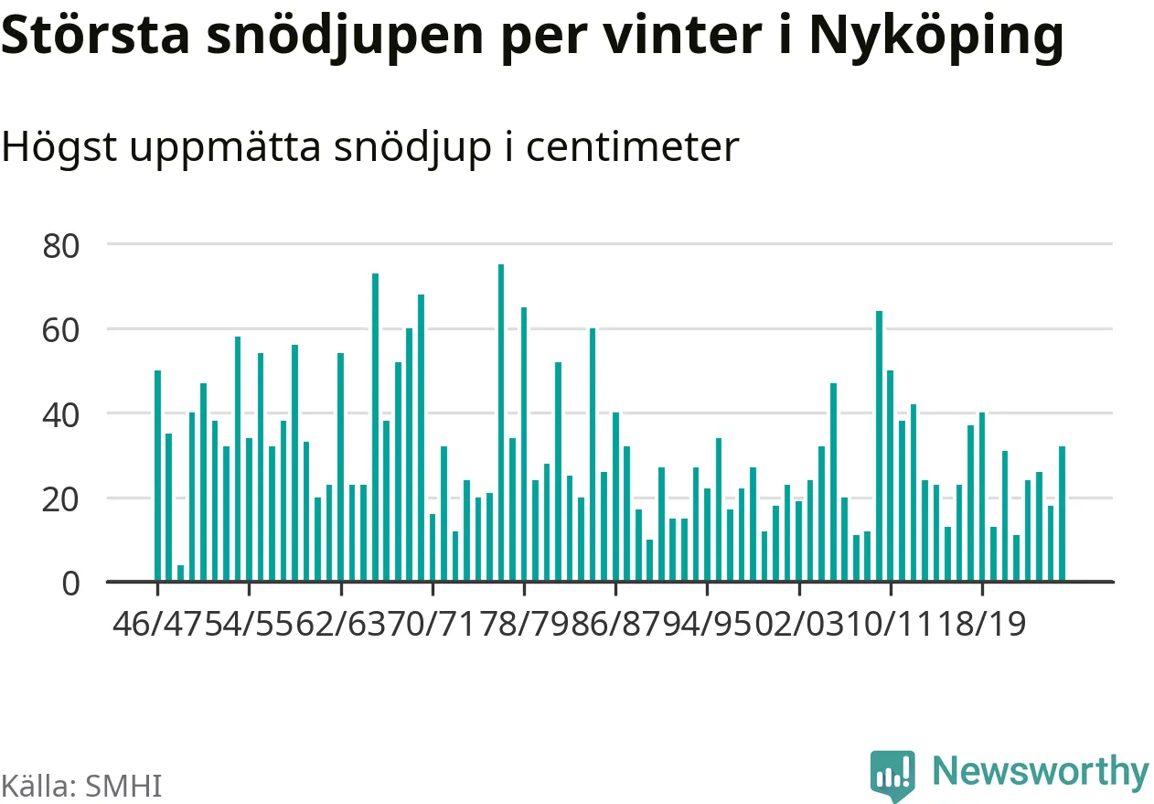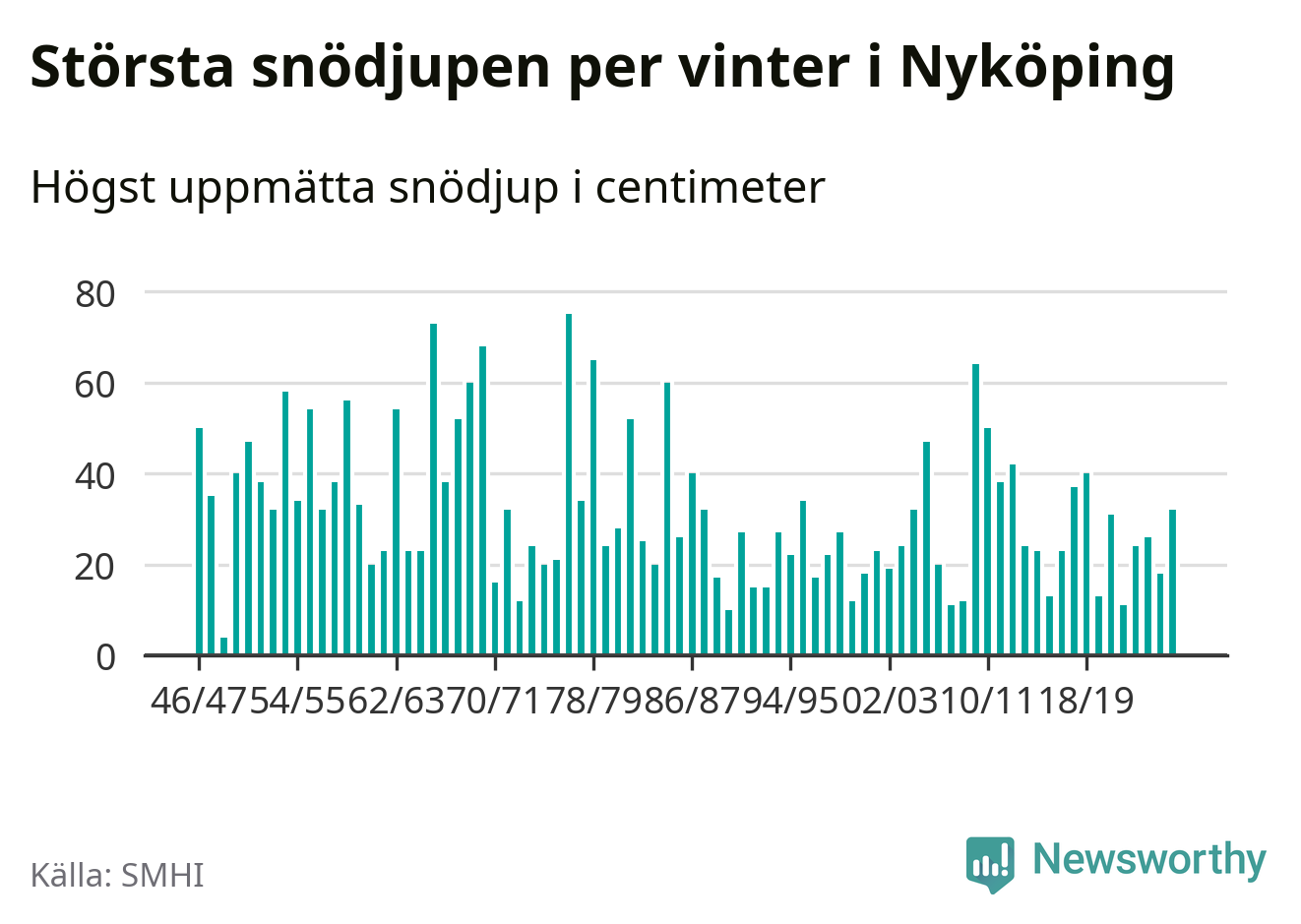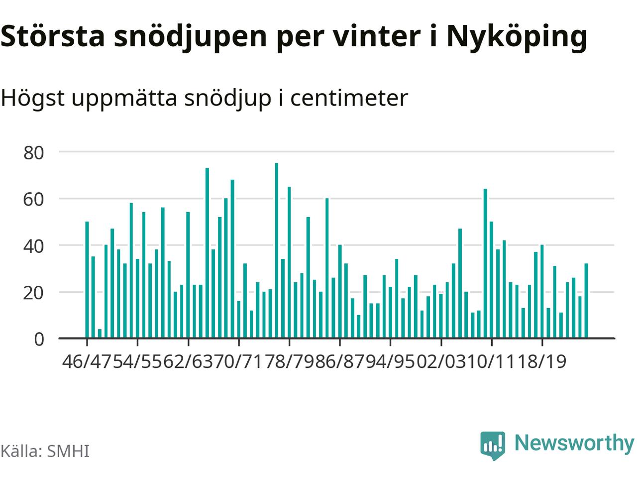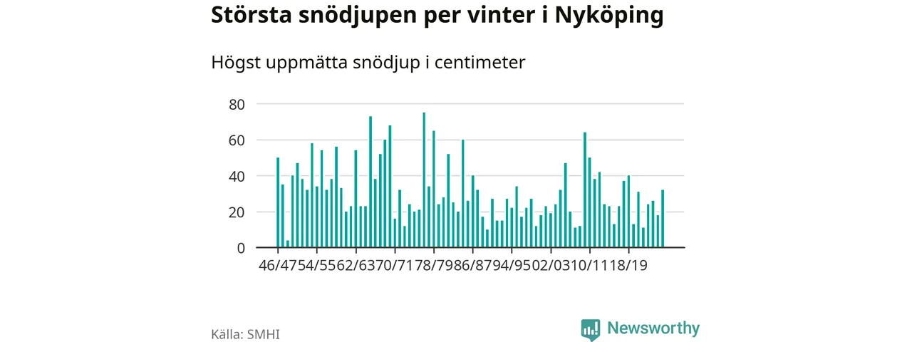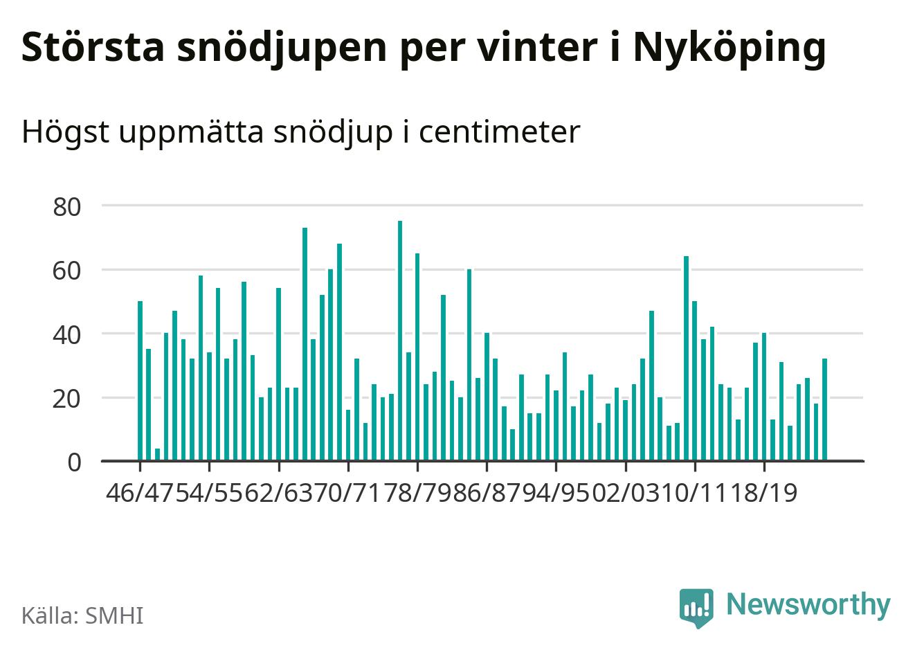 Men hur står sig det snödjupet historiskt sett? Newsworthy har tittat på det största snödjup som SMHI har uppmätt i Nyköpings kommun varje år sedan vintern 1946/47 – och hittills tar sig årets vinter inte in bland de 25 vintrarna med störst uppmätt snödjup i kommunen.