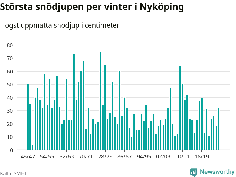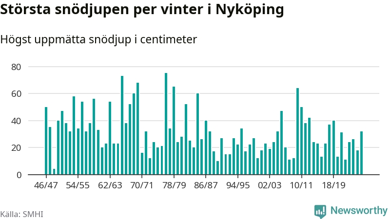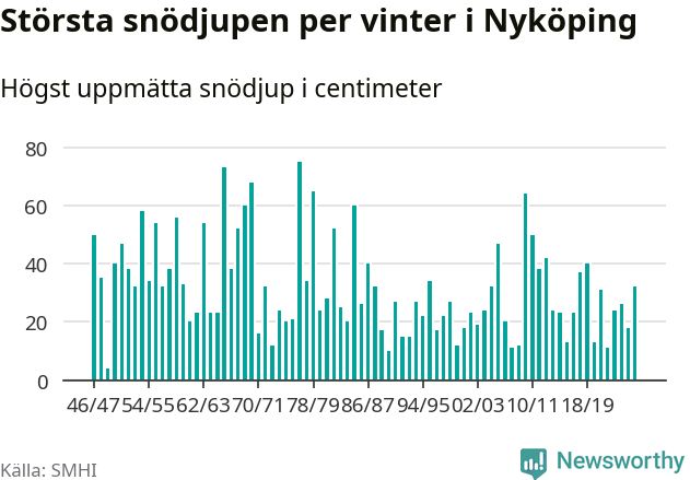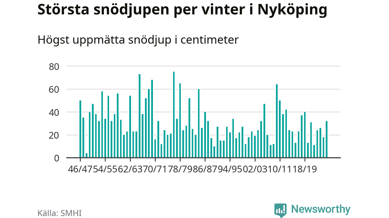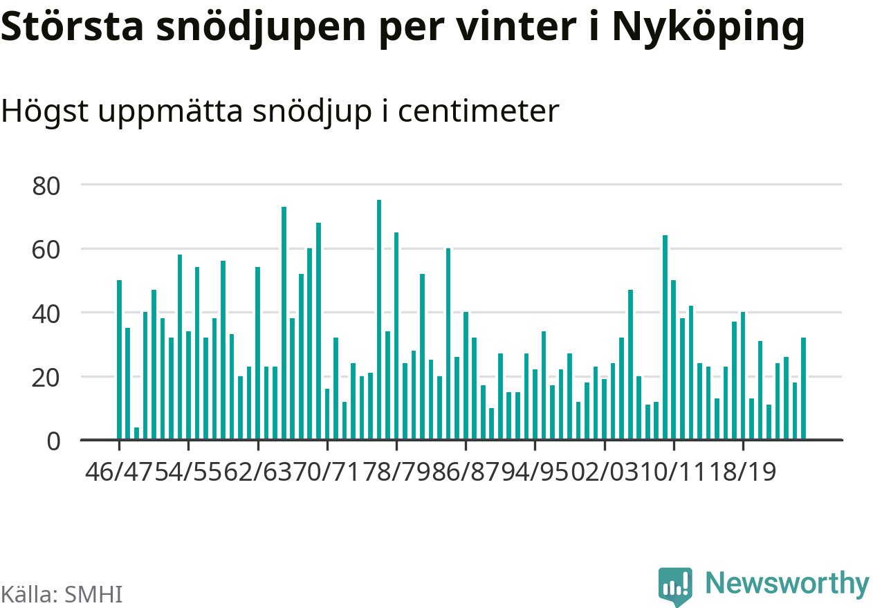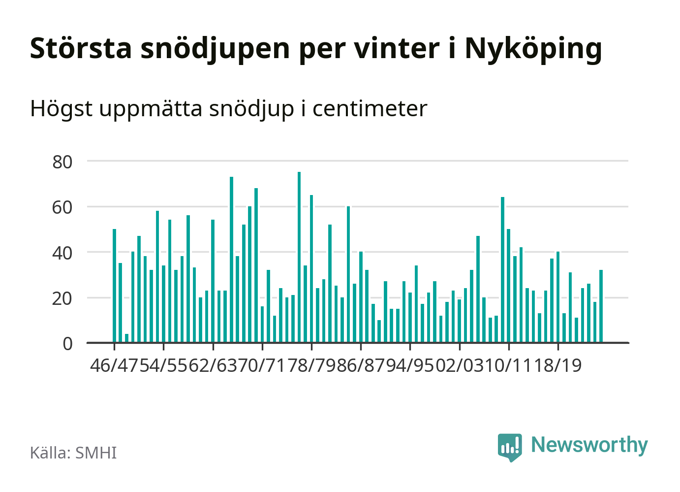 Men hur står sig det snödjupet historiskt sett? Newsworthy har tittat på det största snödjup som SMHI har uppmätt i Nyköpings kommun varje år sedan vintern 1946/47 – och hittills tar sig årets vinter inte in bland de 25 vintrarna med störst uppmätt snödjup i kommunen.