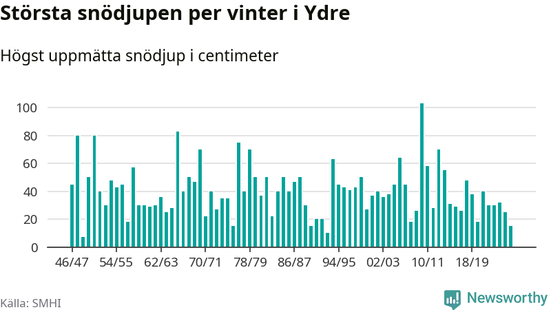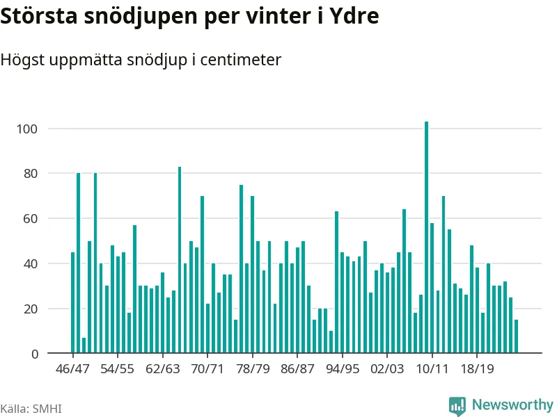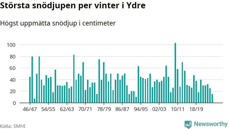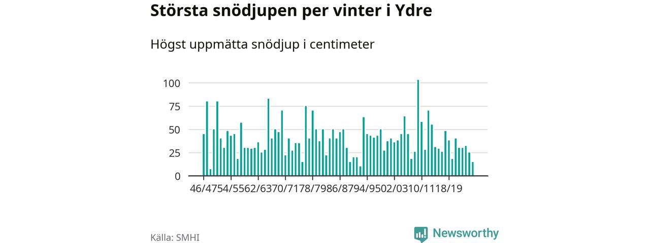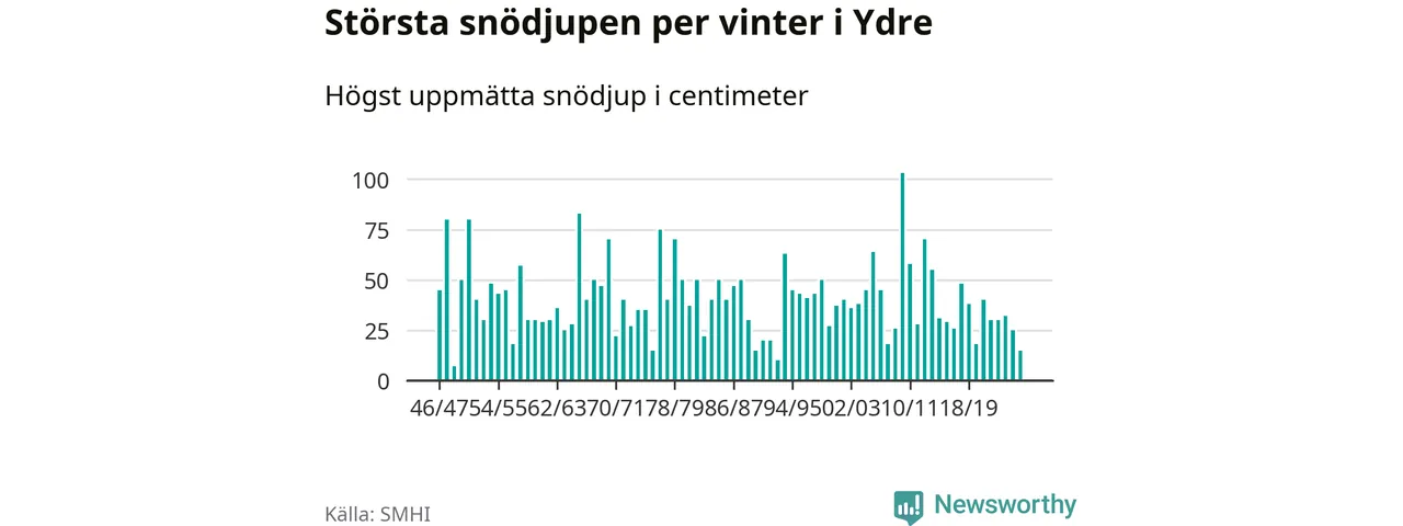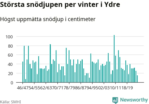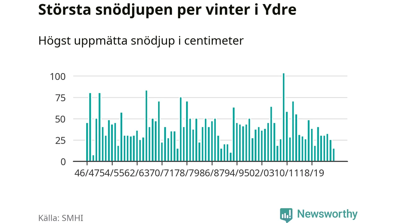 Men hur står sig det snödjupet historiskt sett? Newsworthy har tittat på det största snödjup som SMHI har uppmätt i Ydre kommun varje år sedan vintern 1946/47 – och hittills tar sig årets vinter inte in bland de 25 vintrarna med störst uppmätt snödjup i kommunen.