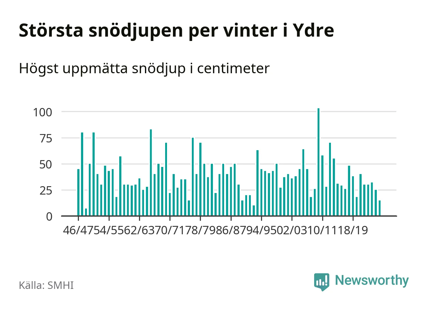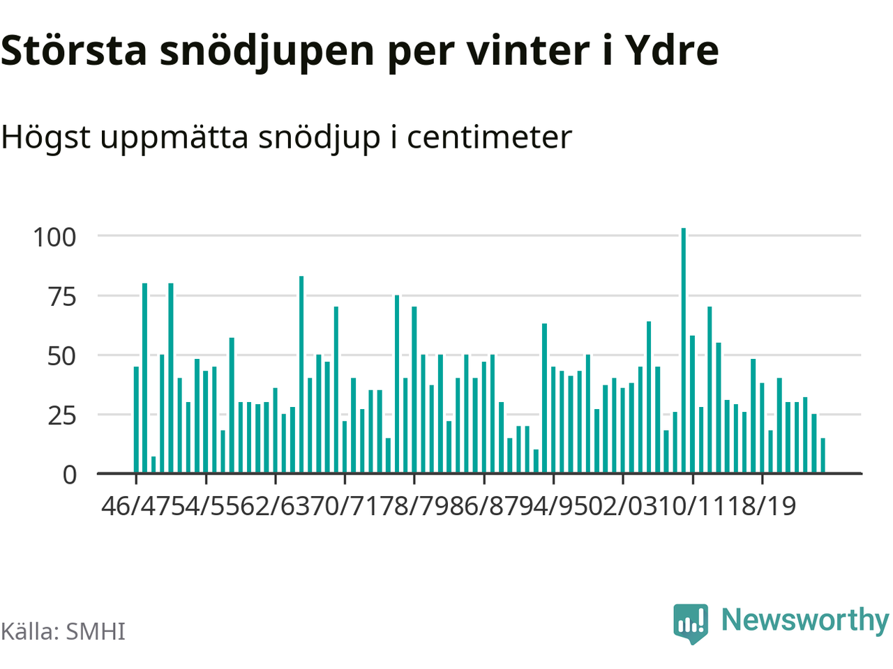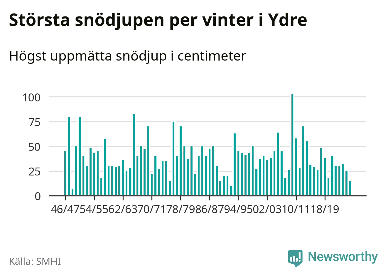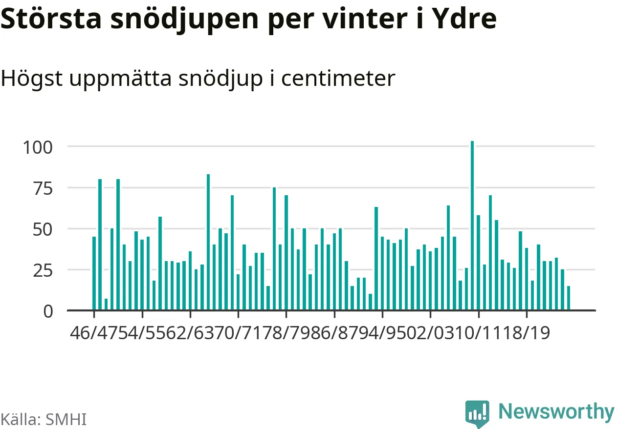 Men hur står sig det snödjupet historiskt sett? Newsworthy har tittat på det största snödjup som SMHI har uppmätt i Ydre kommun varje år sedan vintern 1946/47 – och hittills tar sig årets vinter inte in bland de 25 vintrarna med störst uppmätt snödjup i kommunen.