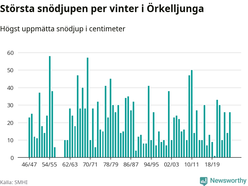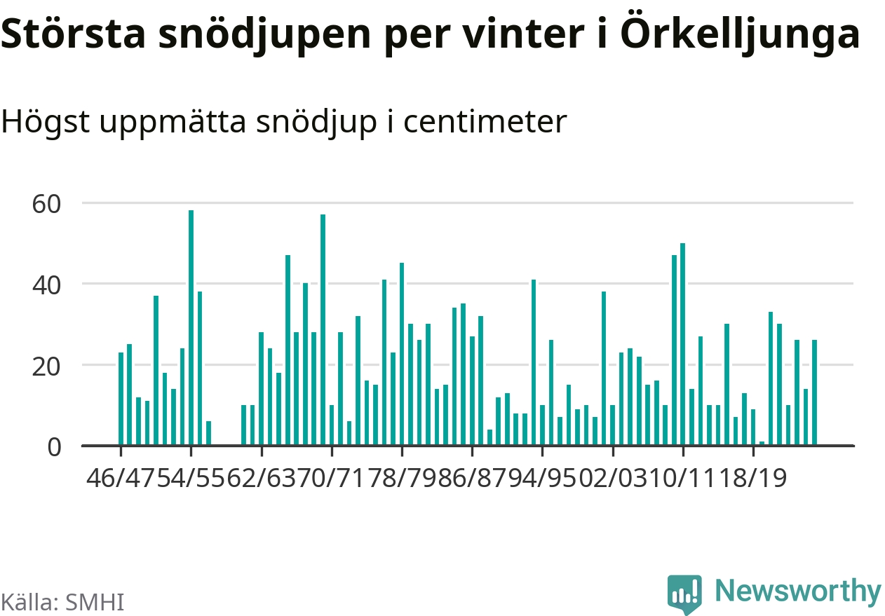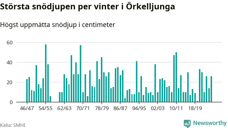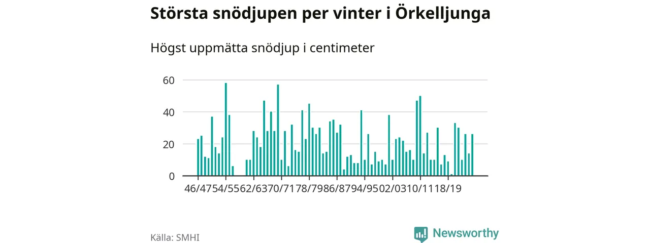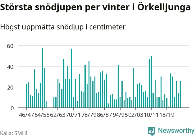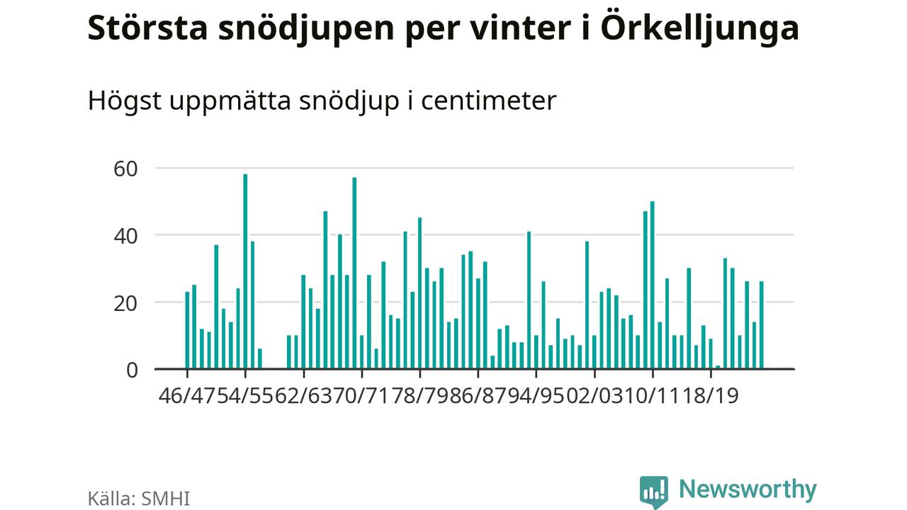 Men hur står sig det snödjupet historiskt sett? Newsworthy har tittat på det största snödjup som SMHI har uppmätt i Örkelljunga kommun varje år sedan vintern 1946/47 – och hittills tar sig årets vinter inte in bland de 25 vintrarna med störst uppmätt snödjup i kommunen. Det ska sägas att det inte finns några noteringar för åren 1958–1960.