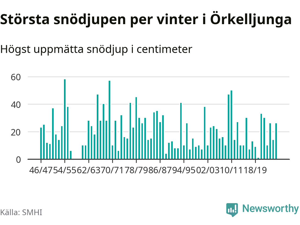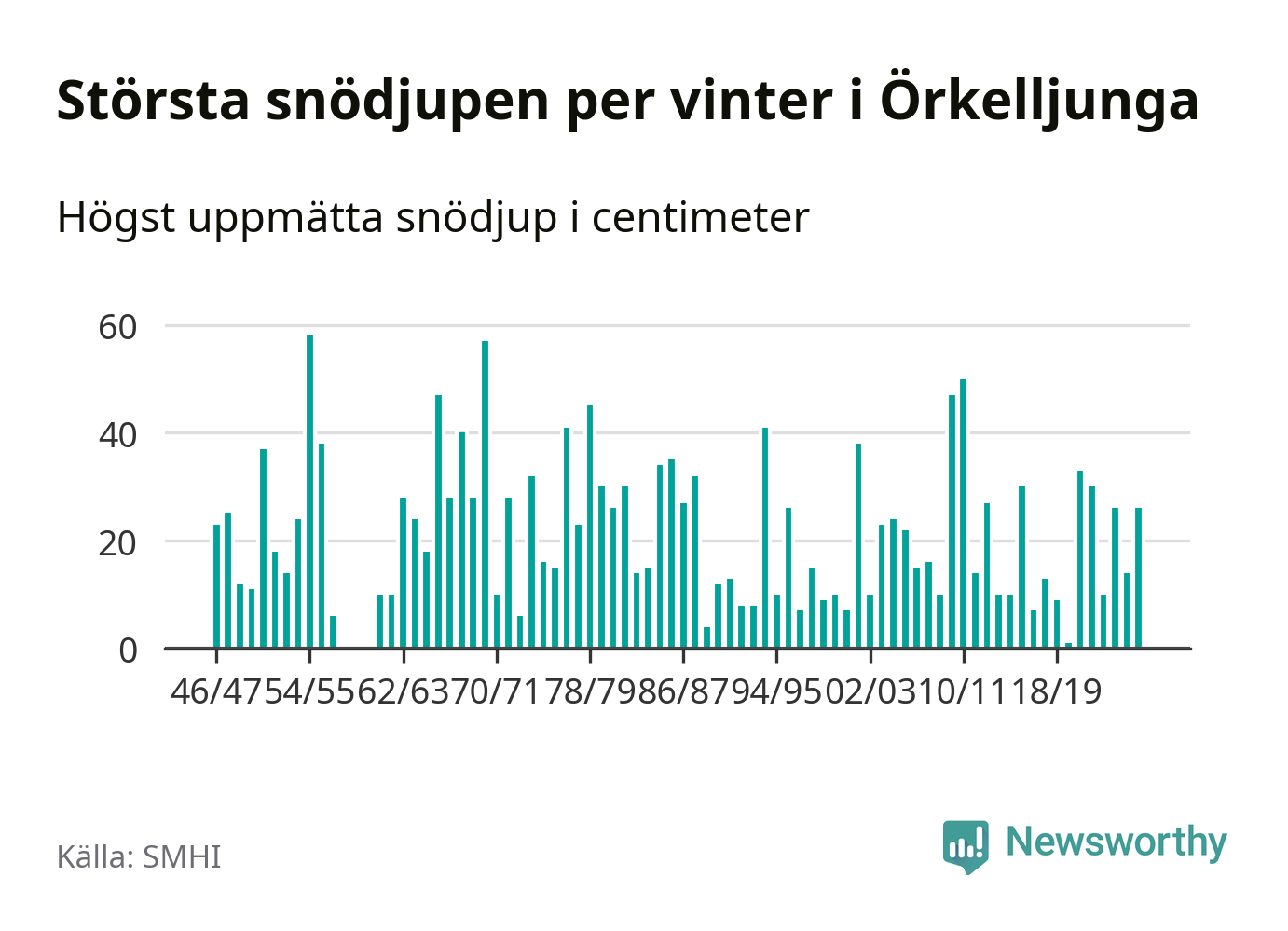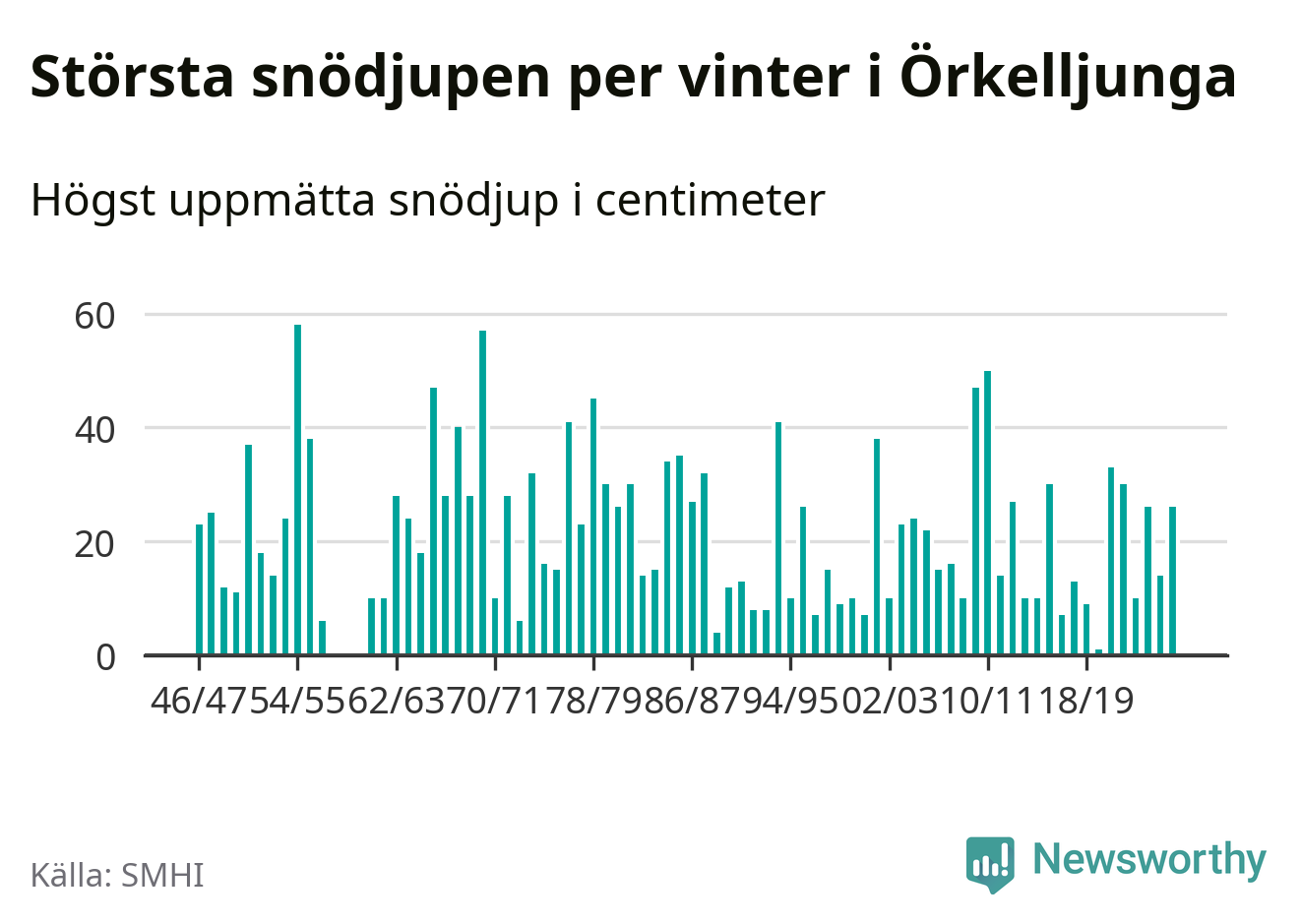 Men hur står sig det snödjupet historiskt sett? Newsworthy har tittat på det största snödjup som SMHI har uppmätt i Örkelljunga kommun varje år sedan vintern 1946/47 – och hittills tar sig årets vinter inte in bland de 25 vintrarna med störst uppmätt snödjup i kommunen. Det ska sägas att det inte finns några noteringar för åren 1958–1960.