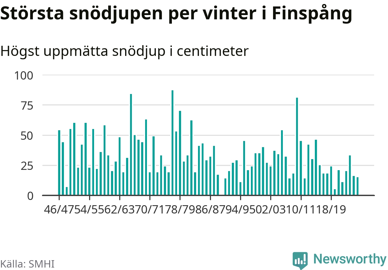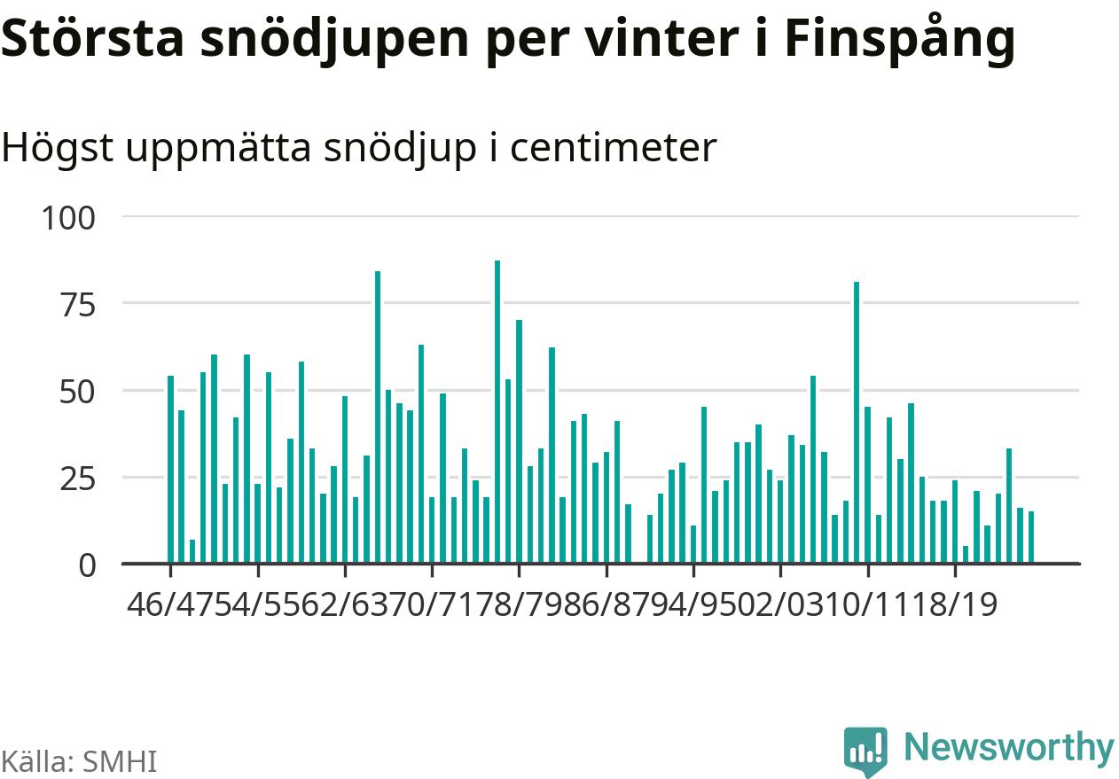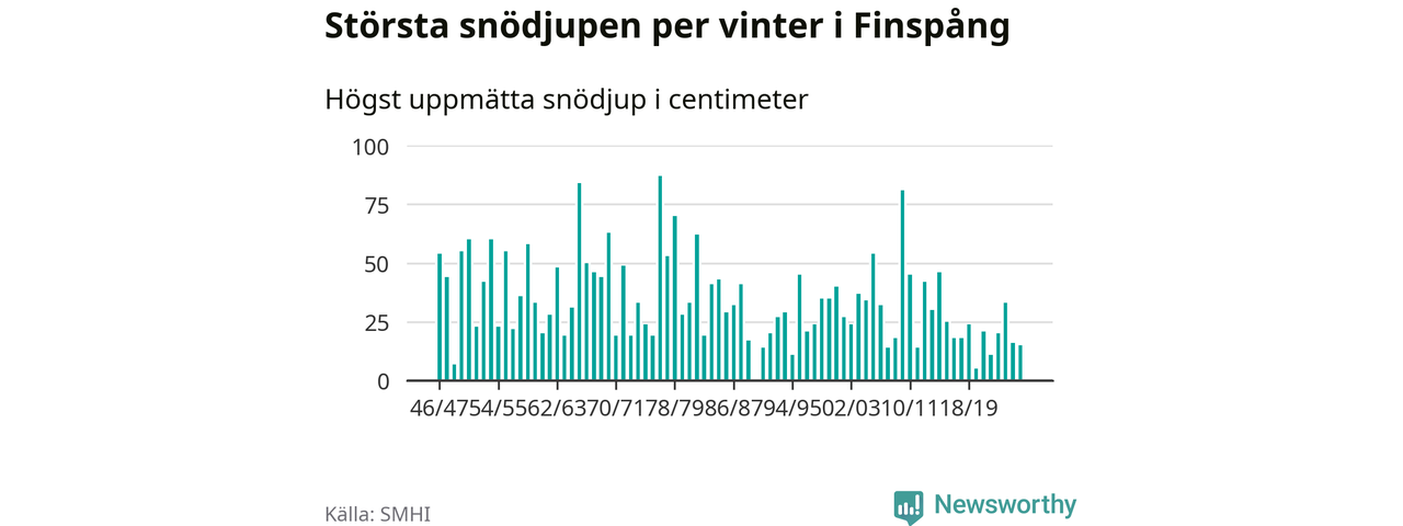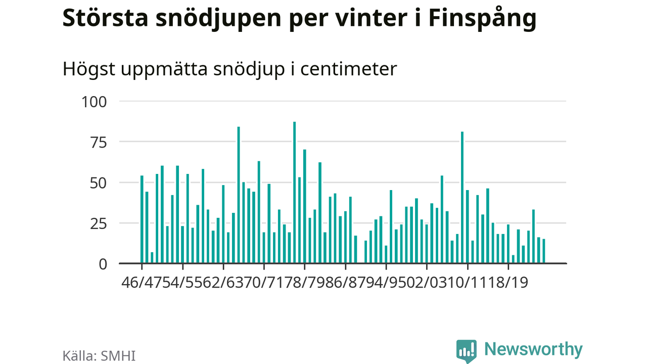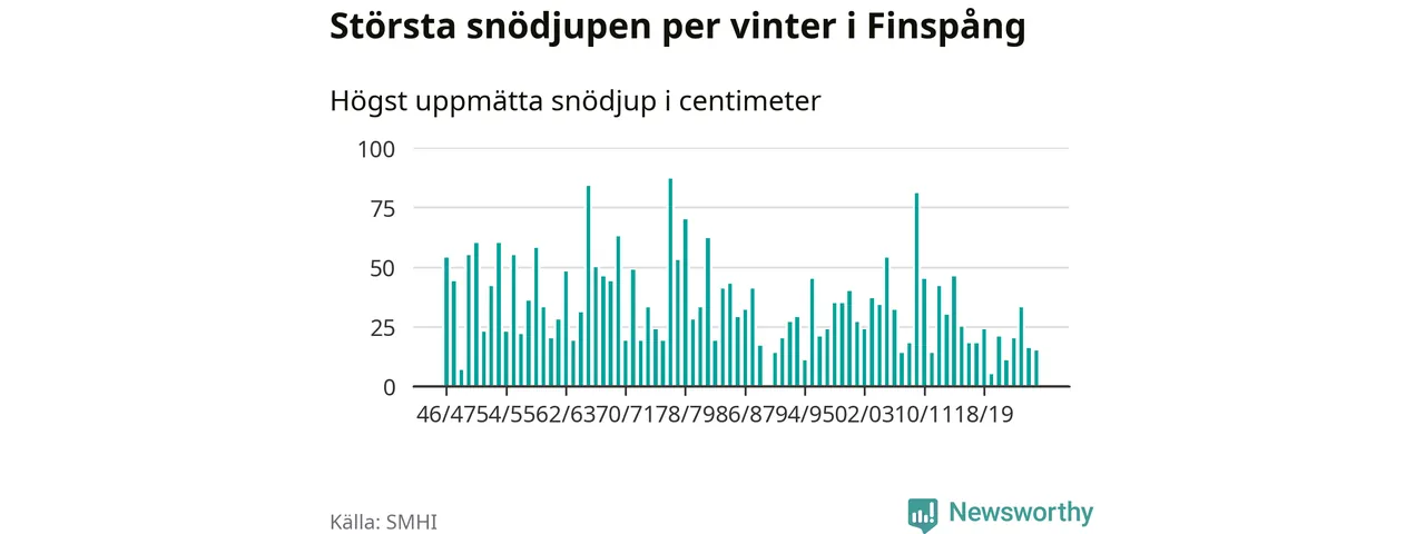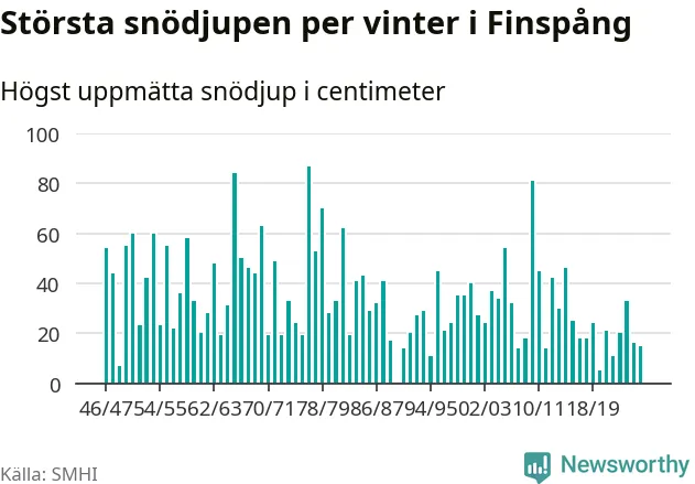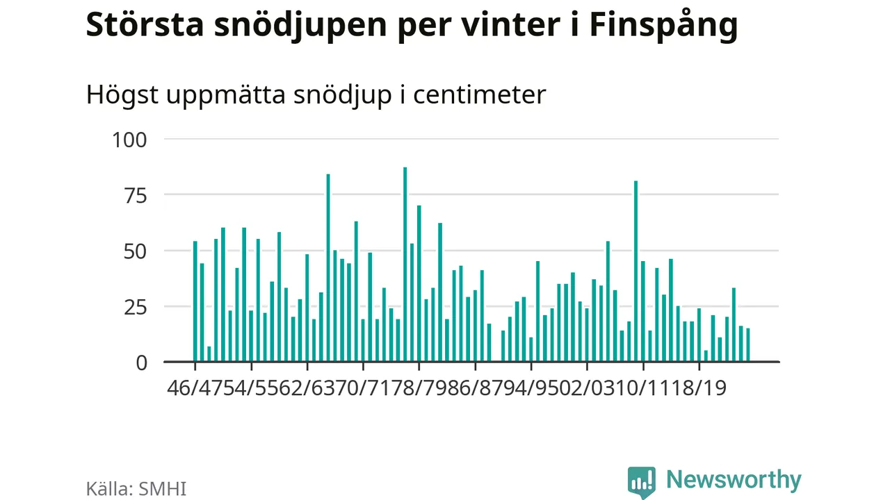 Men hur står sig det snödjupet historiskt sett? Newsworthy har tittat på det största snödjup som SMHI har uppmätt i Finspångs kommun varje år sedan vintern 1946/47 – och hittills tar sig årets vinter inte in bland de 25 vintrarna med störst uppmätt snödjup i kommunen. Det ska sägas att det inte finns någon notering för 1990.