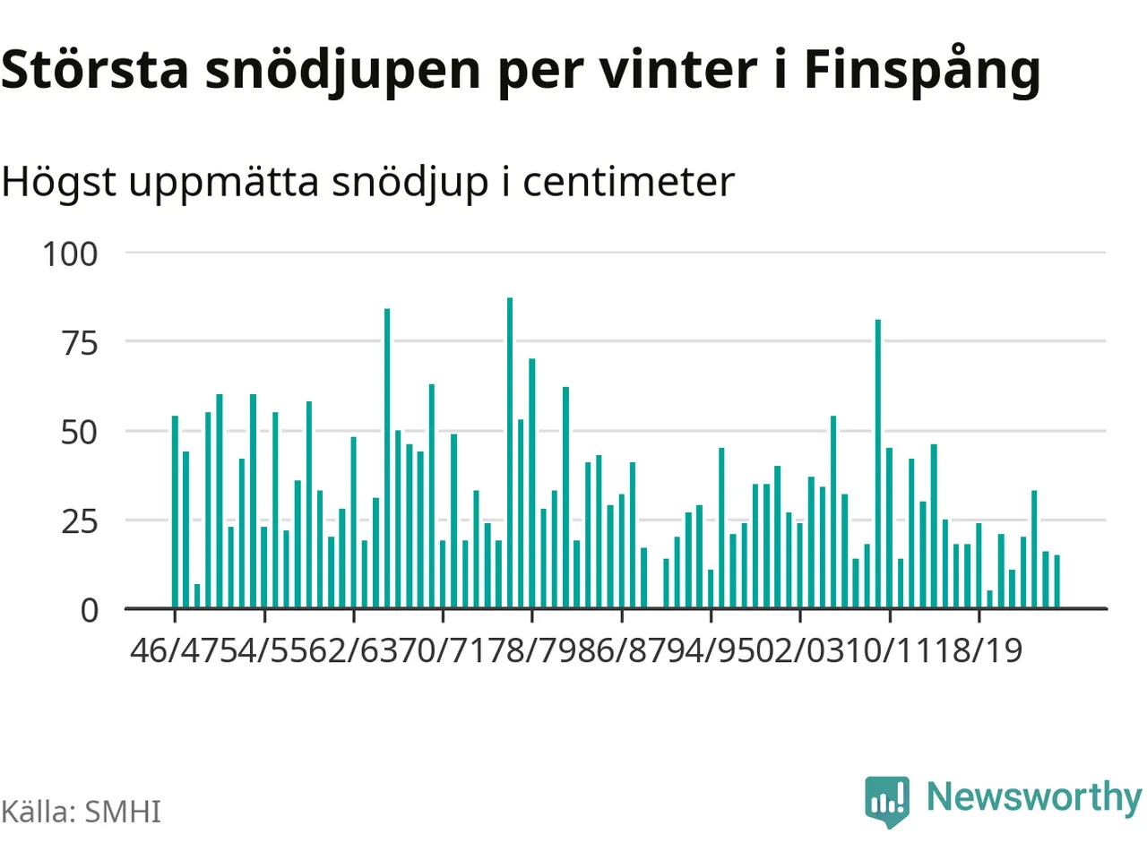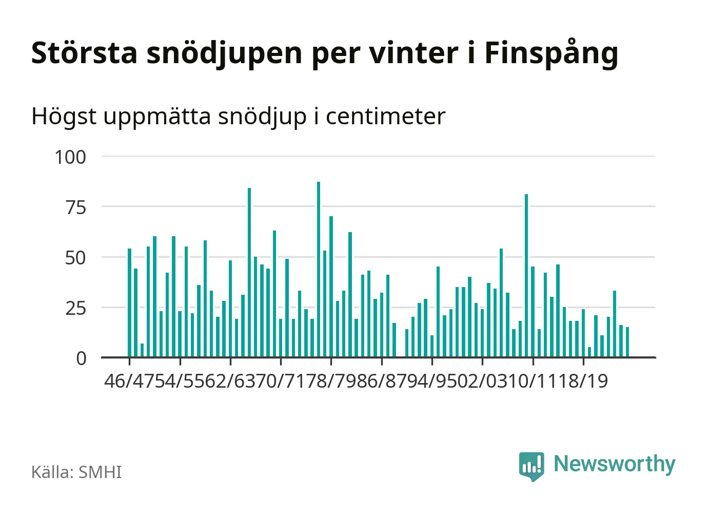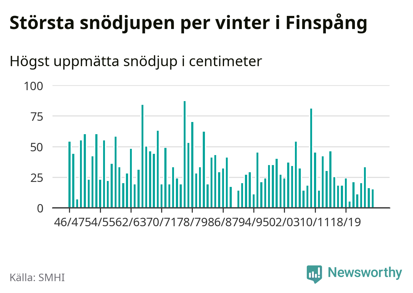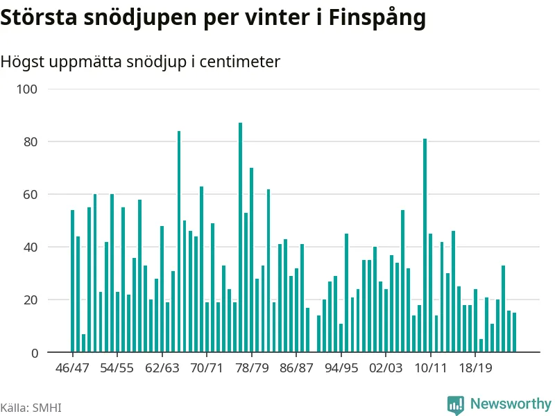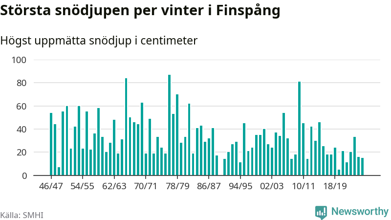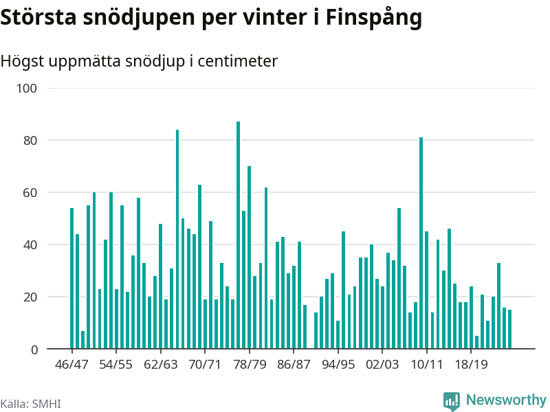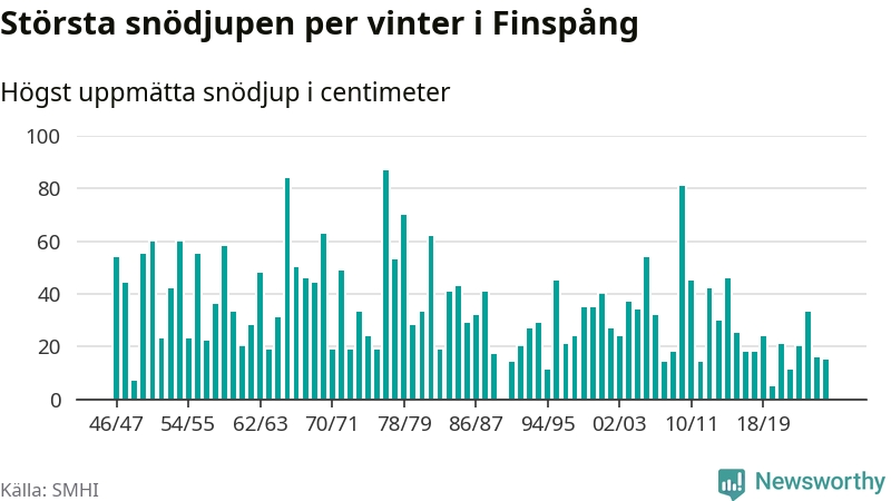 Men hur står sig det snödjupet historiskt sett? Newsworthy har tittat på det största snödjup som SMHI har uppmätt i Finspångs kommun varje år sedan vintern 1946/47 – och hittills tar sig årets vinter inte in bland de 25 vintrarna med störst uppmätt snödjup i kommunen. Det ska sägas att det inte finns någon notering för 1990.