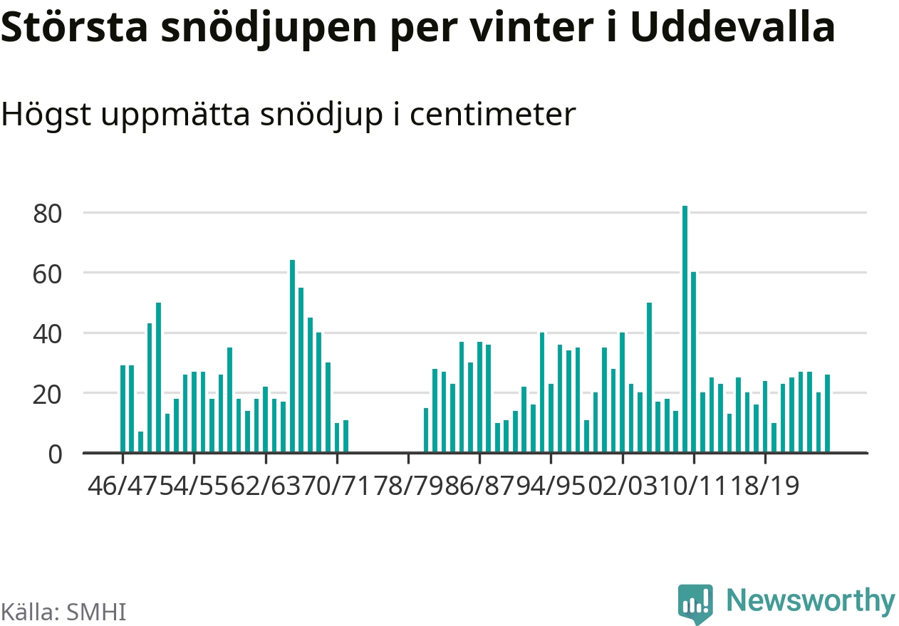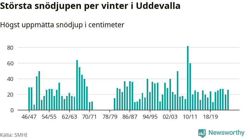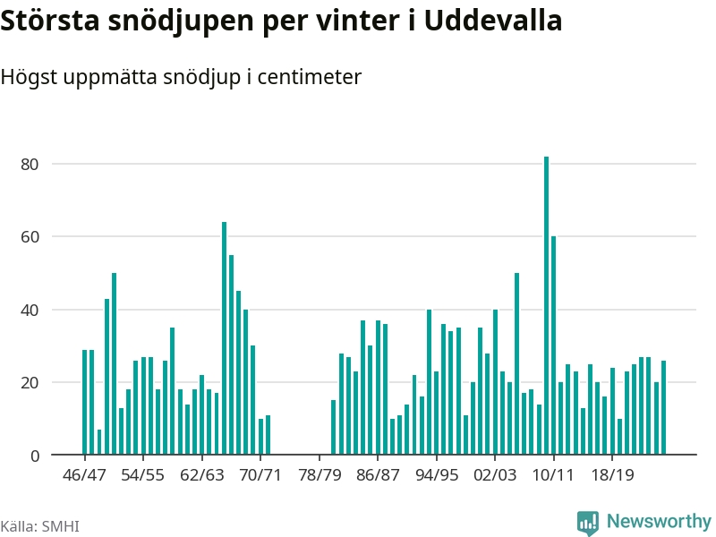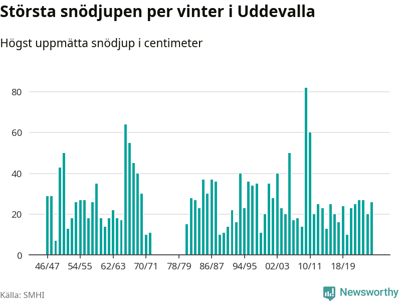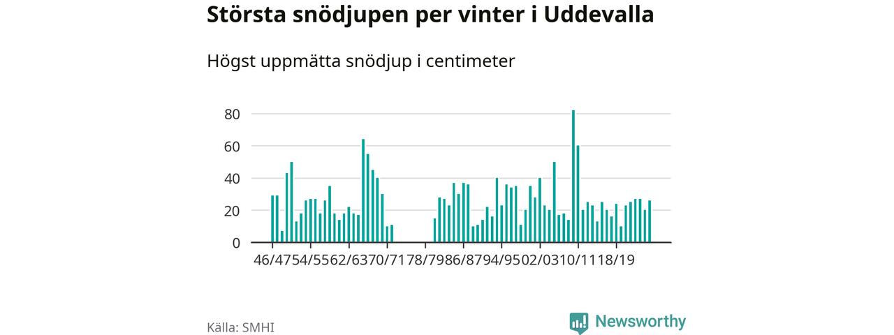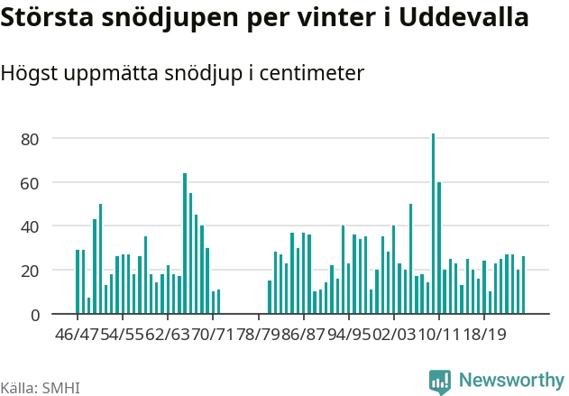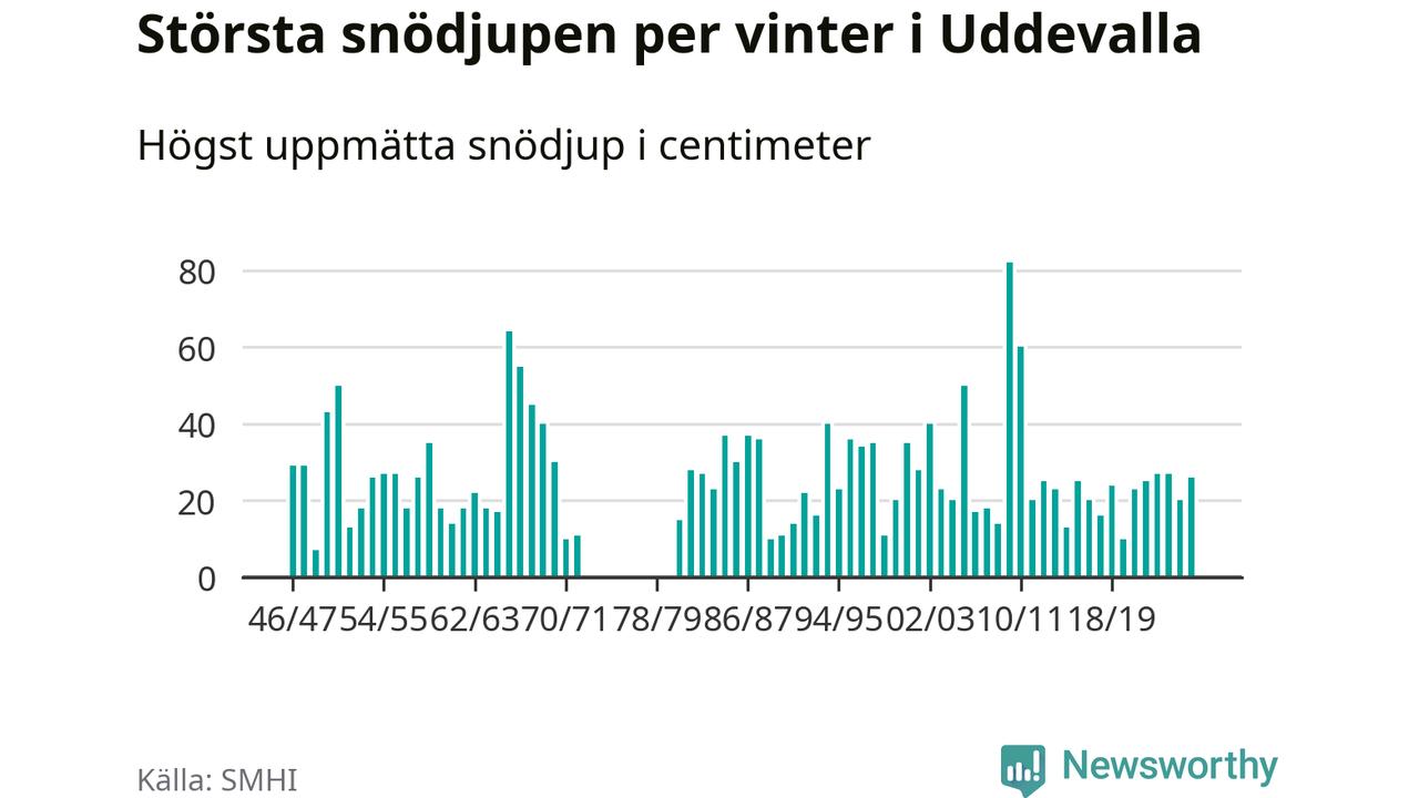 Men hur står sig det snödjupet historiskt sett? Newsworthy har tittat på det största snödjup som SMHI har uppmätt i Uddevalla kommun varje år sedan vintern 1946/47 – och hittills tar sig årets vinter inte in bland de 25 vintrarna med störst uppmätt snödjup i kommunen. Det ska sägas att det inte finns några noteringar för åren 1974–1980.