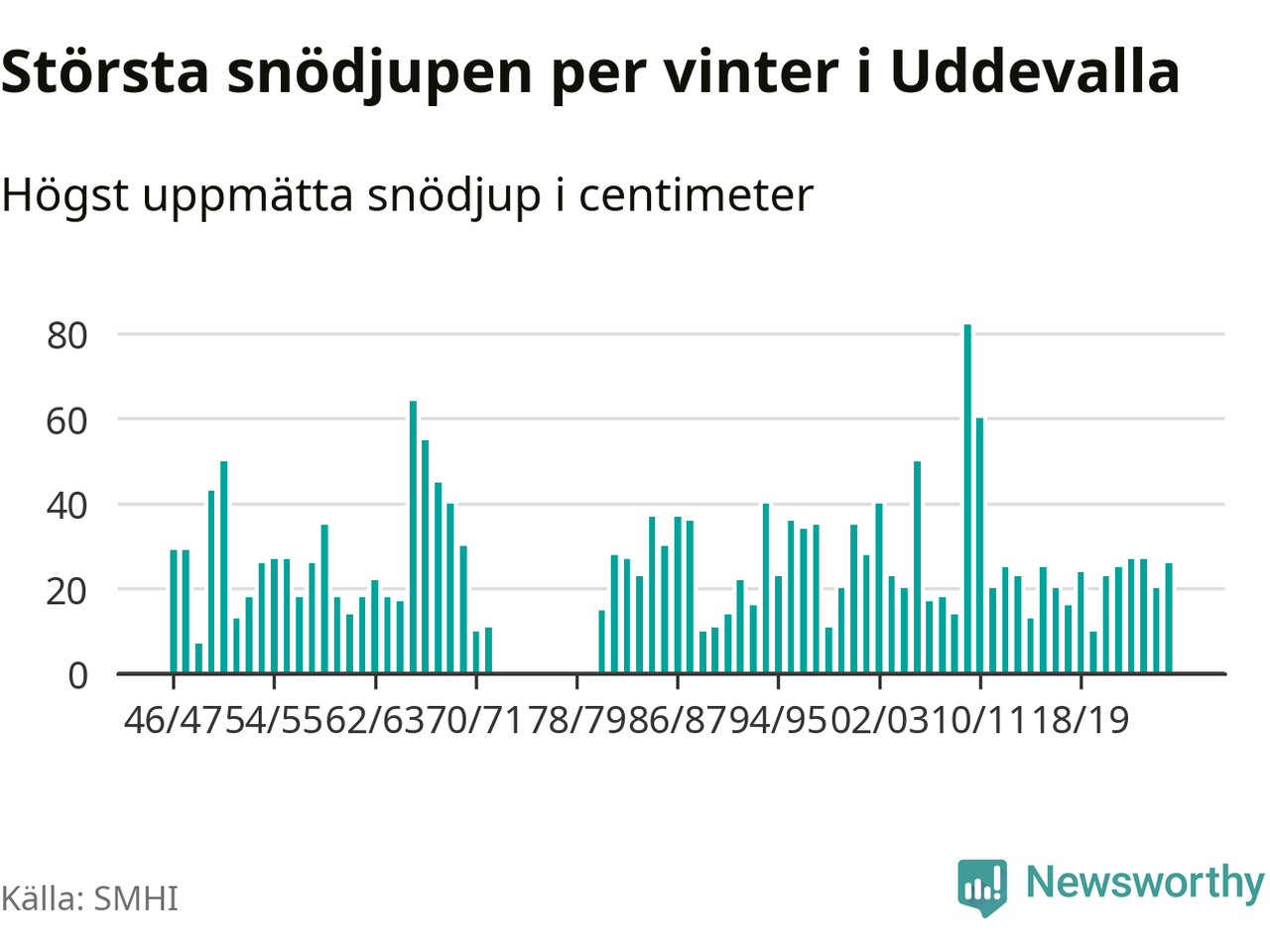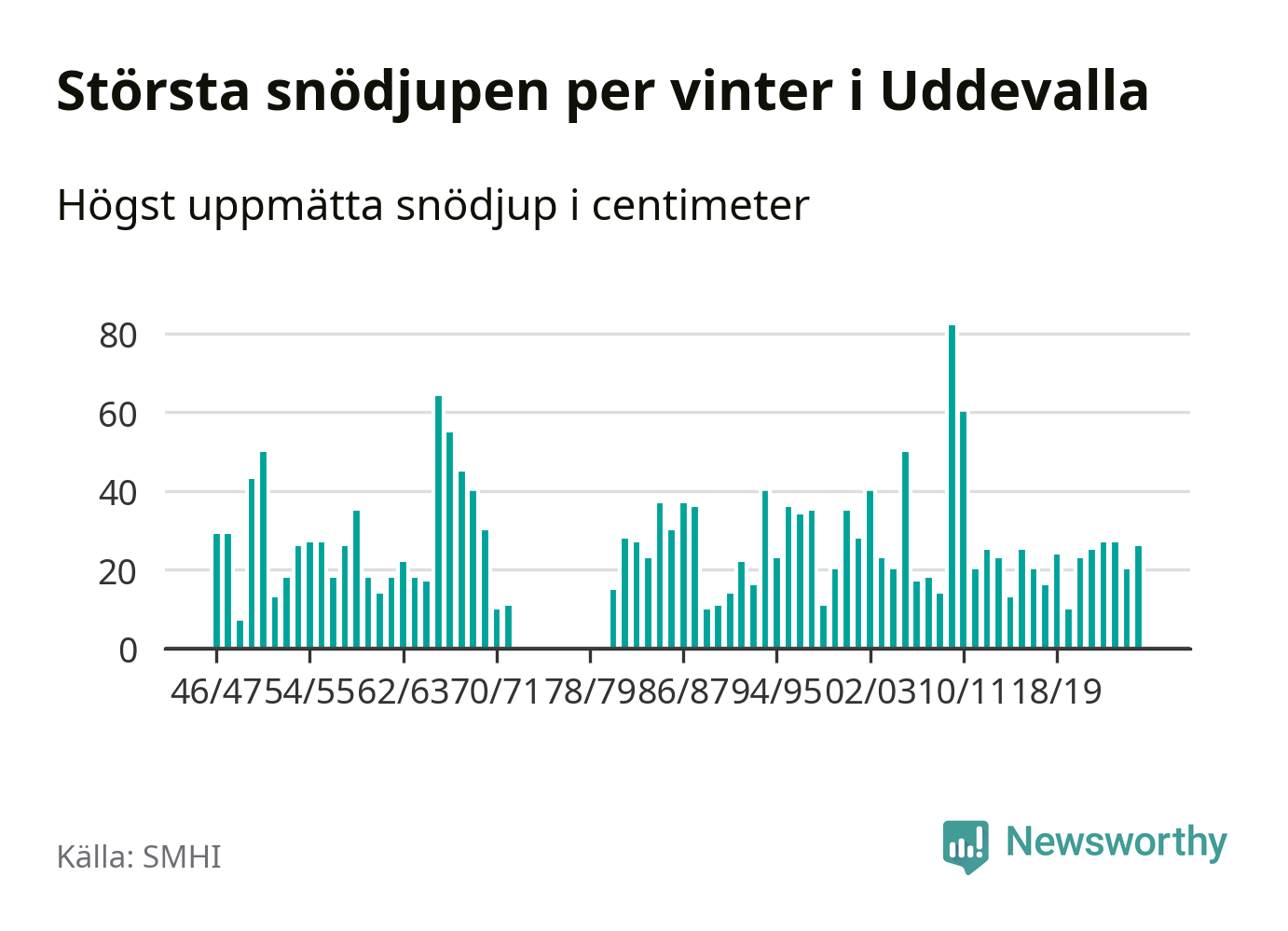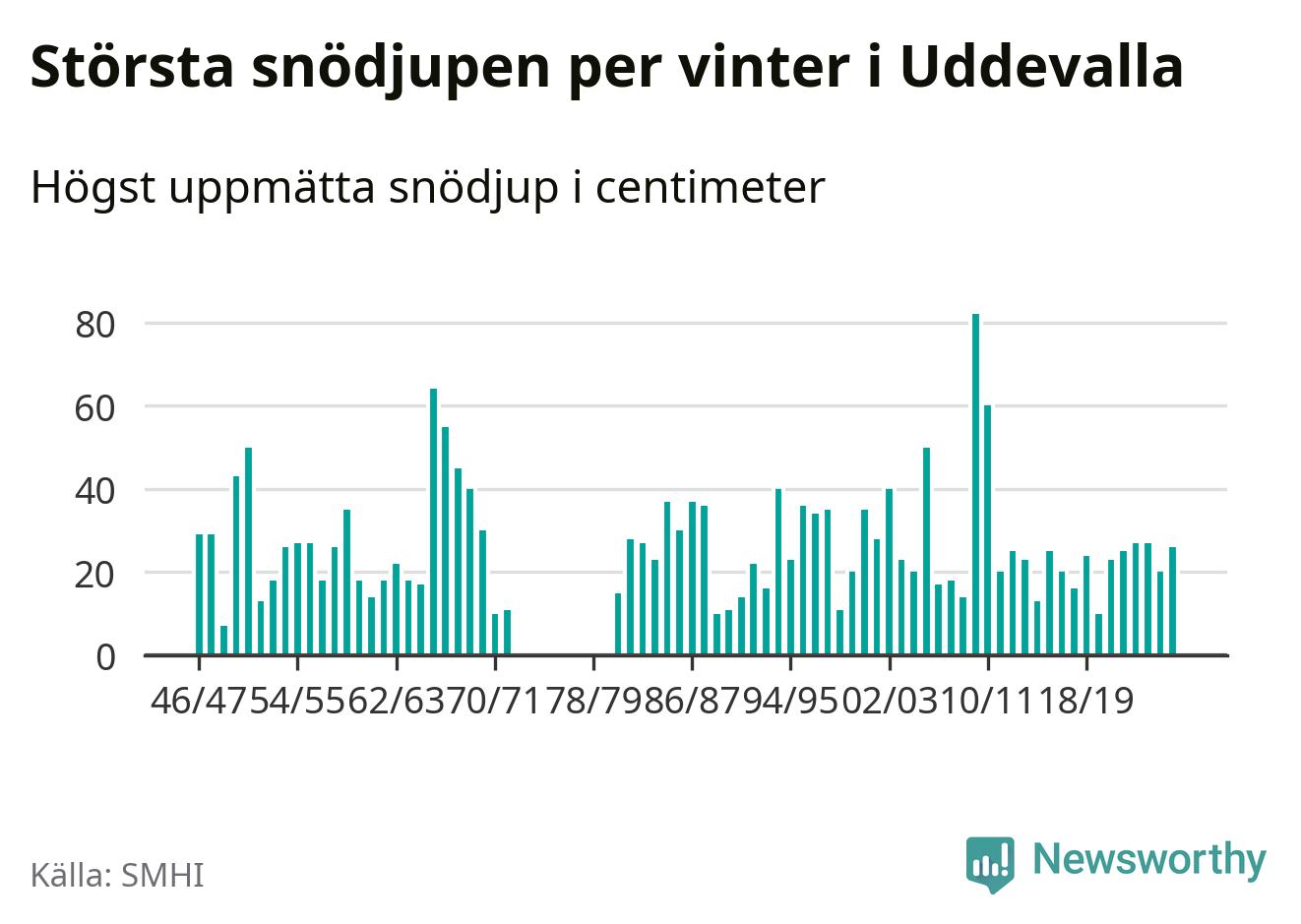 Men hur står sig det snödjupet historiskt sett? Newsworthy har tittat på det största snödjup som SMHI har uppmätt i Uddevalla kommun varje år sedan vintern 1946/47 – och hittills tar sig årets vinter inte in bland de 25 vintrarna med störst uppmätt snödjup i kommunen. Det ska sägas att det inte finns några noteringar för åren 1974–1980.