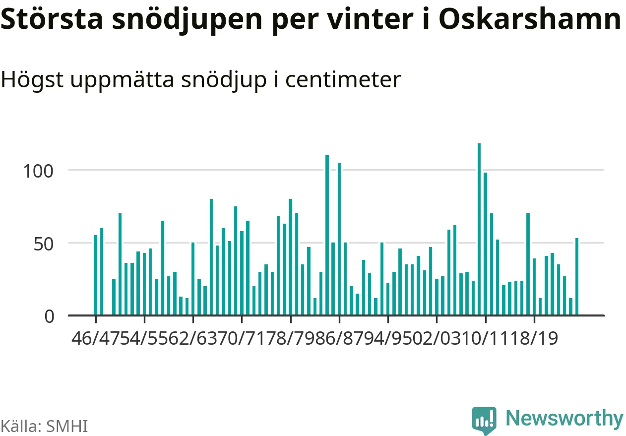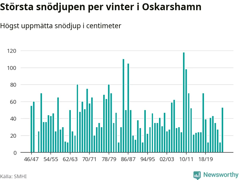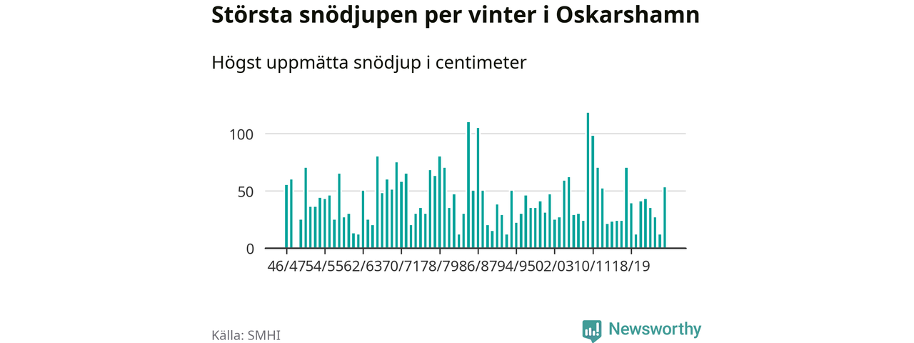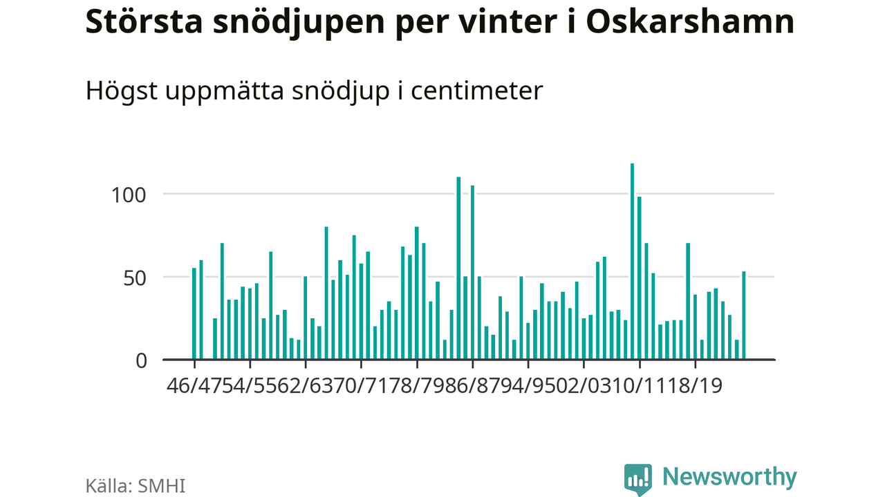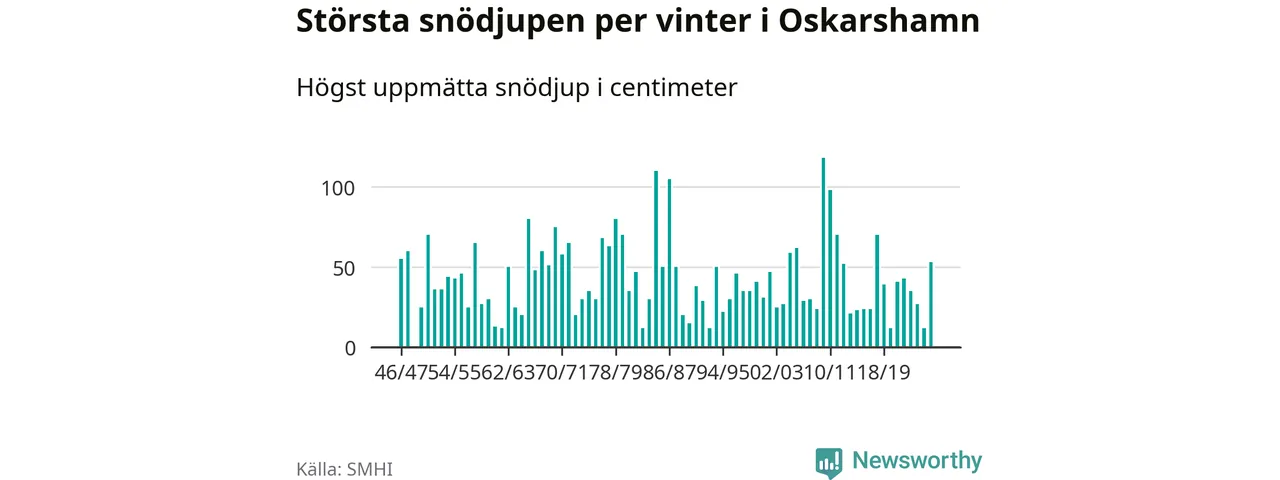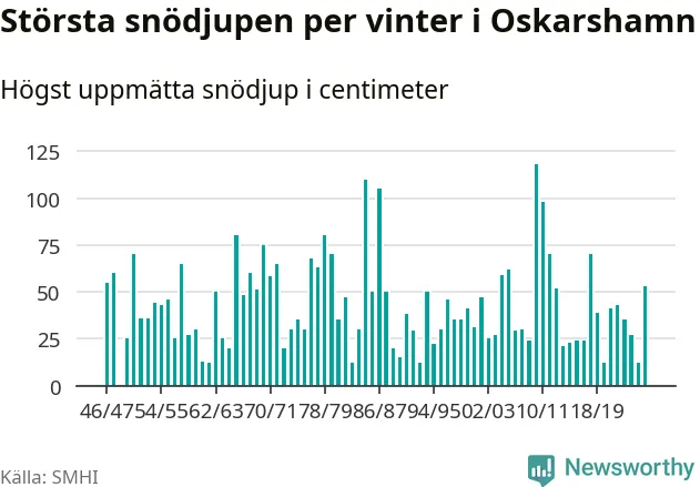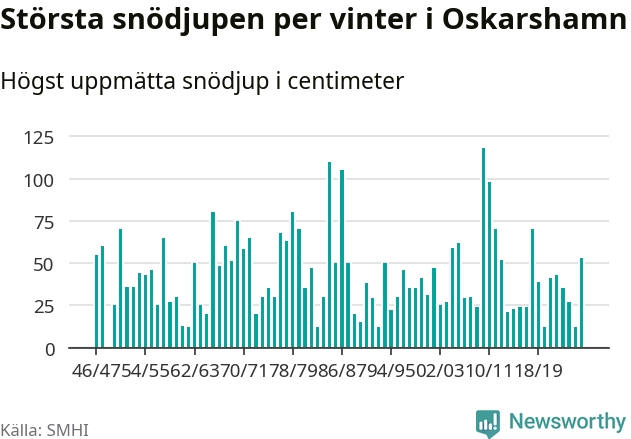 Men hur står sig det snödjupet historiskt sett? Newsworthy har tittat på det största snödjup som SMHI har uppmätt i Oskarshamns kommun varje år sedan vintern 1946/47. 21 vintrar har det uppmätts större snödjup.