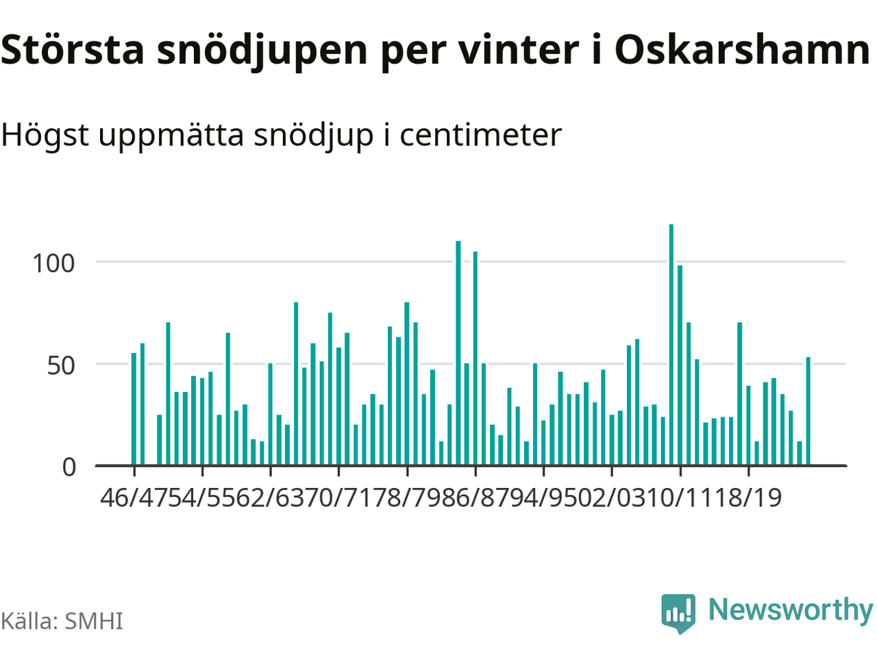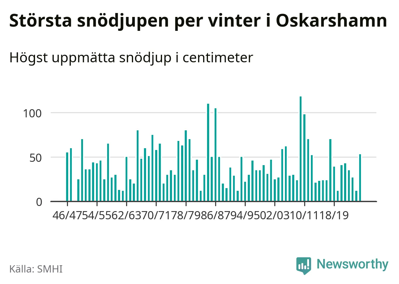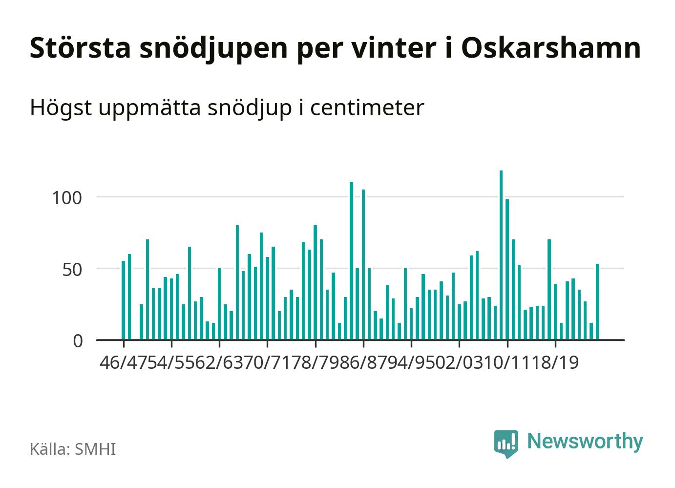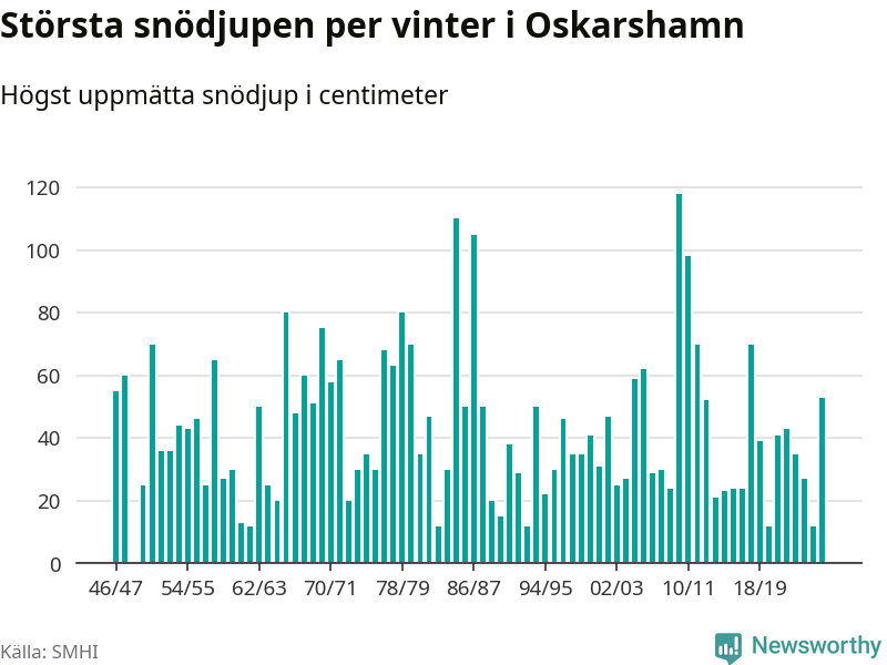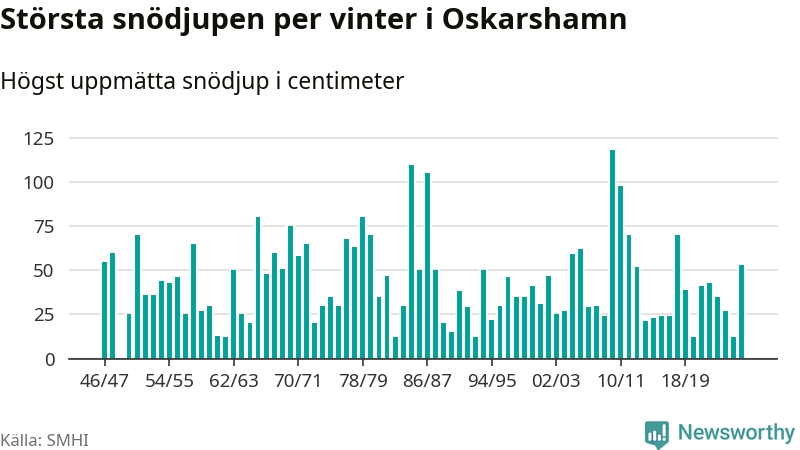 Men hur står sig det snödjupet historiskt sett? Newsworthy har tittat på det största snödjup som SMHI har uppmätt i Oskarshamns kommun varje år sedan vintern 1946/47. 21 vintrar har det uppmätts större snödjup.