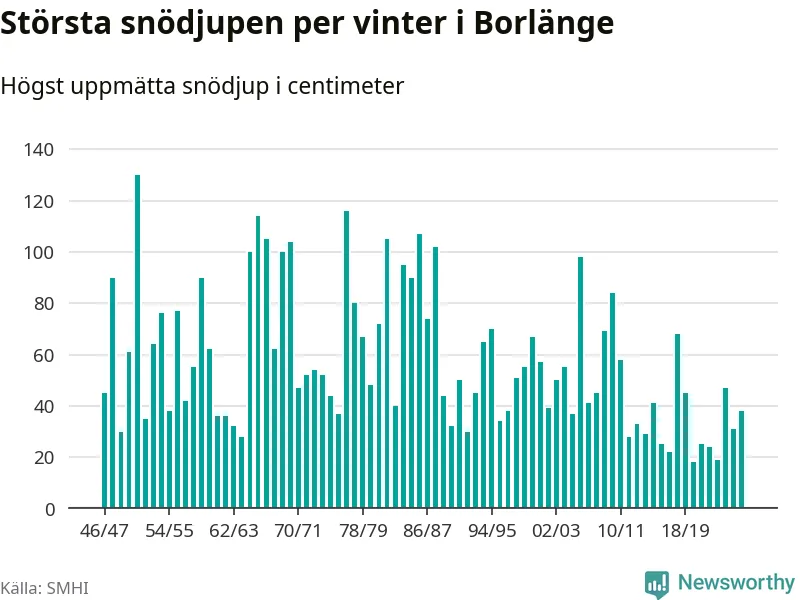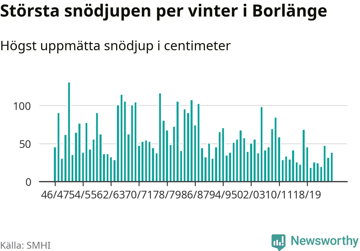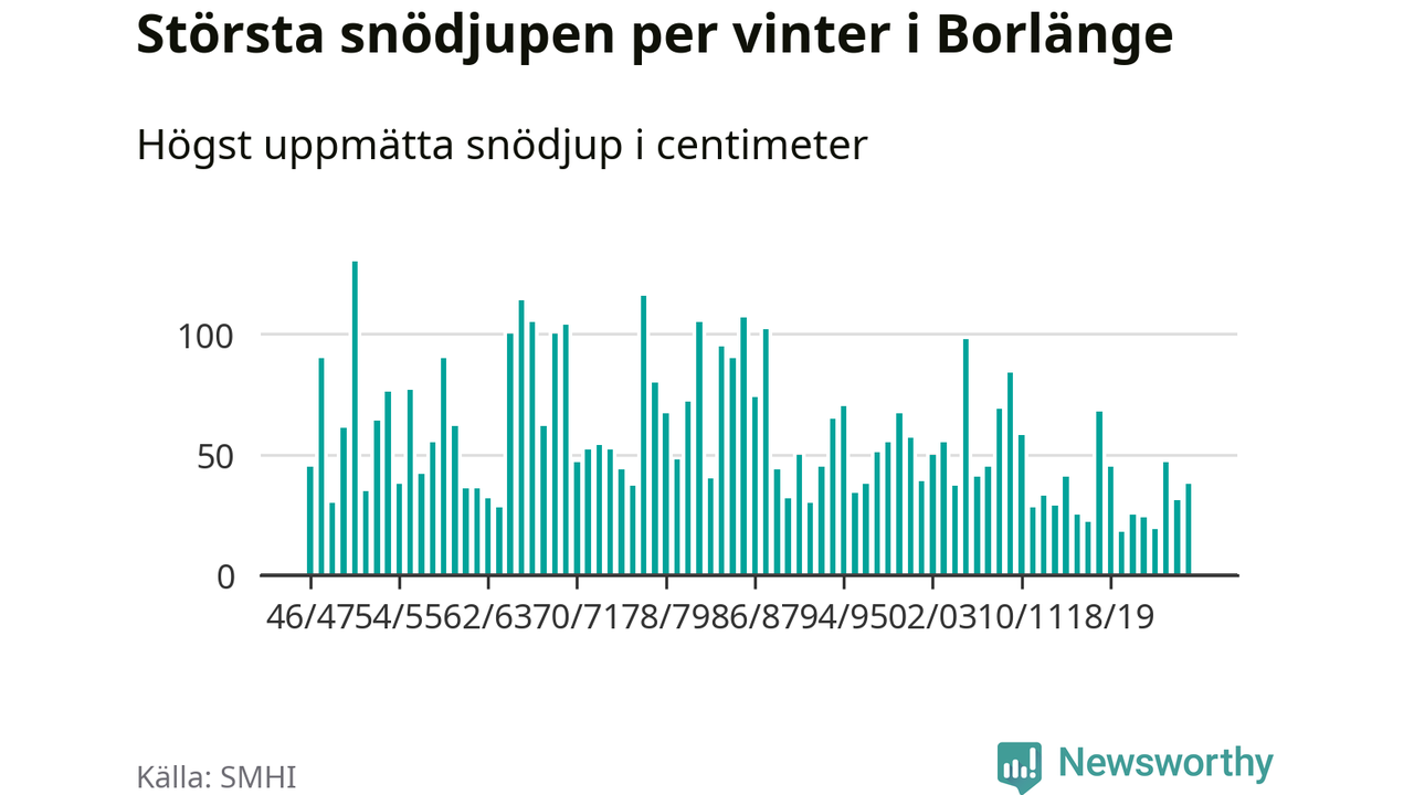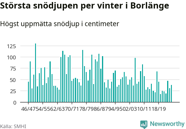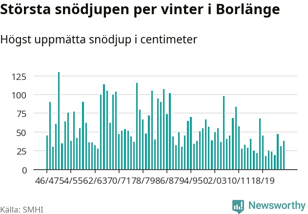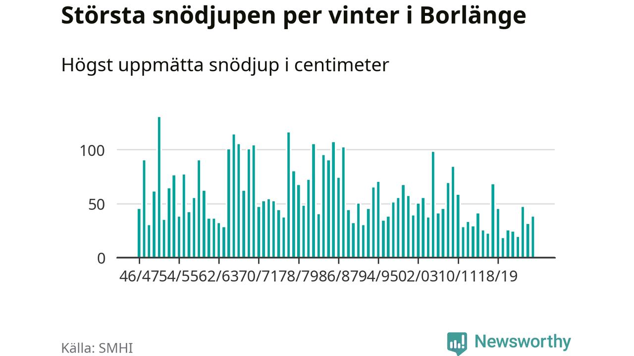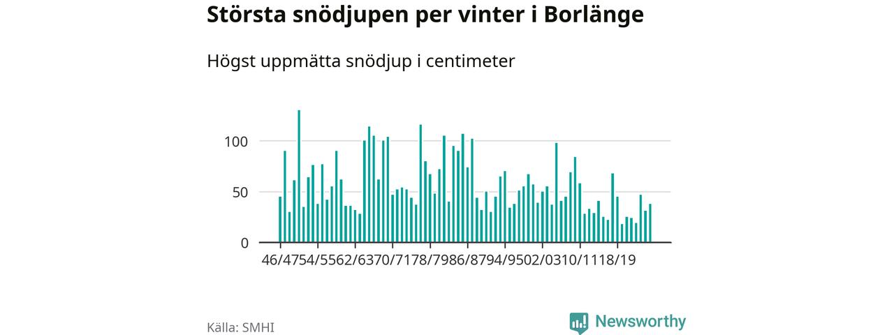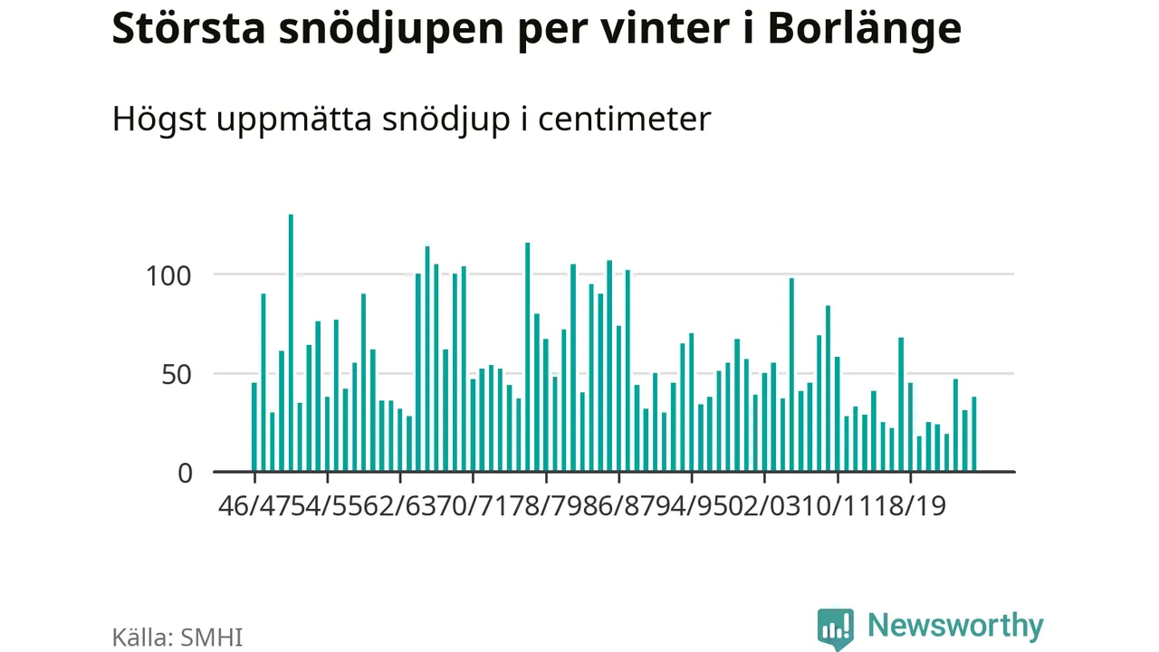 Men hur står sig det snödjupet historiskt sett? Newsworthy har tittat på det största snödjup som SMHI har uppmätt i Borlänge kommun varje år sedan vintern 1946/47 – och hittills tar sig årets vinter inte in bland de 25 vintrarna med störst uppmätt snödjup i kommunen.