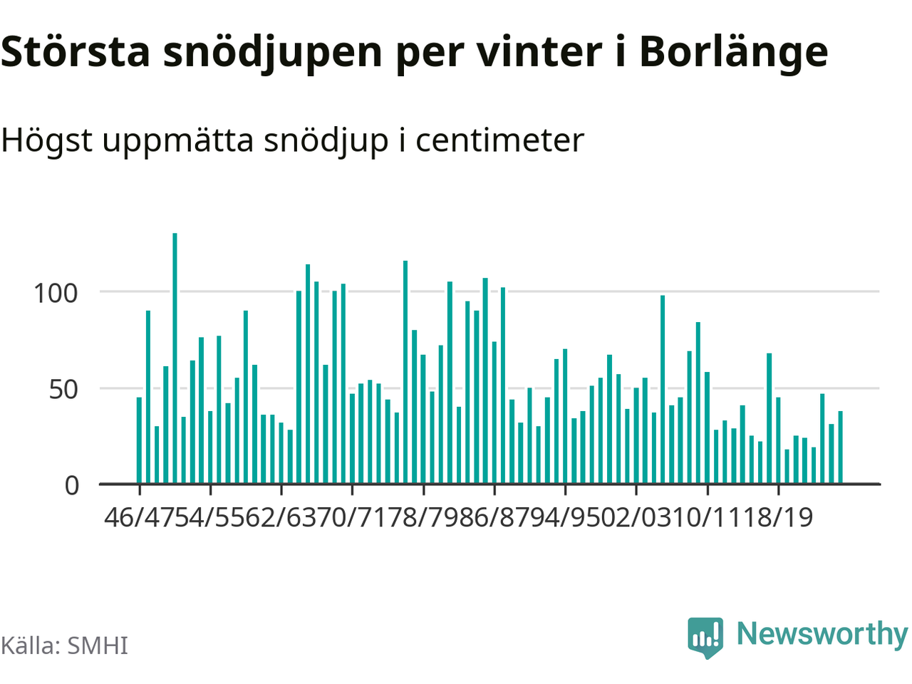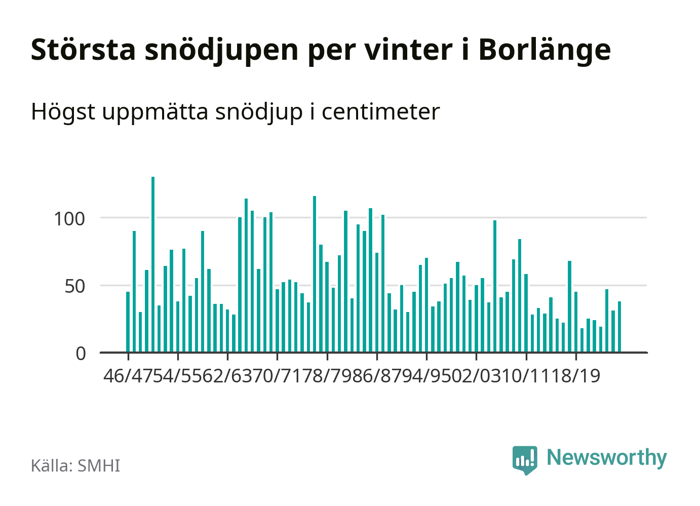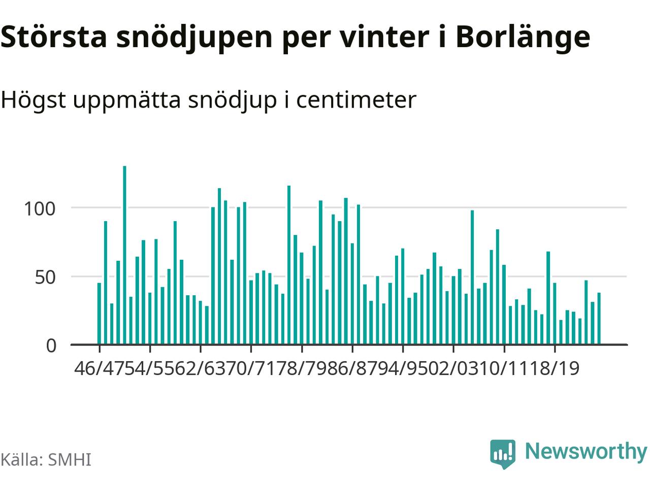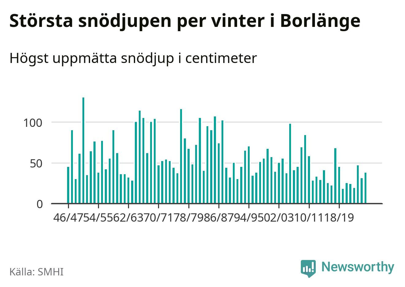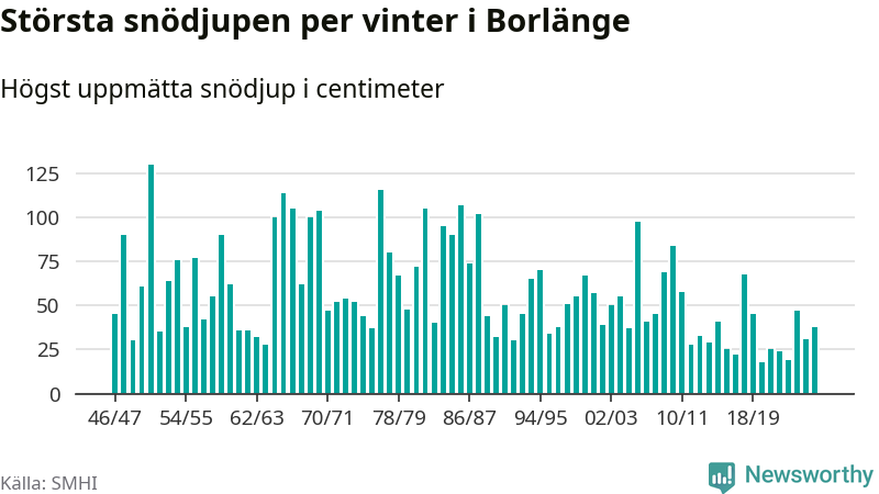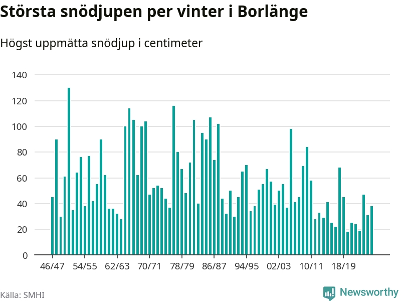 Men hur står sig det snödjupet historiskt sett? Newsworthy har tittat på det största snödjup som SMHI har uppmätt i Borlänge kommun varje år sedan vintern 1946/47 – och hittills tar sig årets vinter inte in bland de 25 vintrarna med störst uppmätt snödjup i kommunen.