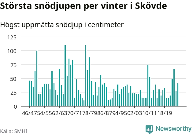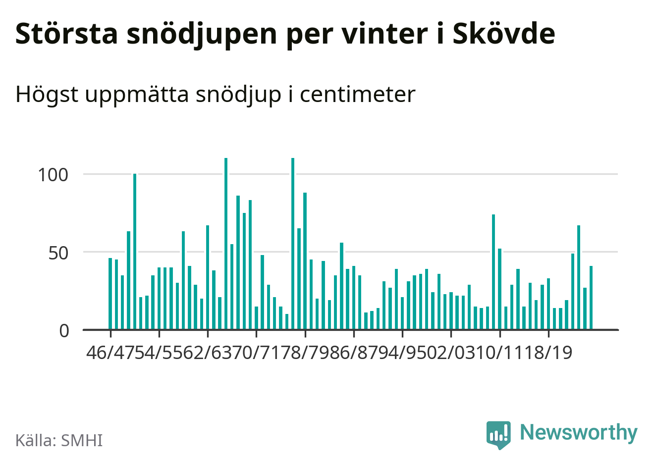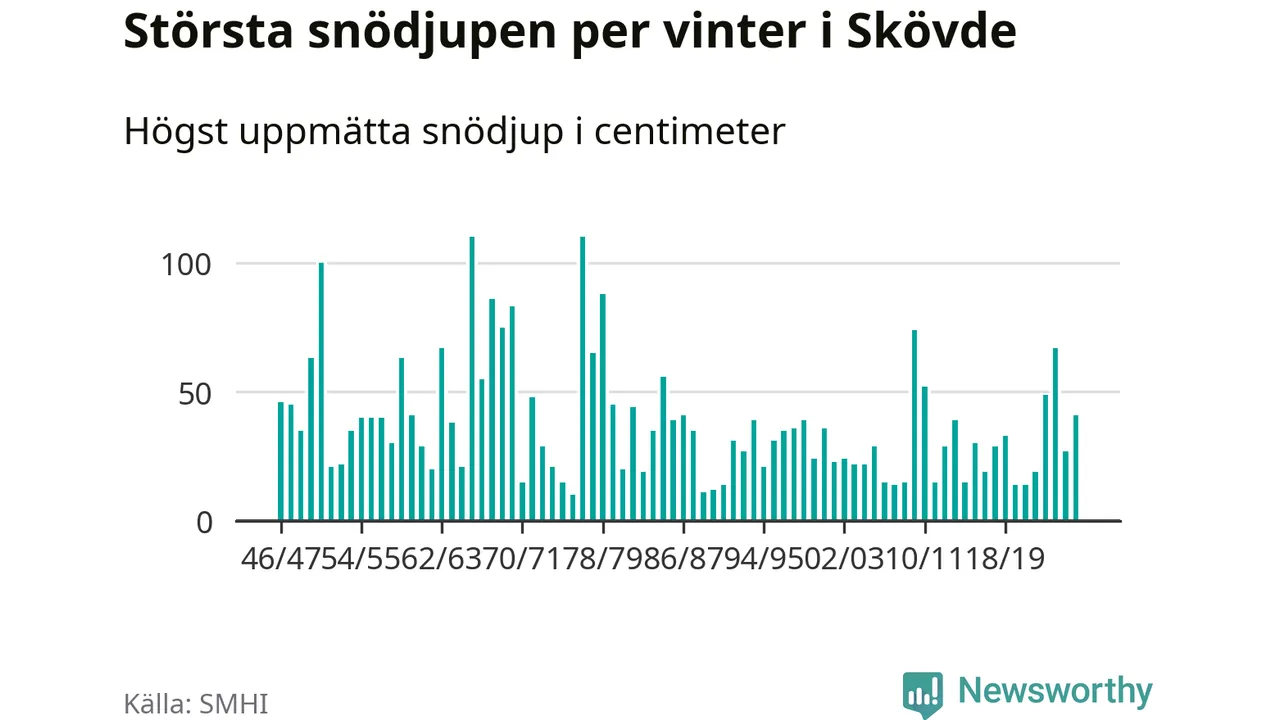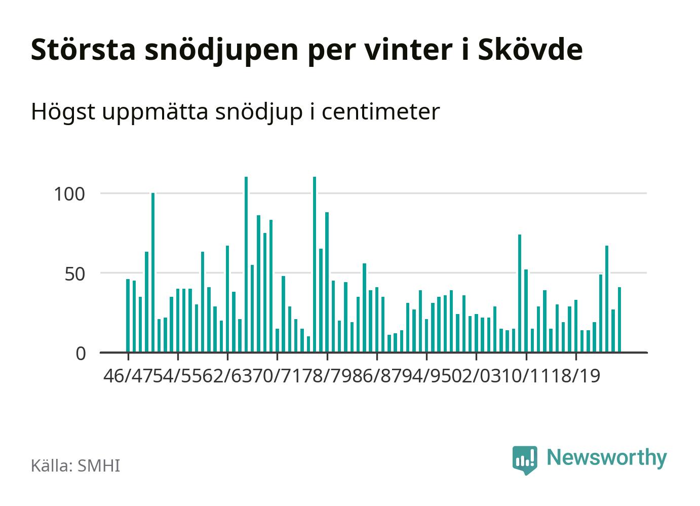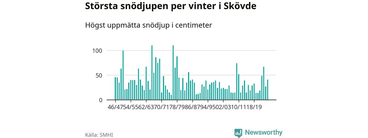 Men hur står sig det snödjupet historiskt sett? Newsworthy har tittat på det största snödjup som SMHI har uppmätt i Skövde kommun varje år sedan vintern 1946/47. 22 vintrar har det uppmätts större snödjup.