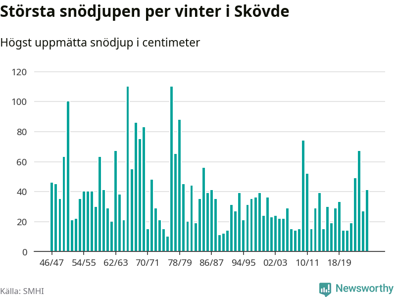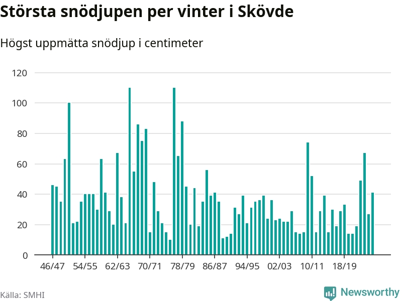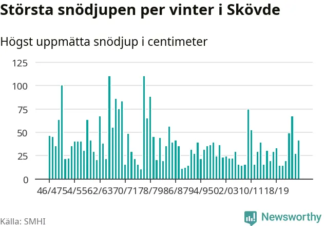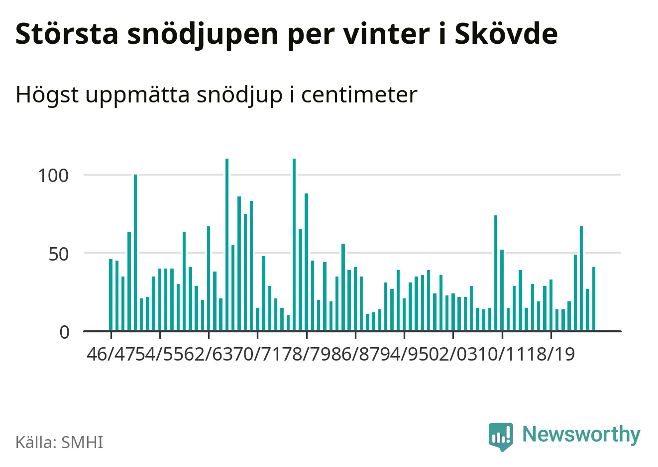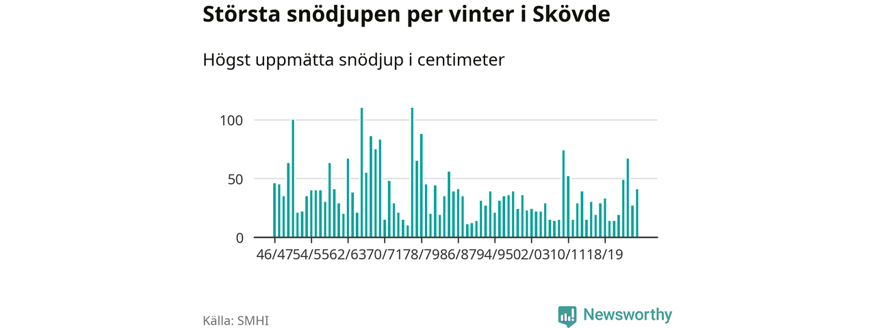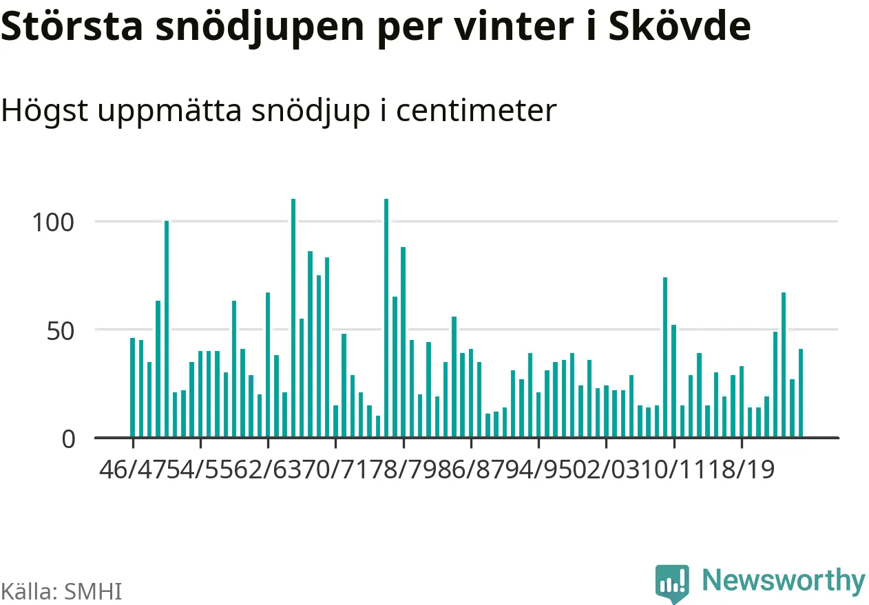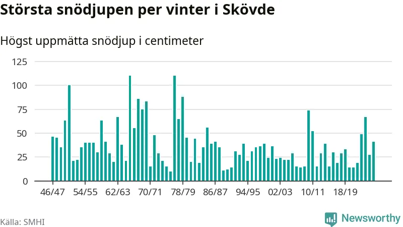 Men hur står sig det snödjupet historiskt sett? Newsworthy har tittat på det största snödjup som SMHI har uppmätt i Skövde kommun varje år sedan vintern 1946/47. 22 vintrar har det uppmätts större snödjup.