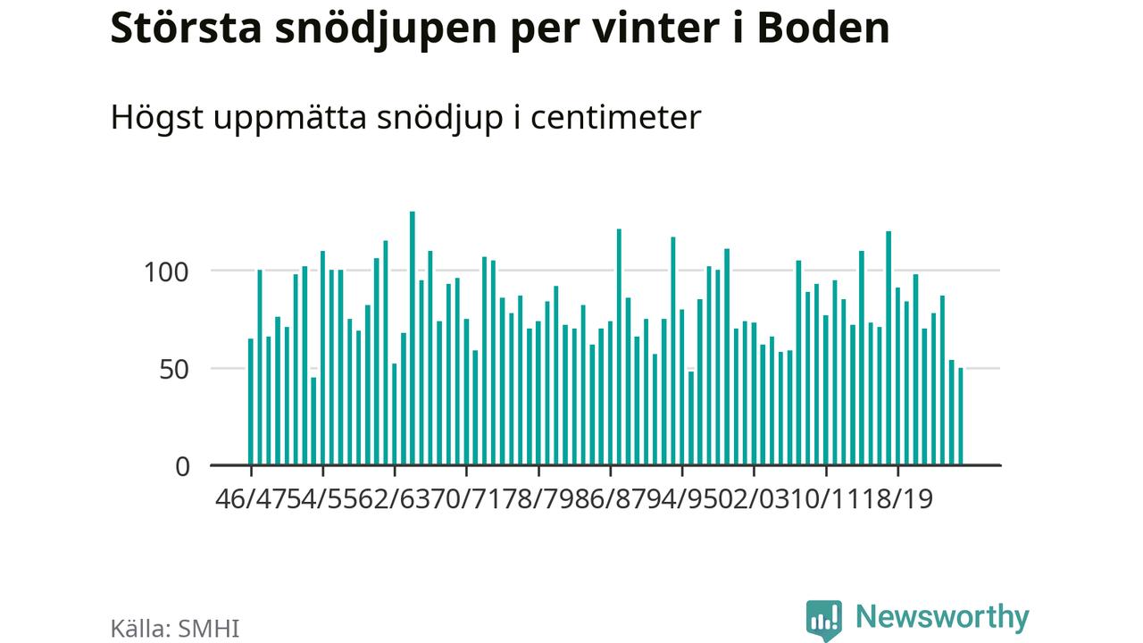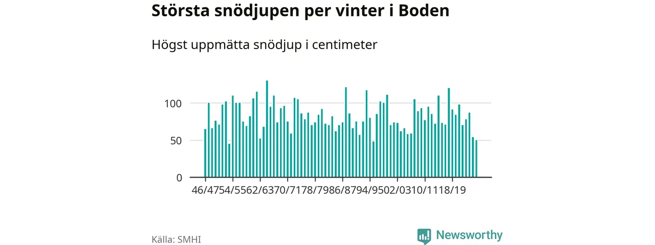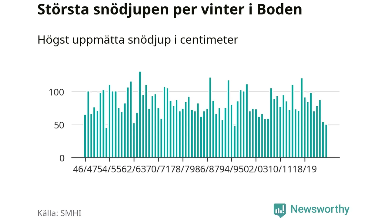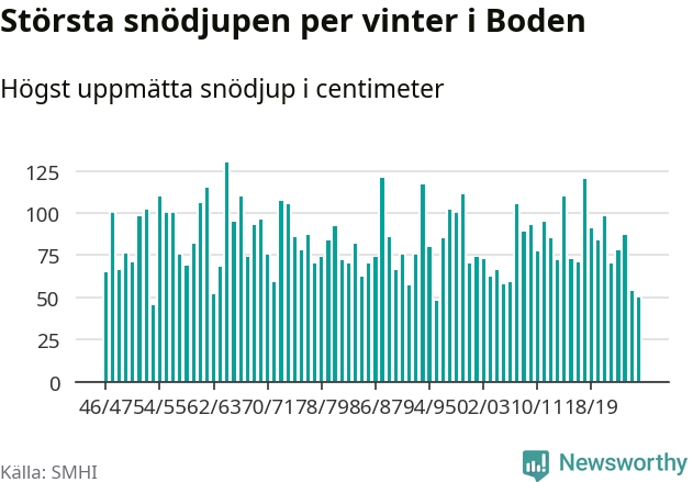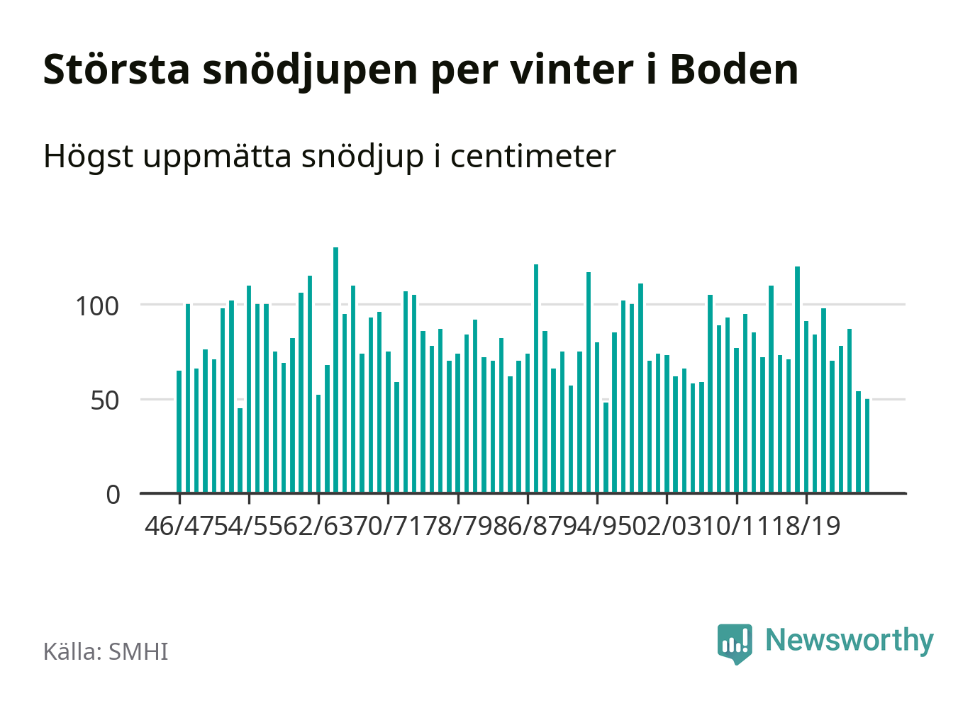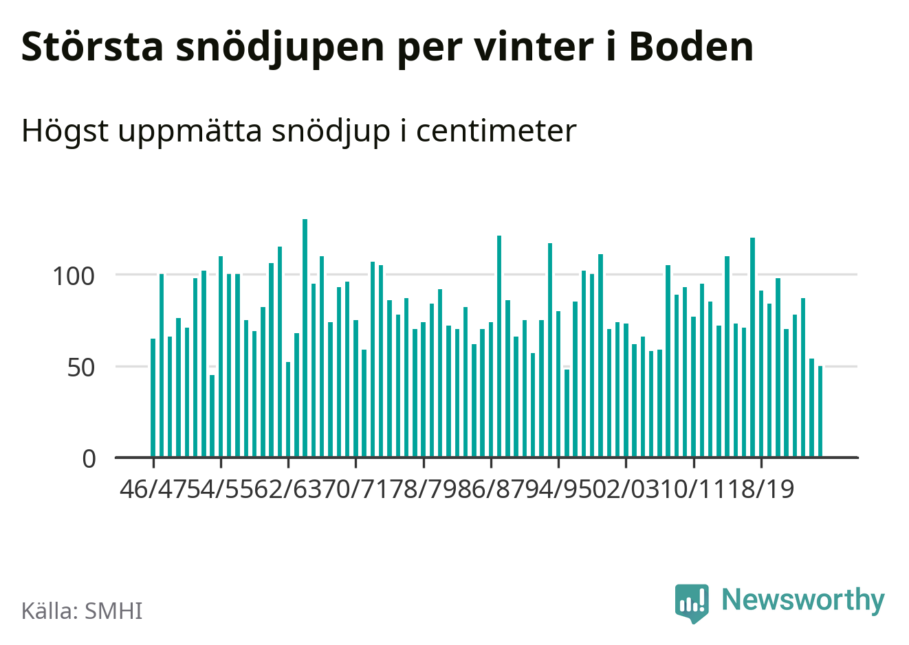 Men hur står sig det snödjupet historiskt sett? Newsworthy har tittat på det största snödjup som SMHI har uppmätt i Bodens kommun varje år sedan vintern 1946/47 – och hittills tar sig årets vinter inte in bland de 25 vintrarna med störst uppmätt snödjup i kommunen.