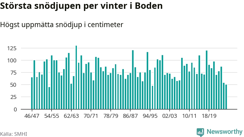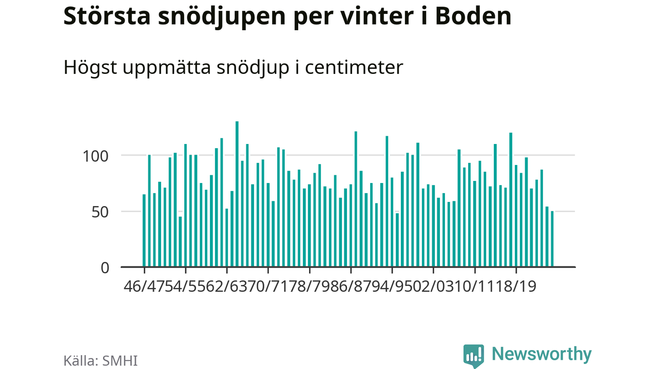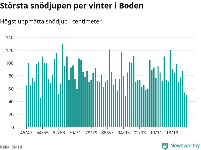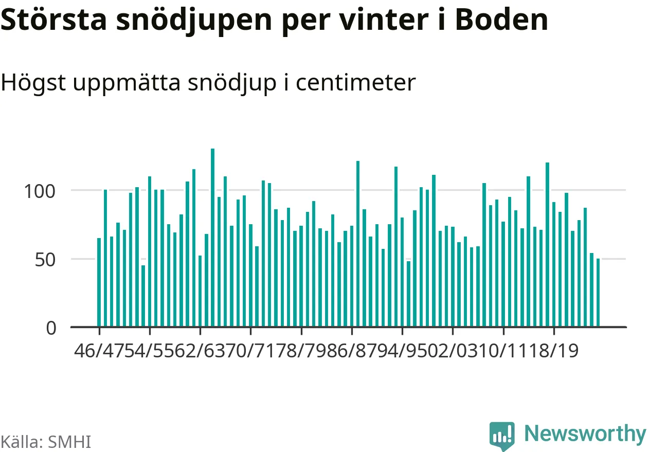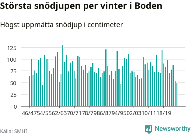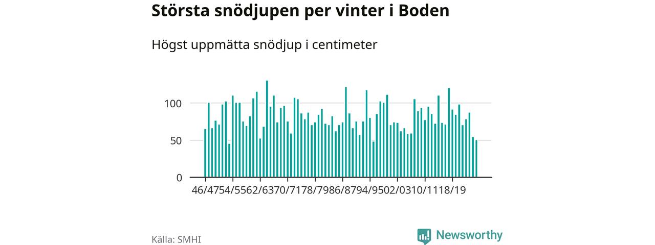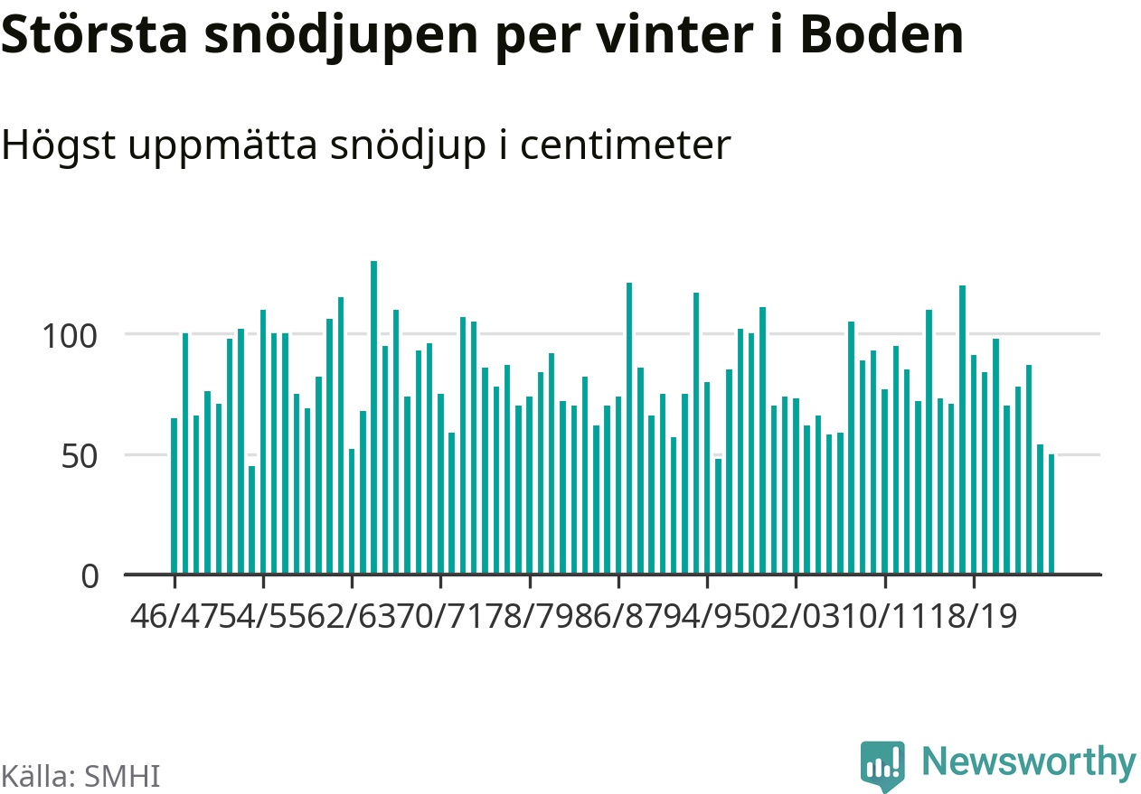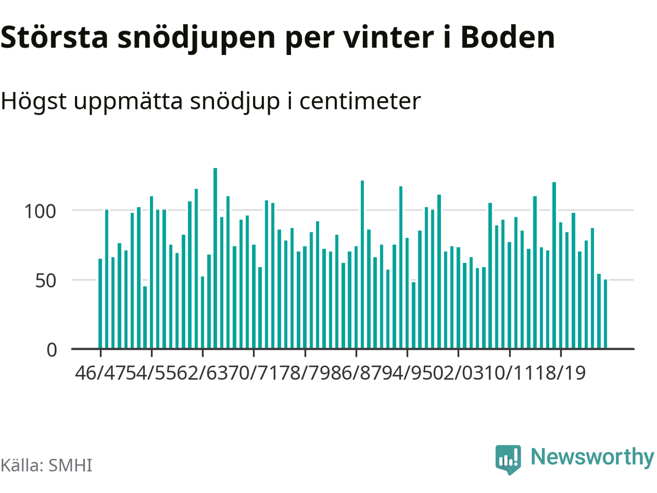 Men hur står sig det snödjupet historiskt sett? Newsworthy har tittat på det största snödjup som SMHI har uppmätt i Bodens kommun varje år sedan vintern 1946/47 – och hittills tar sig årets vinter inte in bland de 25 vintrarna med störst uppmätt snödjup i kommunen.