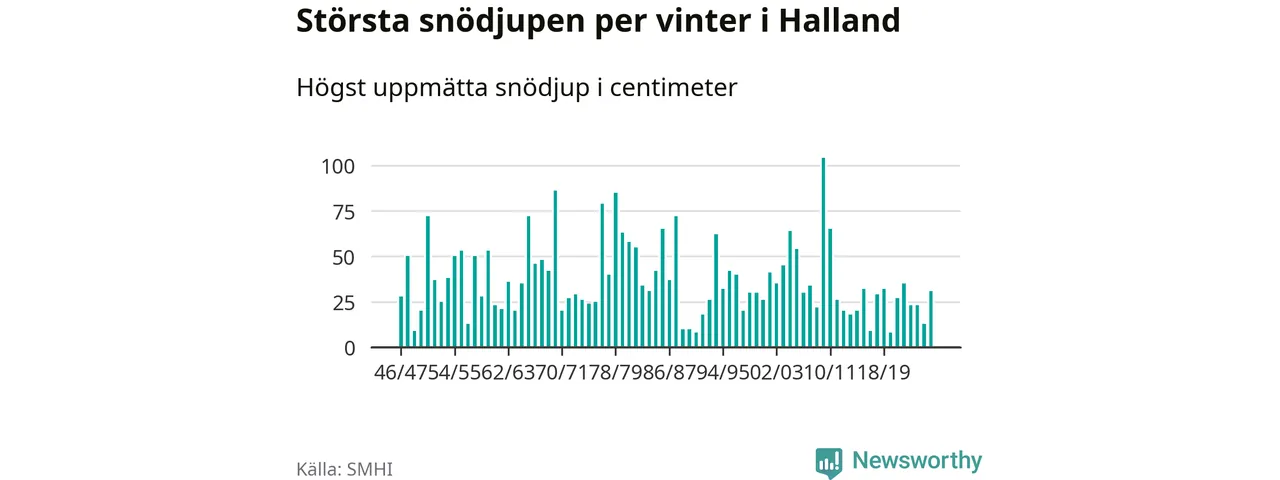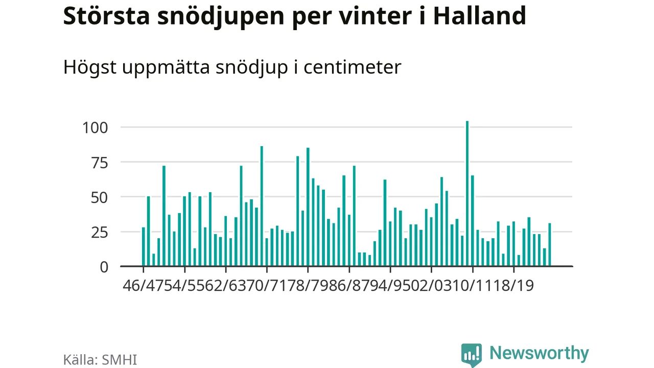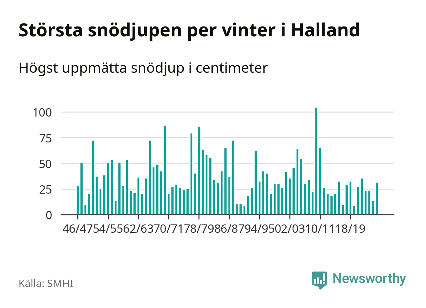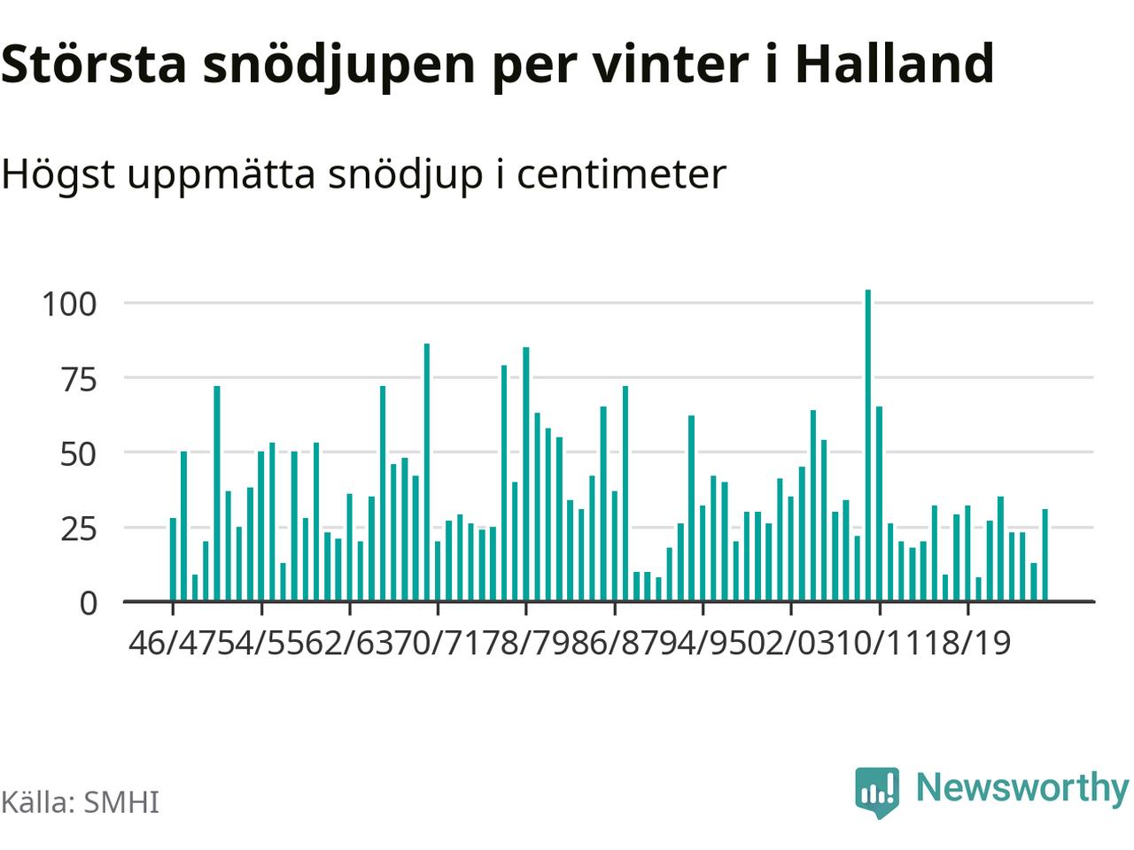 Men hur står sig det snödjupet historiskt sett? Newsworthy har tittat på det största snödjup som SMHI har uppmätt i Hallands län varje år sedan vintern 1946/47 – och hittills tar sig årets vinter inte in bland de 25 vintrarna med störst uppmätt snödjup i länet.