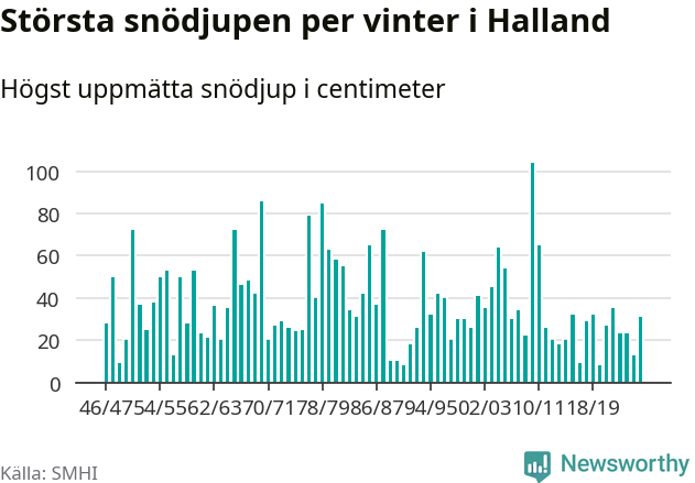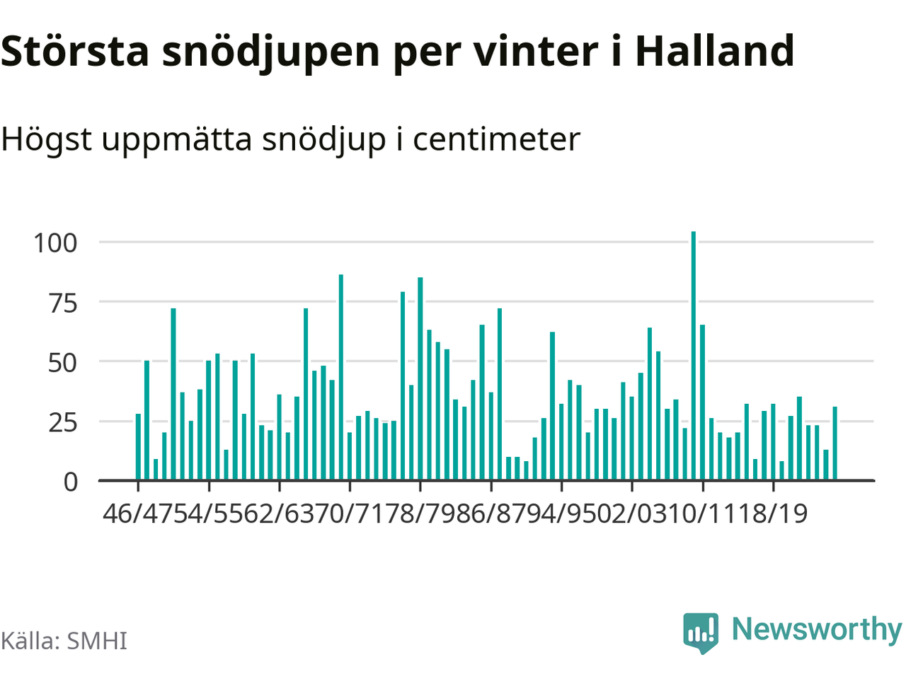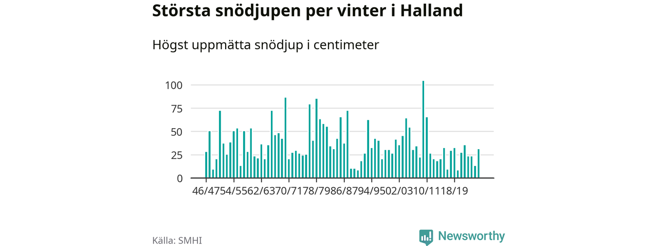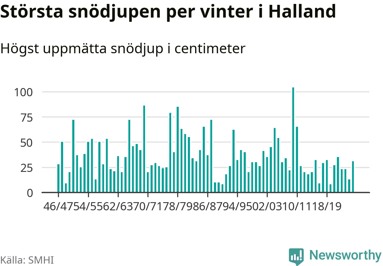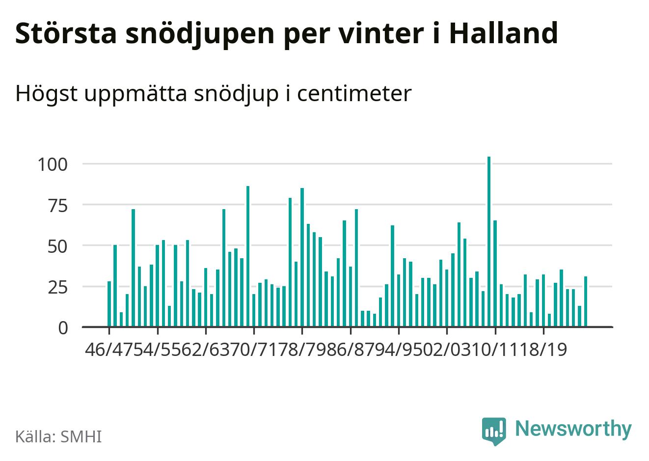 Men hur står sig det snödjupet historiskt sett? Newsworthy har tittat på det största snödjup som SMHI har uppmätt i Hallands län varje år sedan vintern 1946/47 – och hittills tar sig årets vinter inte in bland de 25 vintrarna med störst uppmätt snödjup i länet.