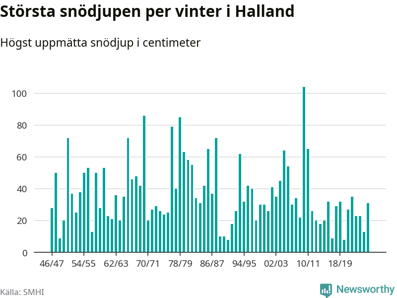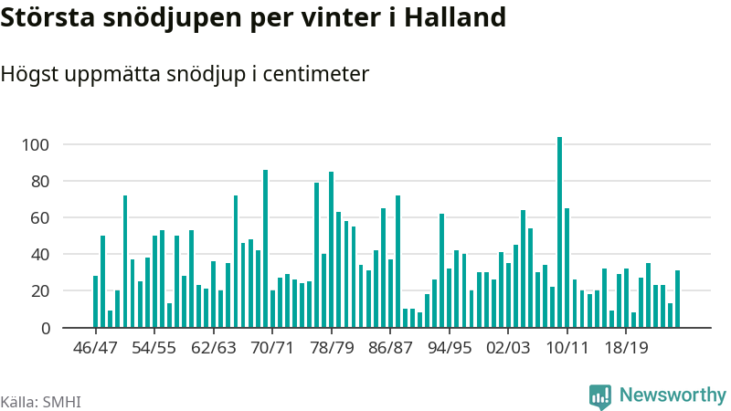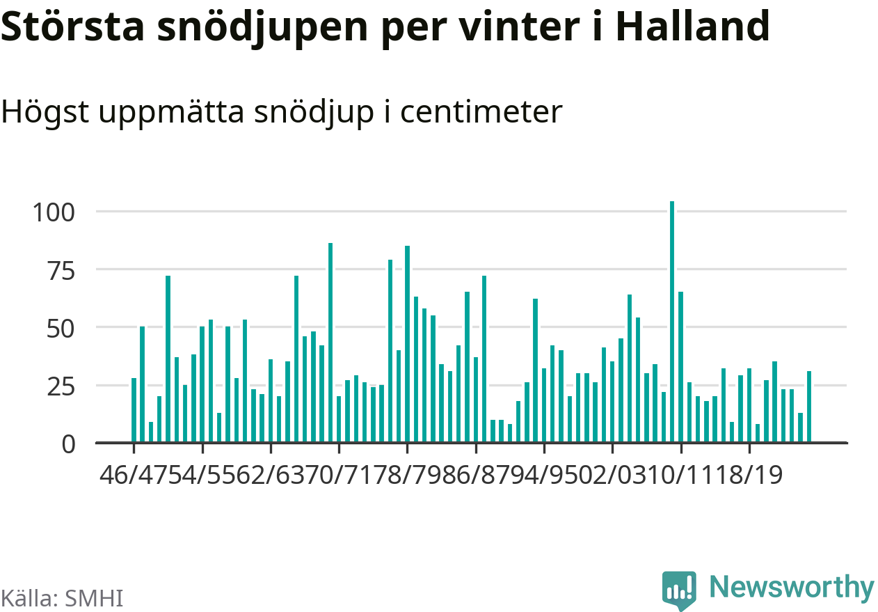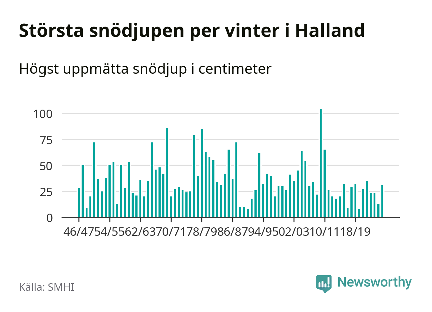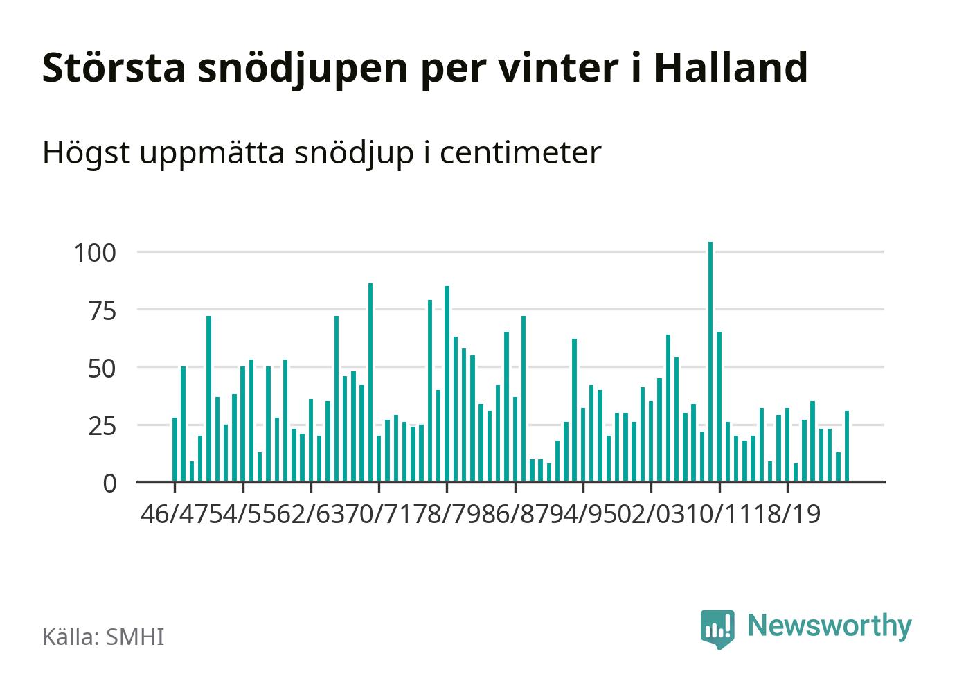 Men hur står sig det snödjupet historiskt sett? Newsworthy har tittat på det största snödjup som SMHI har uppmätt i Hallands län varje år sedan vintern 1946/47 – och hittills tar sig årets vinter inte in bland de 25 vintrarna med störst uppmätt snödjup i länet.