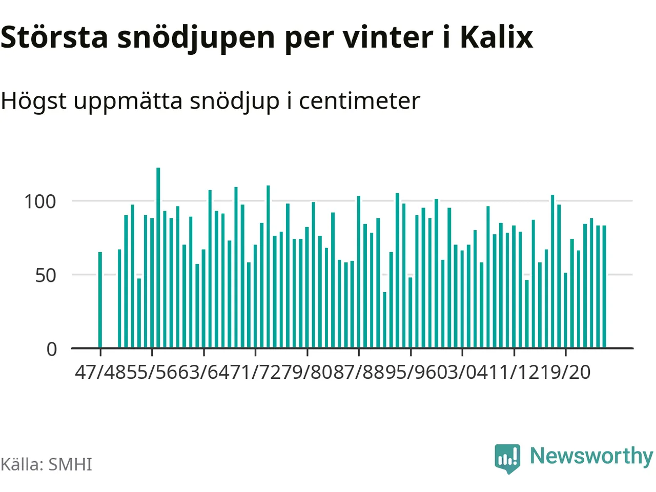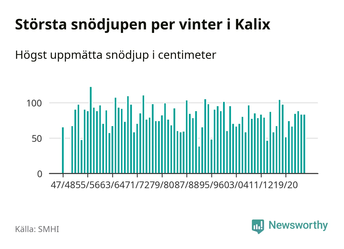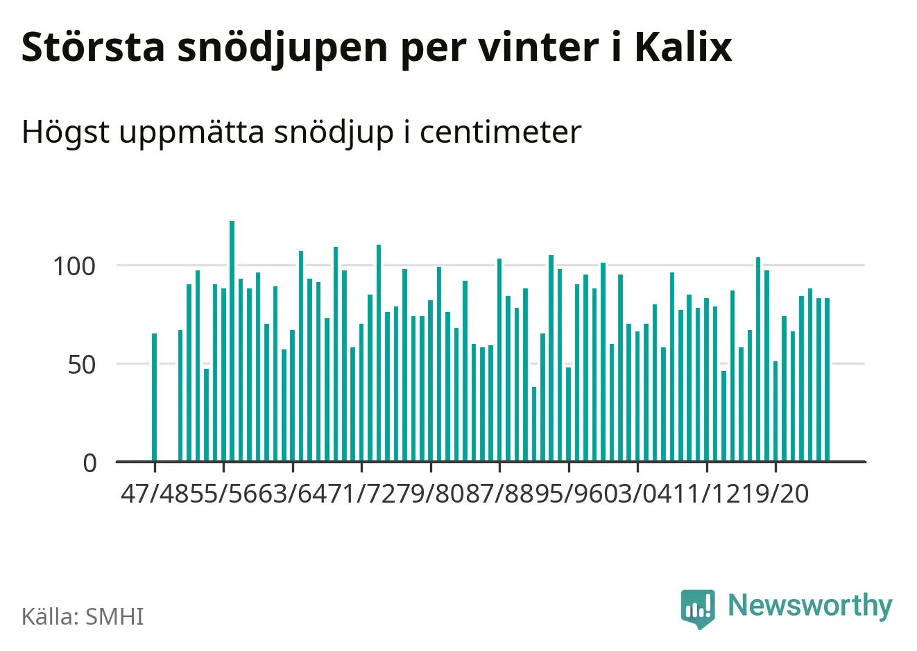 Men hur står sig det snödjupet historiskt sett? Newsworthy har tittat på det största snödjup som SMHI har uppmätt i Kalix kommun varje år sedan vintern 1947/48 – och hittills tar sig årets vinter inte in bland de 25 vintrarna med störst uppmätt snödjup i kommunen.