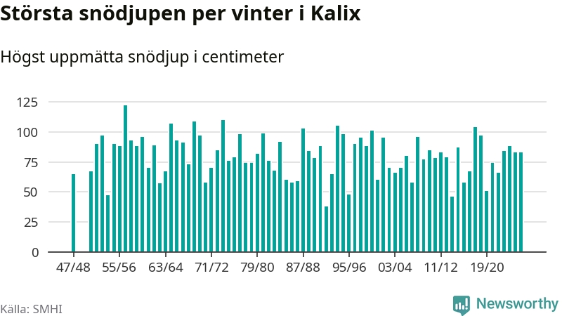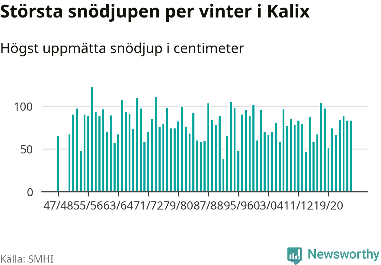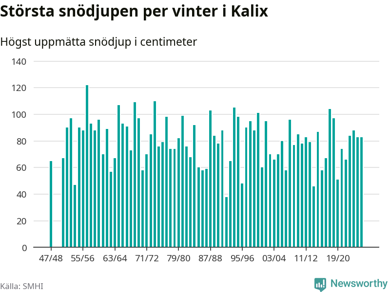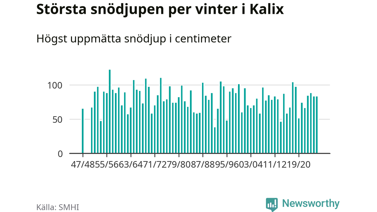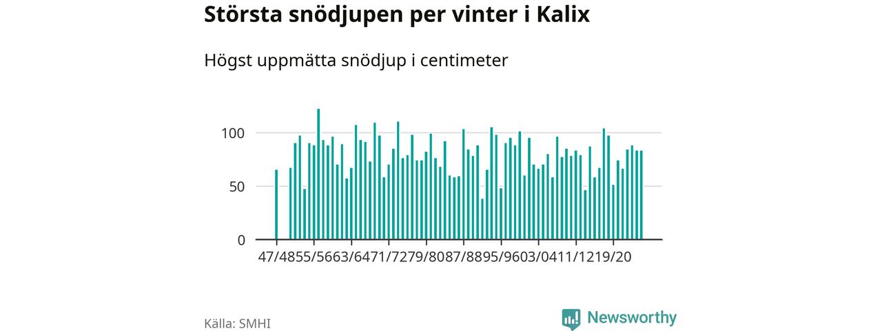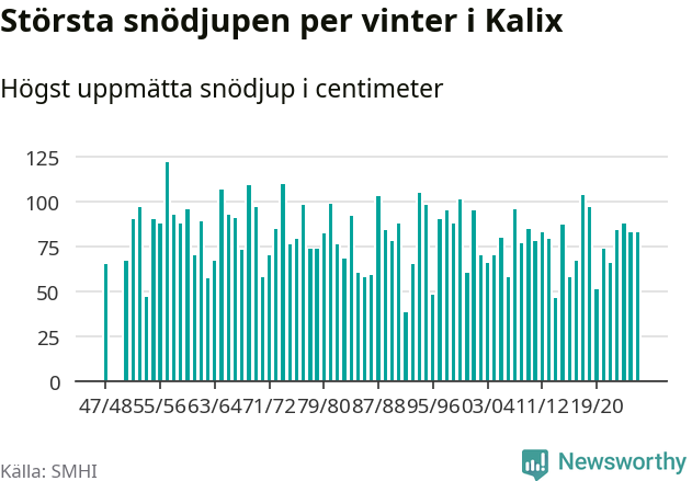 Men hur står sig det snödjupet historiskt sett? Newsworthy har tittat på det största snödjup som SMHI har uppmätt i Kalix kommun varje år sedan vintern 1947/48 – och hittills tar sig årets vinter inte in bland de 25 vintrarna med störst uppmätt snödjup i kommunen.