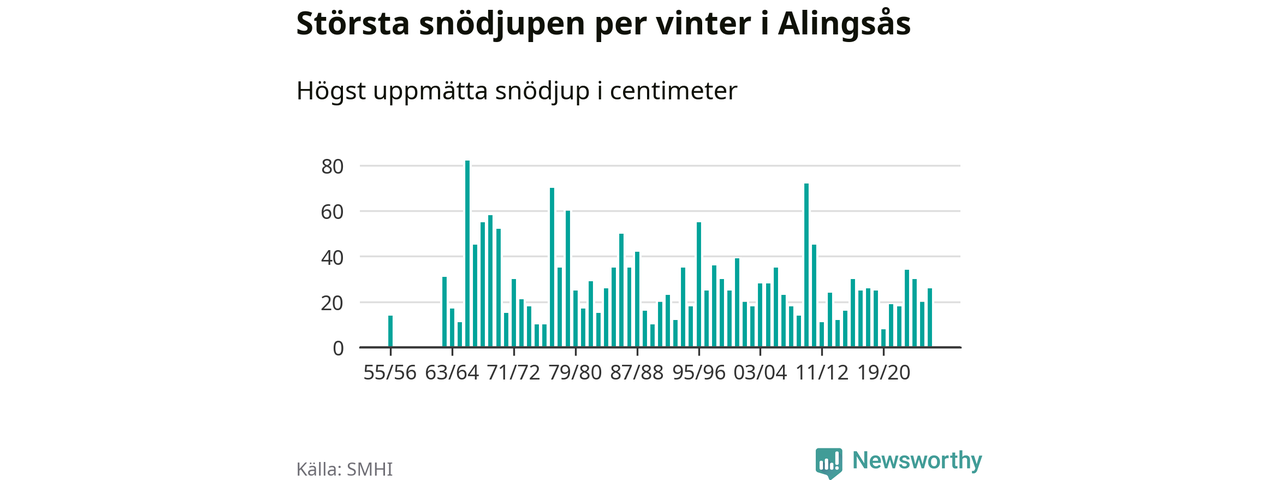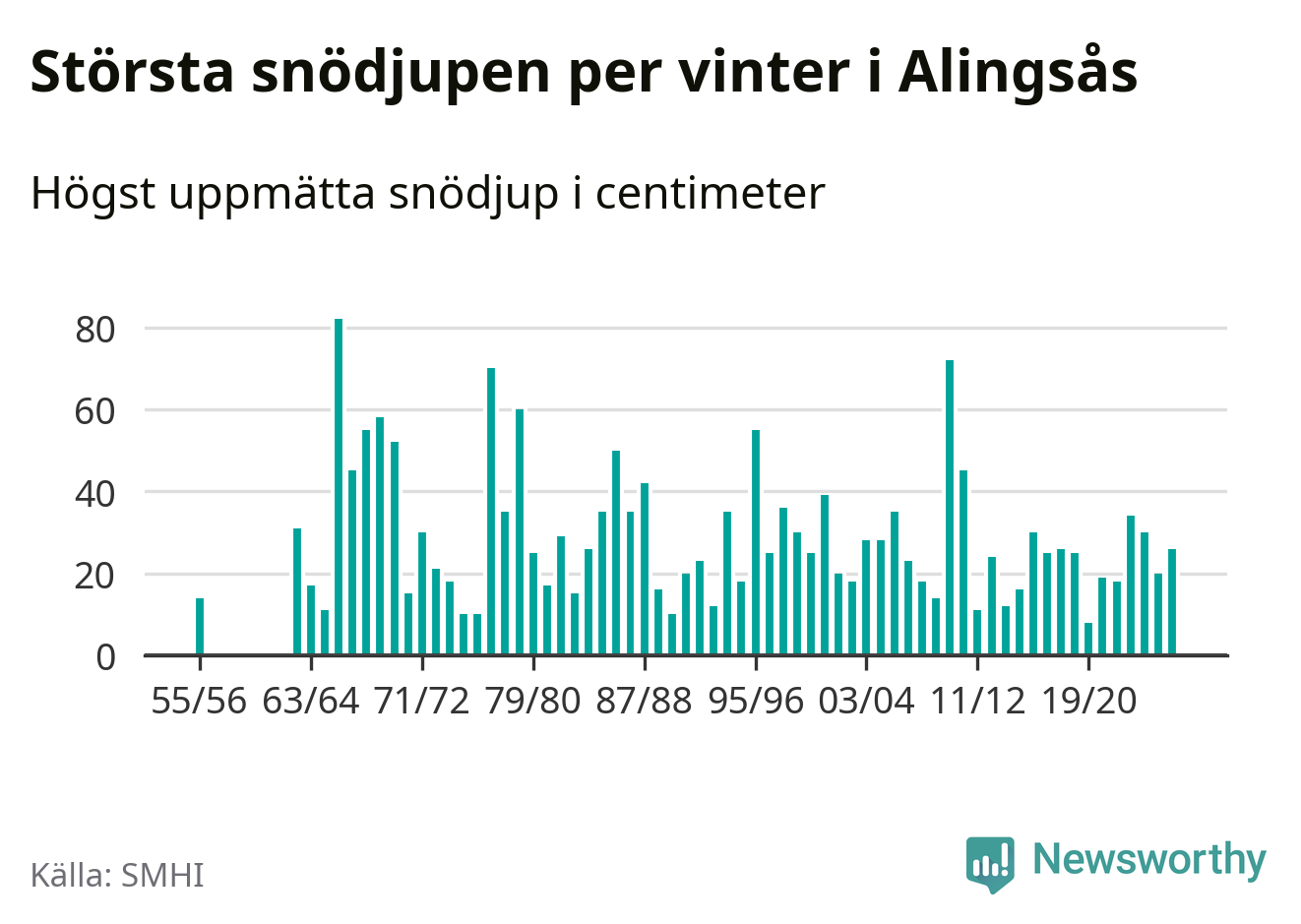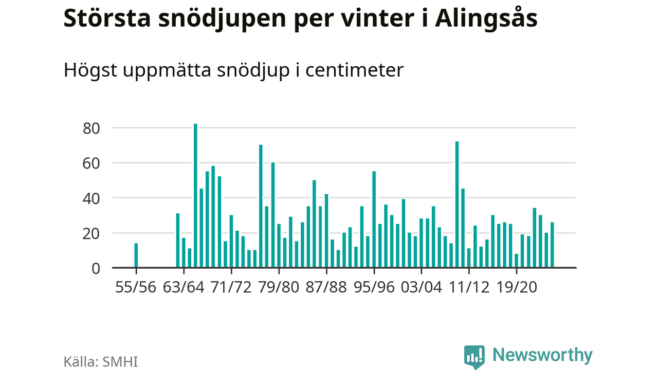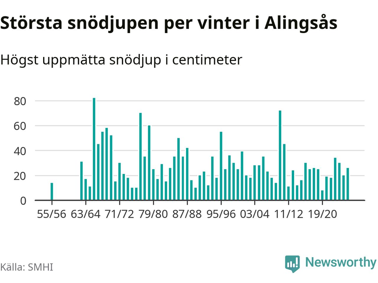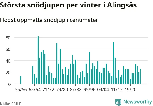 Men hur står sig det snödjupet historiskt sett? Newsworthy har tittat på det största snödjup som SMHI har uppmätt i Alingsås kommun varje år sedan vintern 1955/56 – och hittills tar sig årets vinter inte in bland de 25 vintrarna med störst uppmätt snödjup i kommunen. Det ska sägas att det inte finns några noteringar för åren 1957–1962.