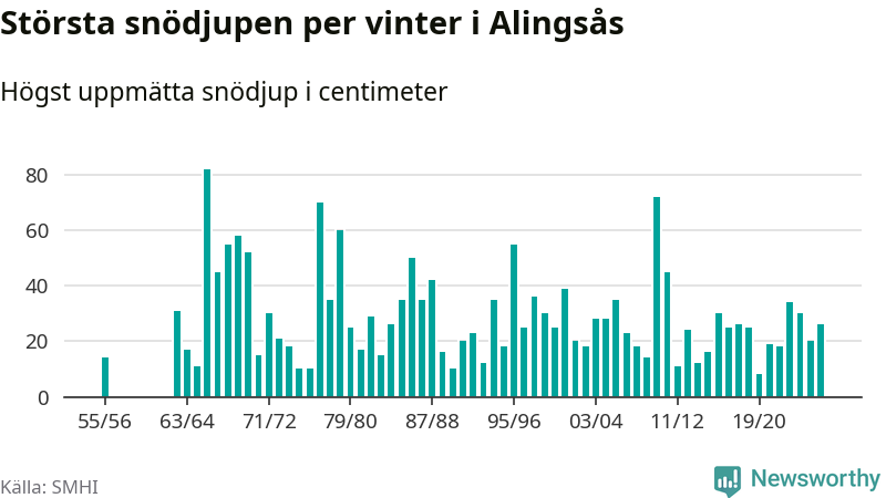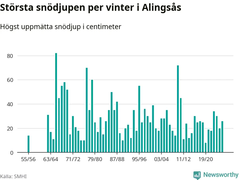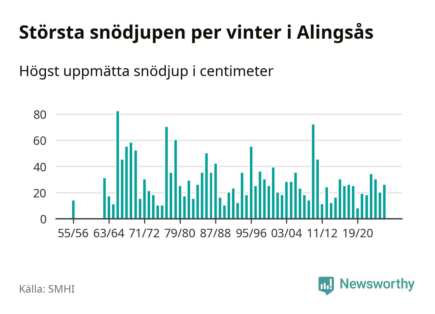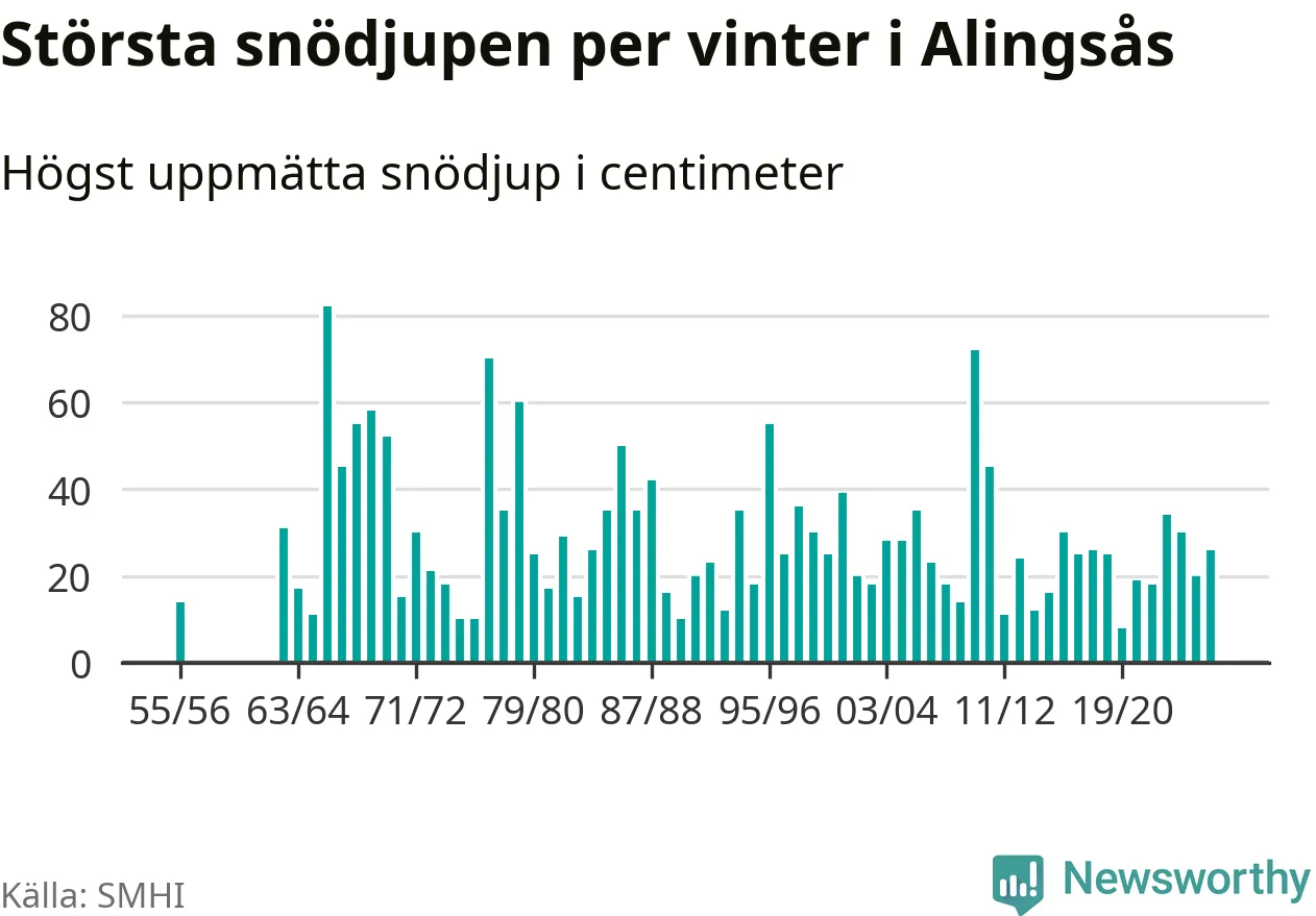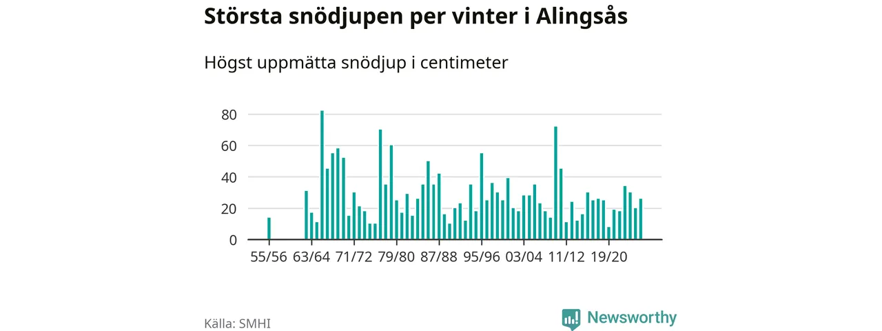 Men hur står sig det snödjupet historiskt sett? Newsworthy har tittat på det största snödjup som SMHI har uppmätt i Alingsås kommun varje år sedan vintern 1955/56 – och hittills tar sig årets vinter inte in bland de 25 vintrarna med störst uppmätt snödjup i kommunen. Det ska sägas att det inte finns några noteringar för åren 1957–1962.
