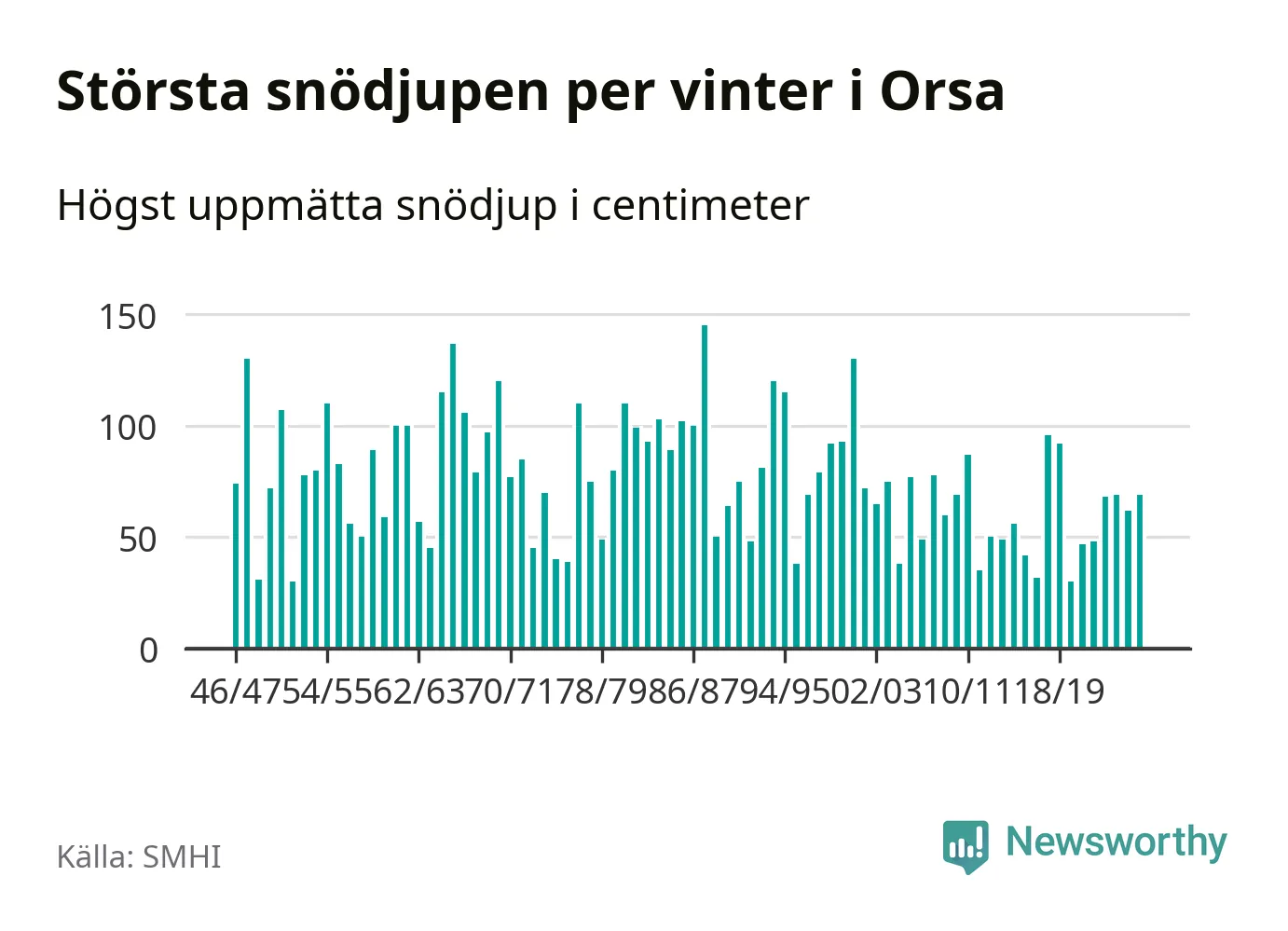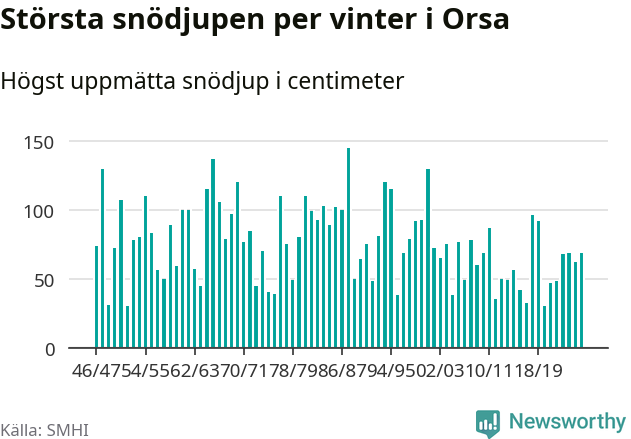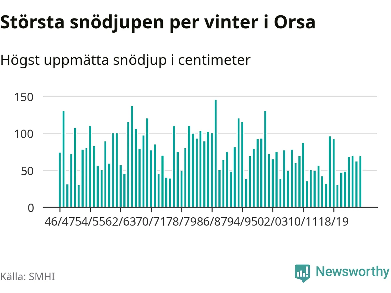 Men hur står sig det snödjupet historiskt sett? Newsworthy har tittat på det största snödjup som SMHI har uppmätt i Orsa kommun varje år sedan vintern 1946/47 – och hittills tar sig årets vinter inte in bland de 25 vintrarna med störst uppmätt snödjup i kommunen.