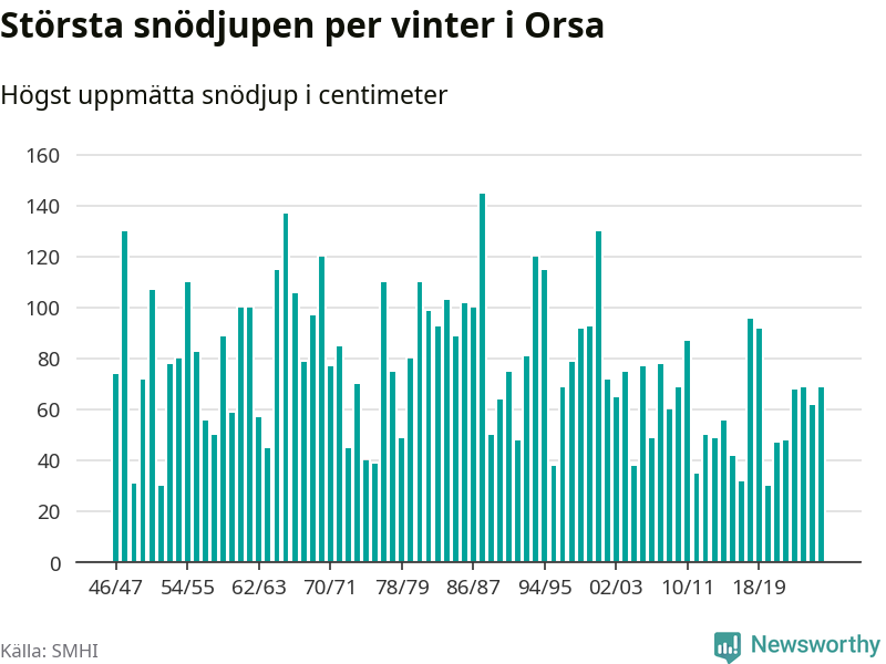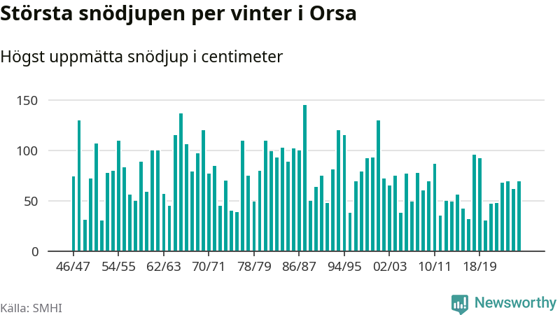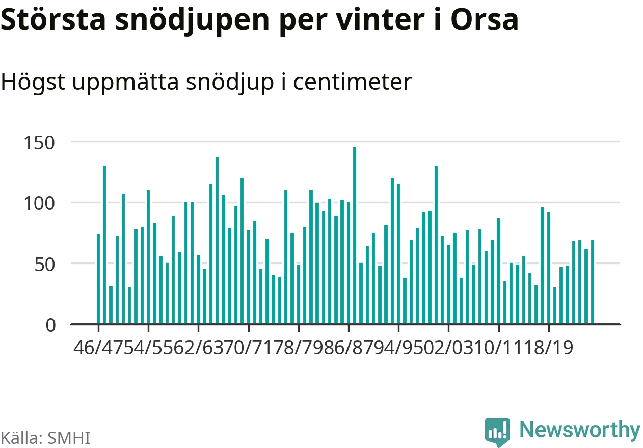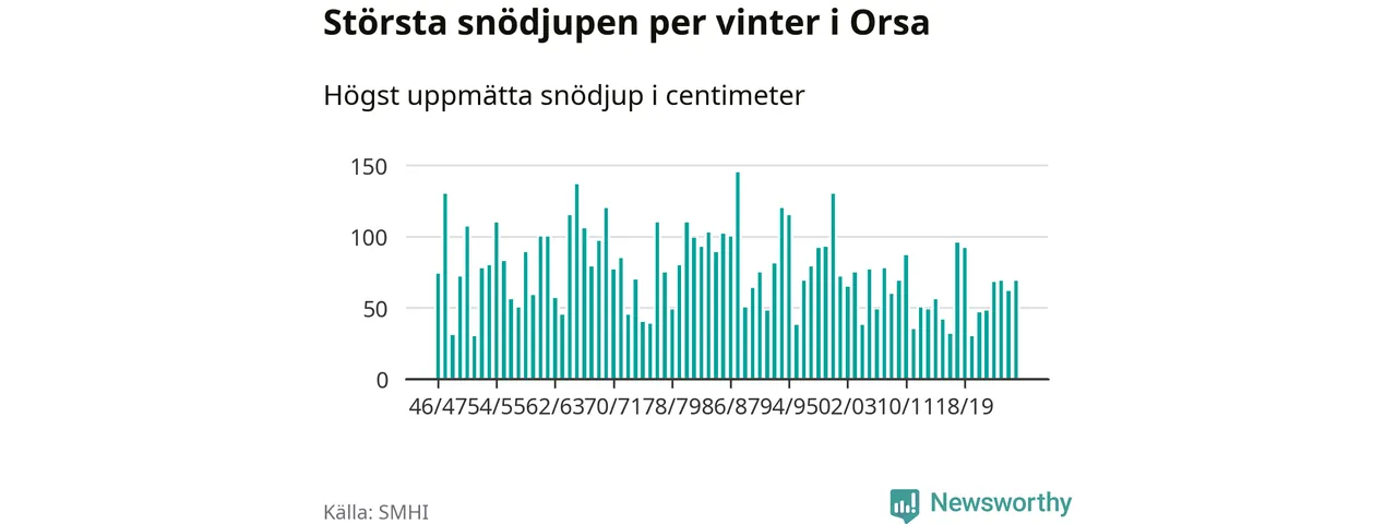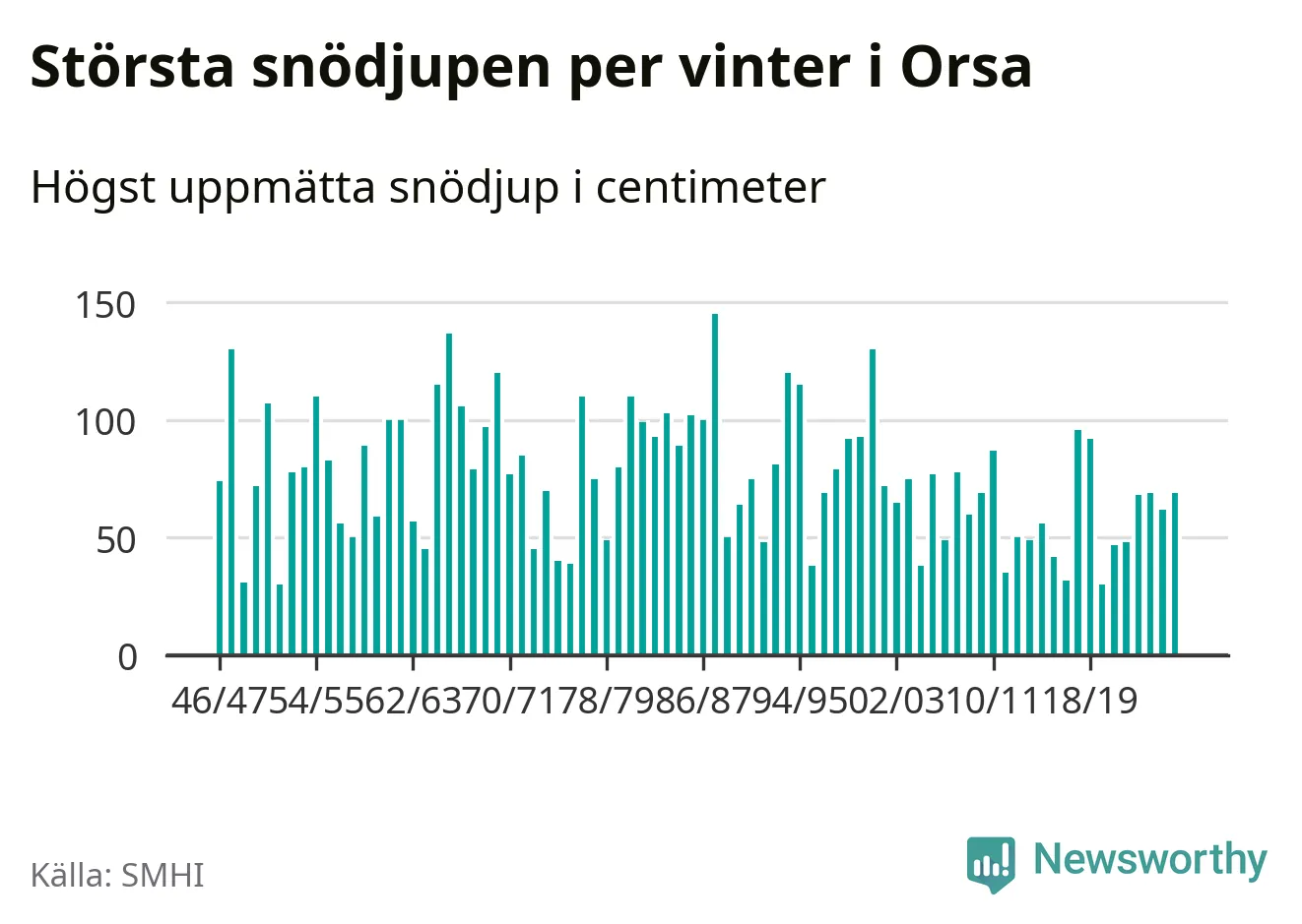 Men hur står sig det snödjupet historiskt sett? Newsworthy har tittat på det största snödjup som SMHI har uppmätt i Orsa kommun varje år sedan vintern 1946/47 – och hittills tar sig årets vinter inte in bland de 25 vintrarna med störst uppmätt snödjup i kommunen.