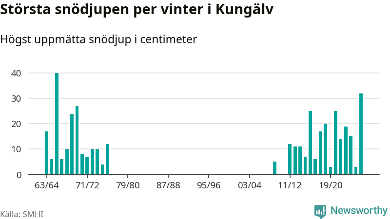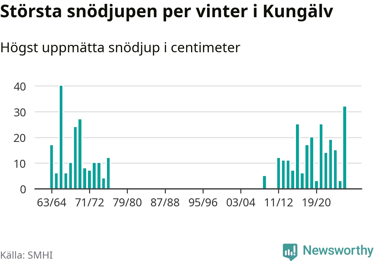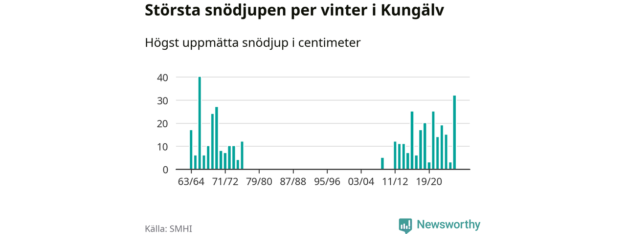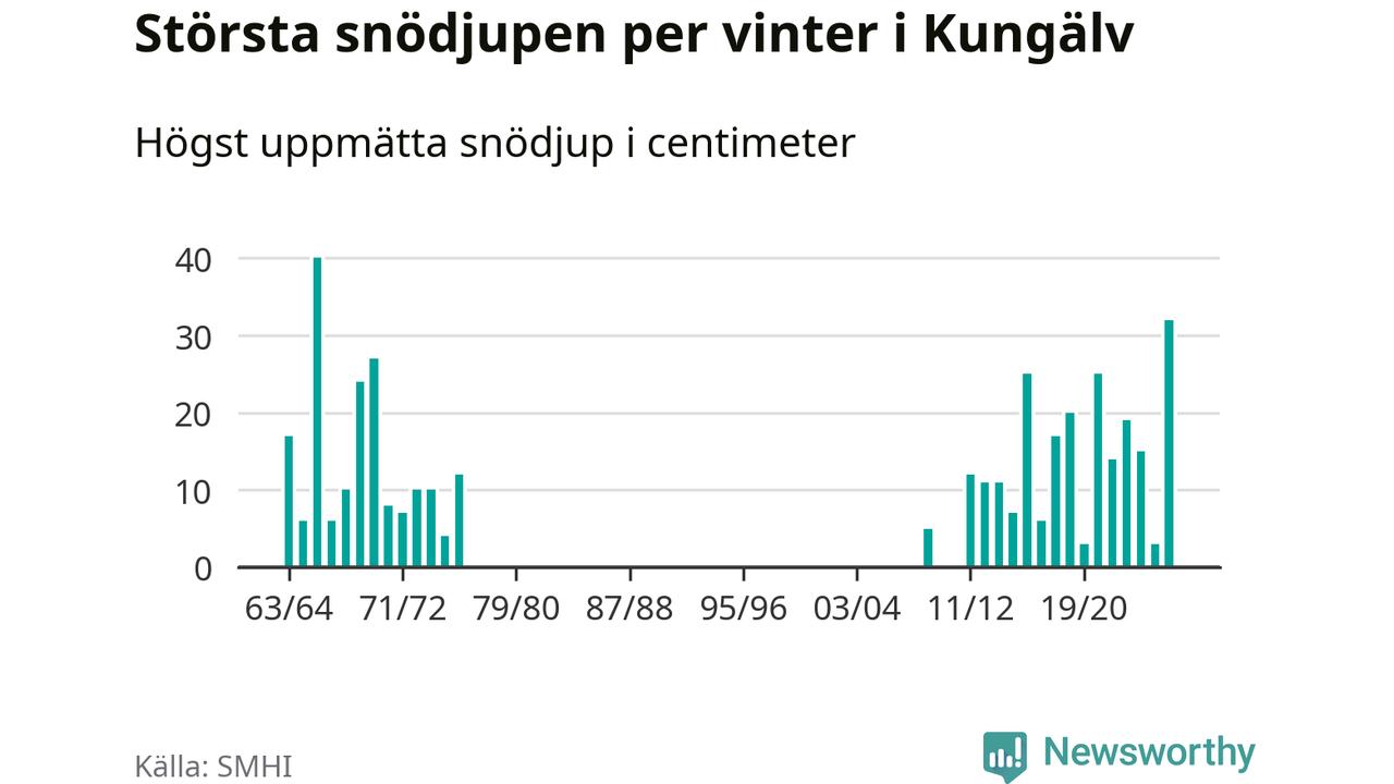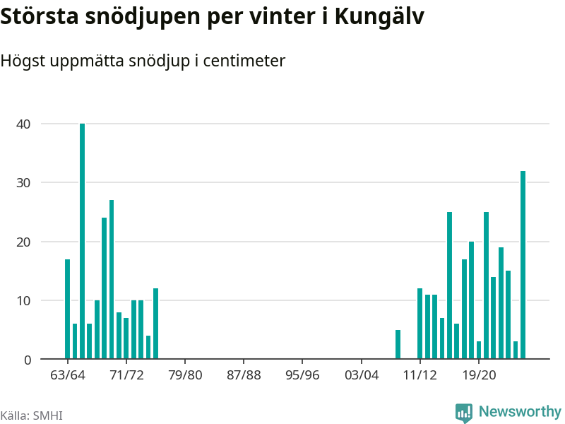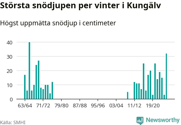Men hur står sig det snödjupet historiskt sett? Newsworthy har tittat på det största snödjup som SMHI har uppmätt i Kungälvs kommun varje år sedan vintern 1963/64 – och hittills är årets vinter den med näst största uppmätta snödjup i kommunen. Det ska sägas att det fattas uppgifter för de flesta av de här vintrarna