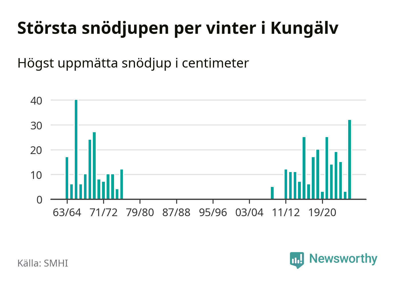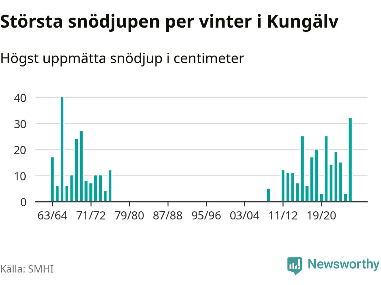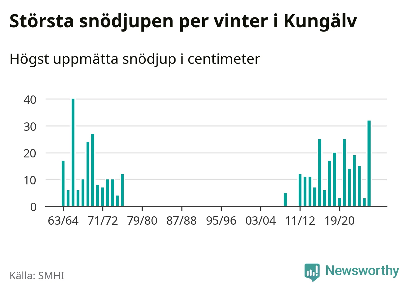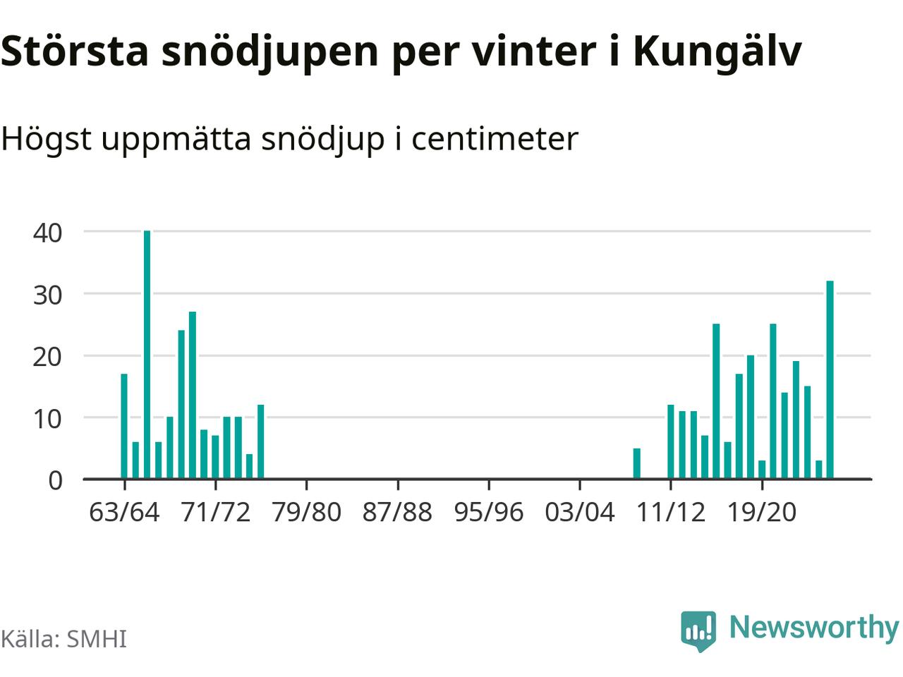 Men hur står sig det snödjupet historiskt sett? Newsworthy har tittat på det största snödjup som SMHI har uppmätt i Kungälvs kommun varje år sedan vintern 1963/64 – och hittills är årets vinter den med näst största uppmätta snödjup i kommunen. Det ska sägas att det fattas uppgifter för de flesta av de här vintrarna