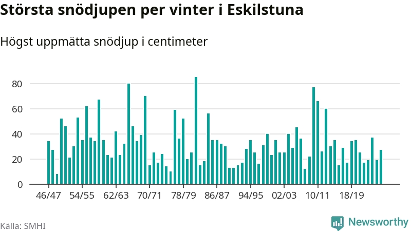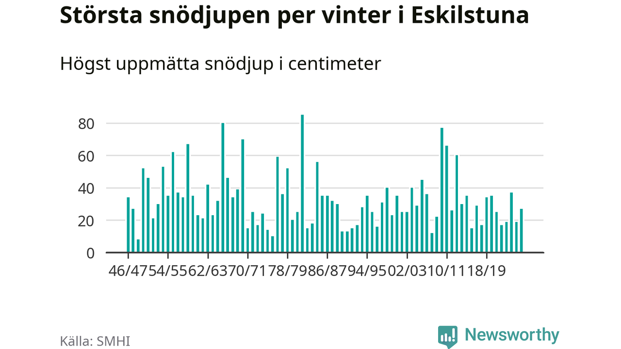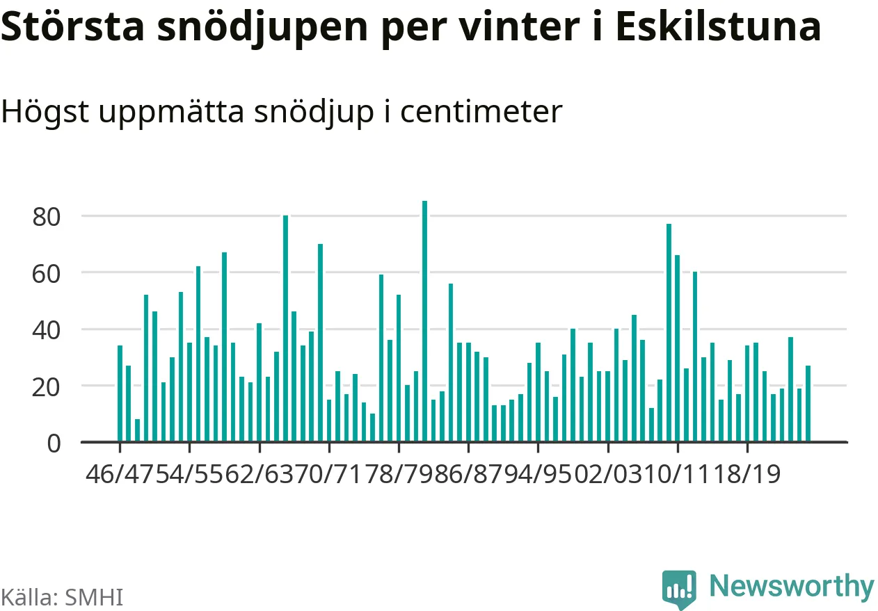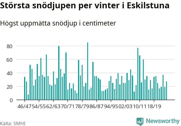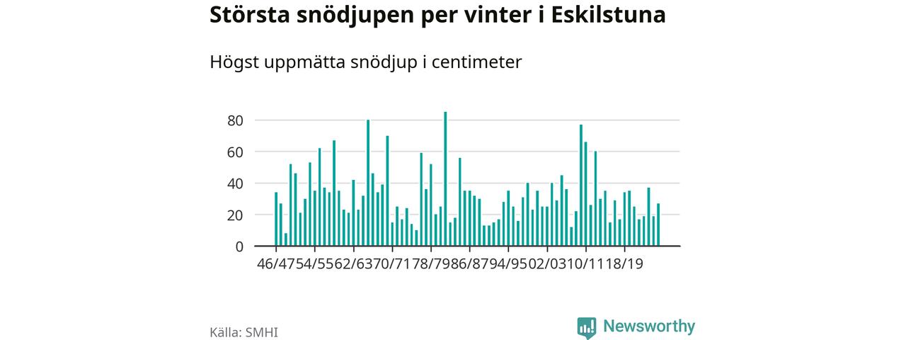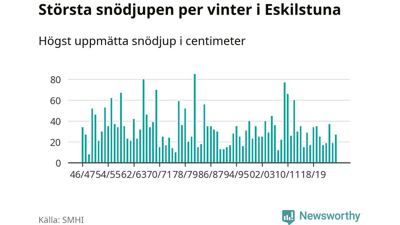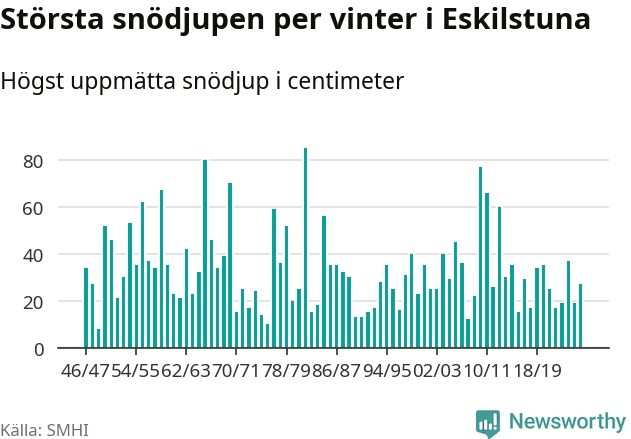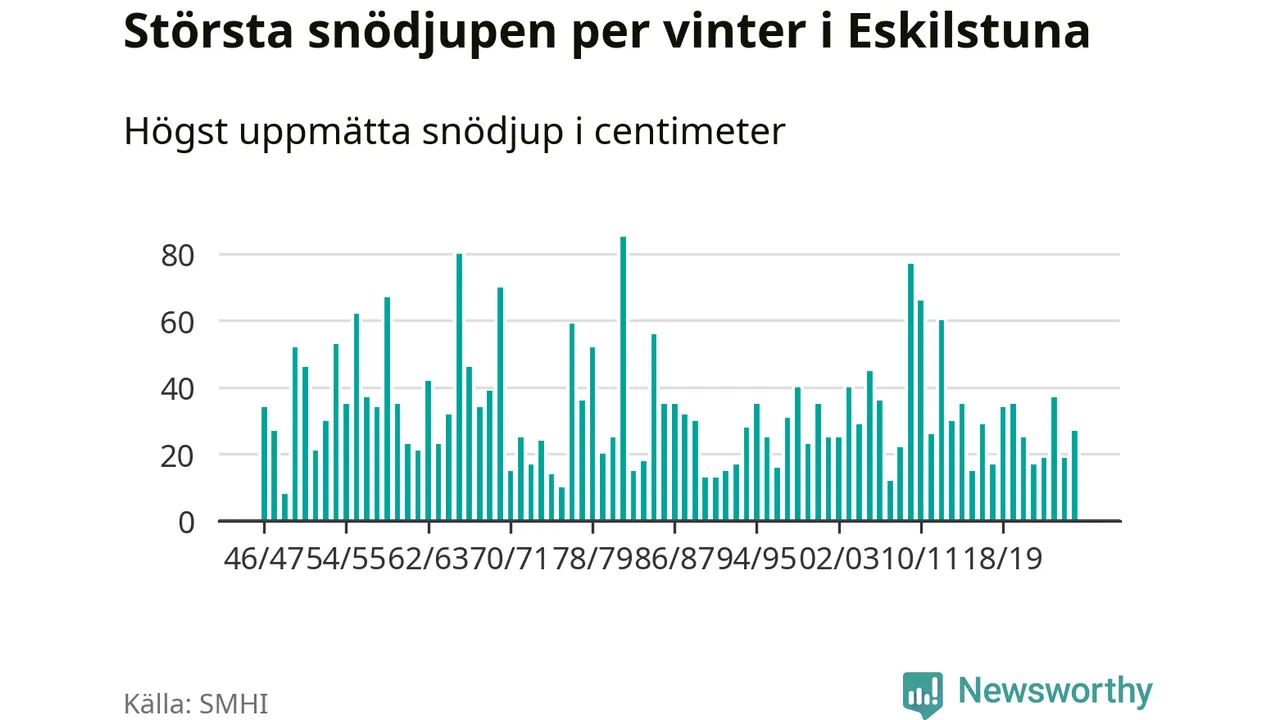 Men hur står sig det snödjupet historiskt sett? Newsworthy har tittat på det största snödjup som SMHI har uppmätt i Eskilstuna kommun varje år sedan vintern 1946/47 – och hittills tar sig årets vinter inte in bland de 25 vintrarna med störst uppmätt snödjup i kommunen.