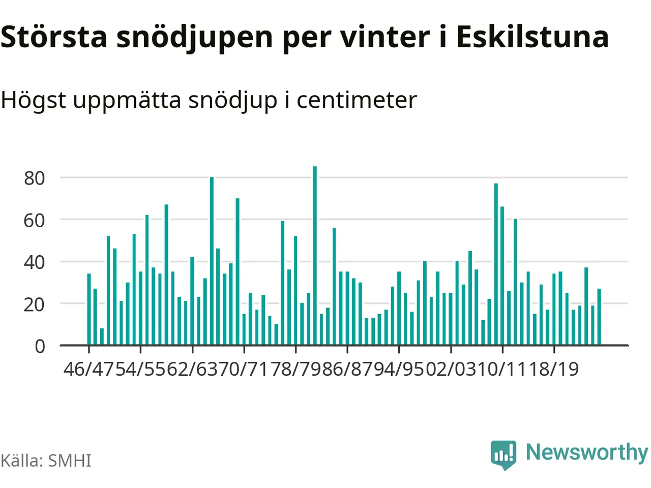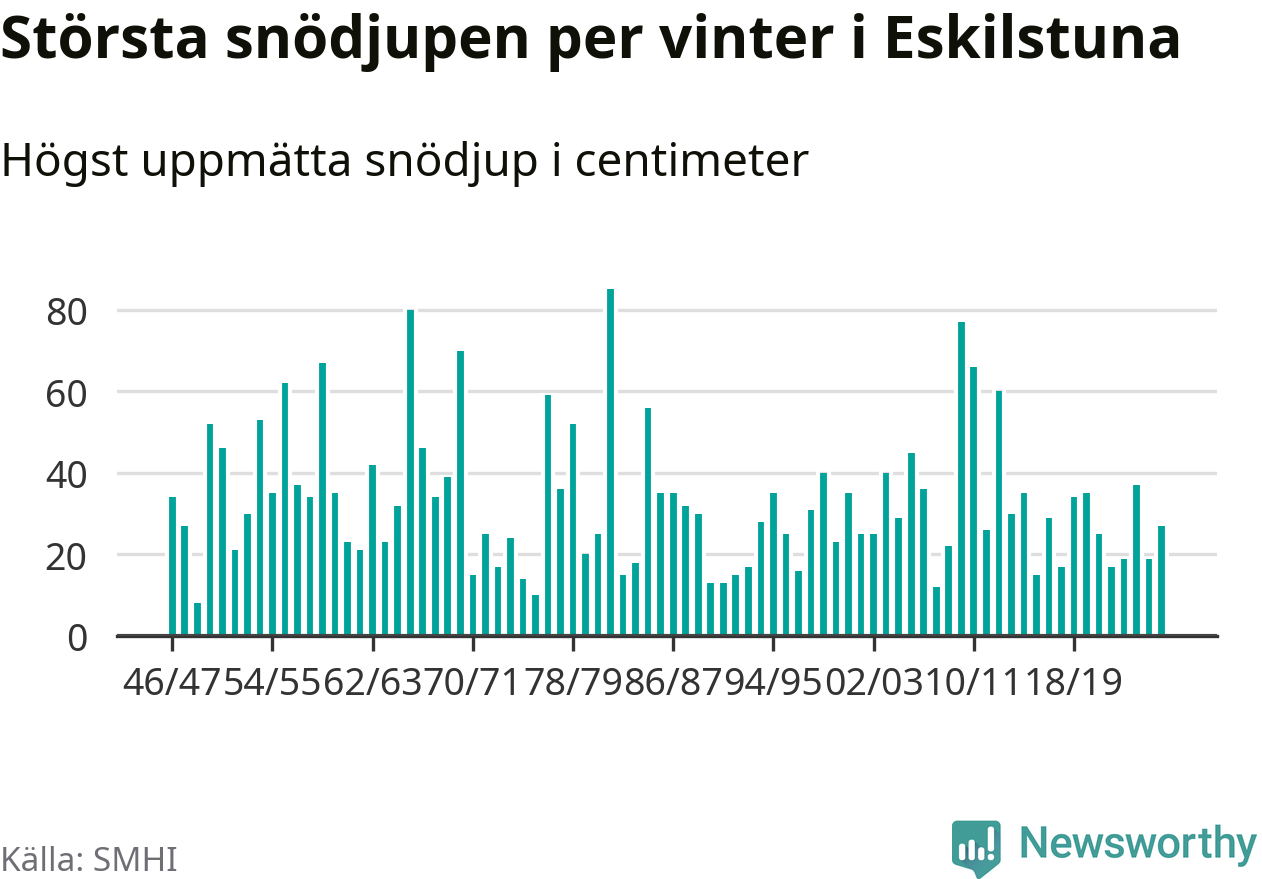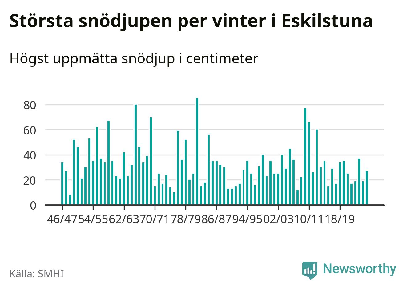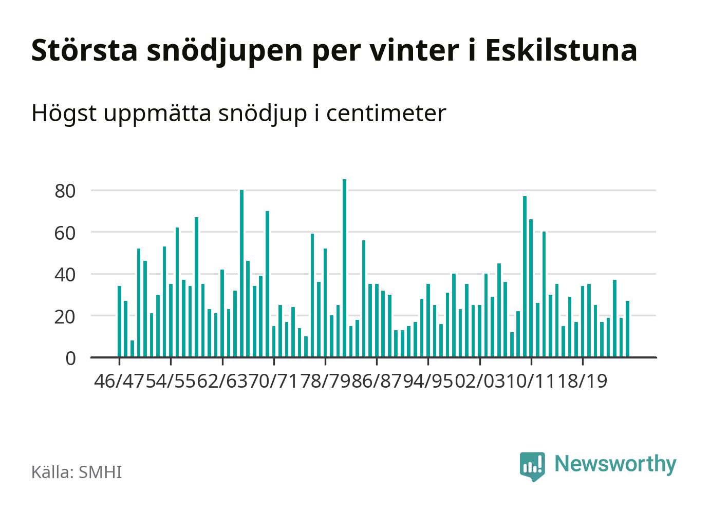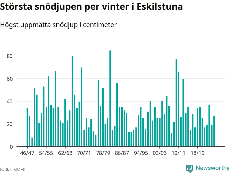 Men hur står sig det snödjupet historiskt sett? Newsworthy har tittat på det största snödjup som SMHI har uppmätt i Eskilstuna kommun varje år sedan vintern 1946/47 – och hittills tar sig årets vinter inte in bland de 25 vintrarna med störst uppmätt snödjup i kommunen.