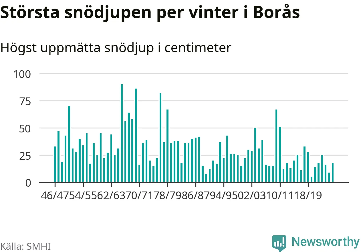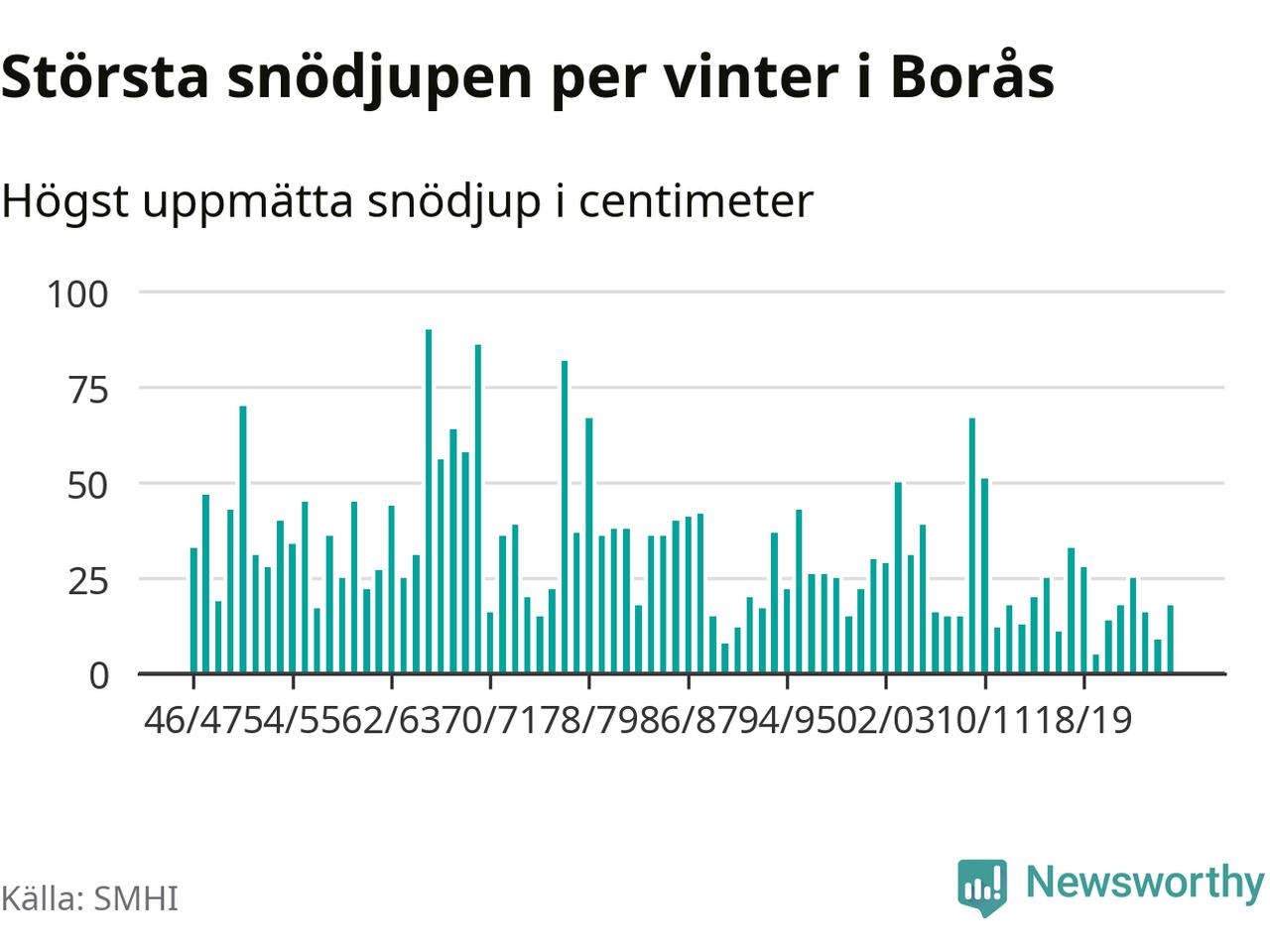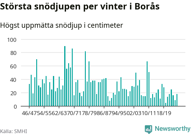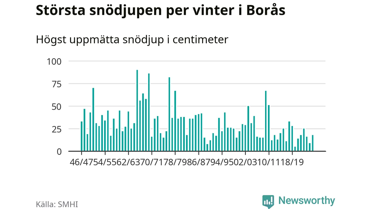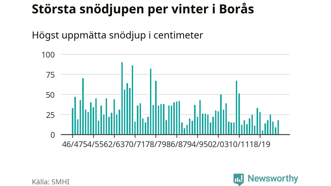 Men hur står sig det snödjupet historiskt sett? Newsworthy har tittat på det största snödjup som SMHI har uppmätt i Borås kommun varje år sedan vintern 1946/47 – och hittills tar sig årets vinter inte in bland de 25 vintrarna med störst uppmätt snödjup i kommunen.