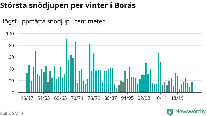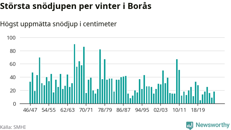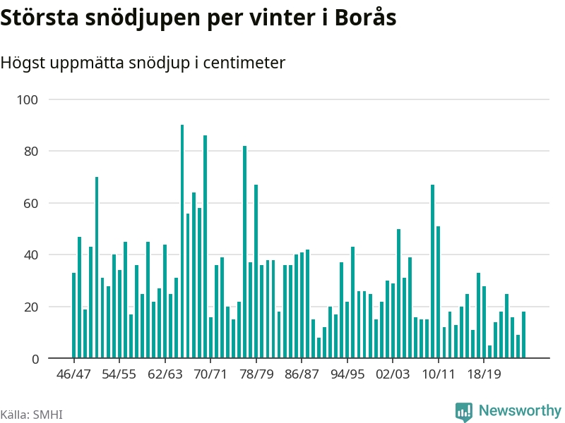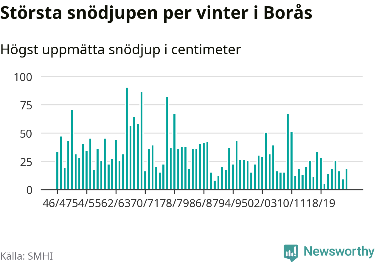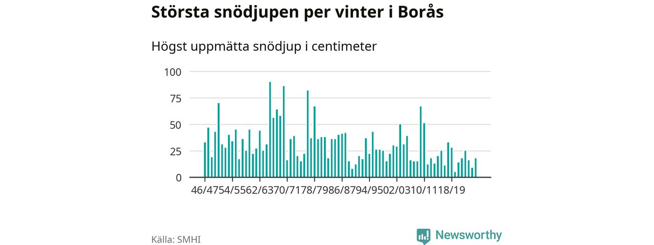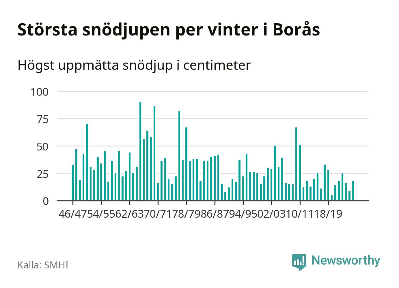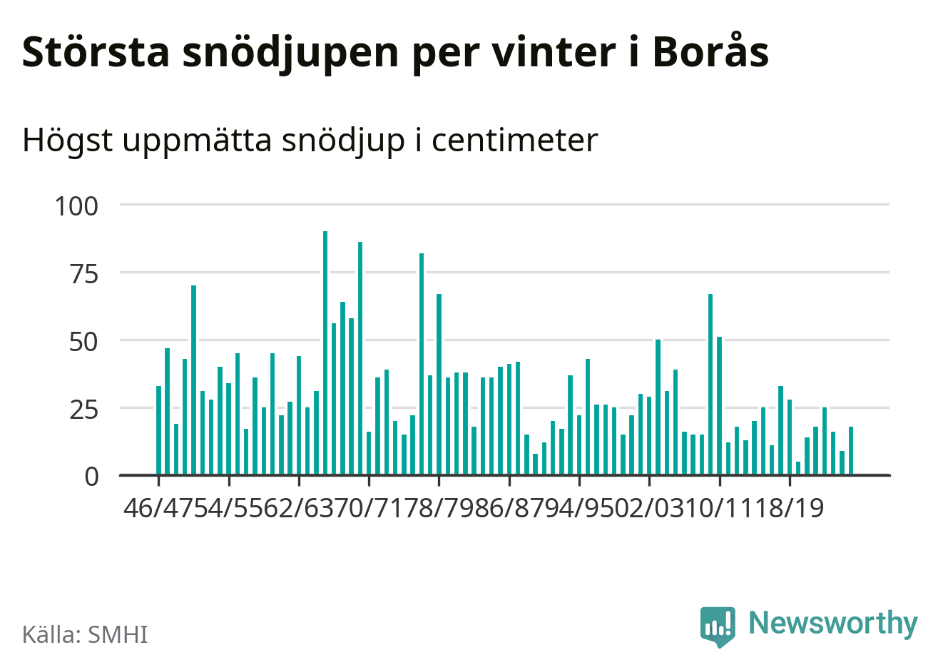 Men hur står sig det snödjupet historiskt sett? Newsworthy har tittat på det största snödjup som SMHI har uppmätt i Borås kommun varje år sedan vintern 1946/47 – och hittills tar sig årets vinter inte in bland de 25 vintrarna med störst uppmätt snödjup i kommunen.