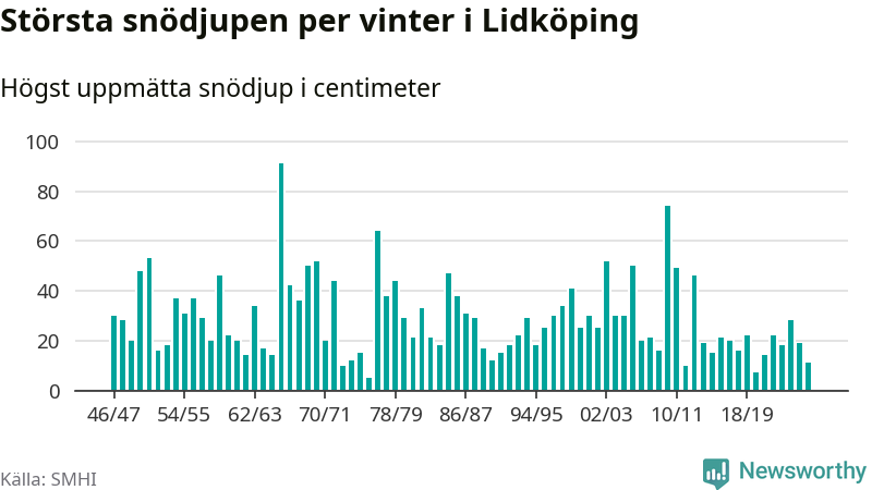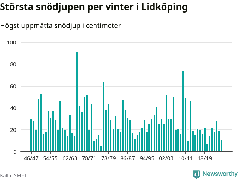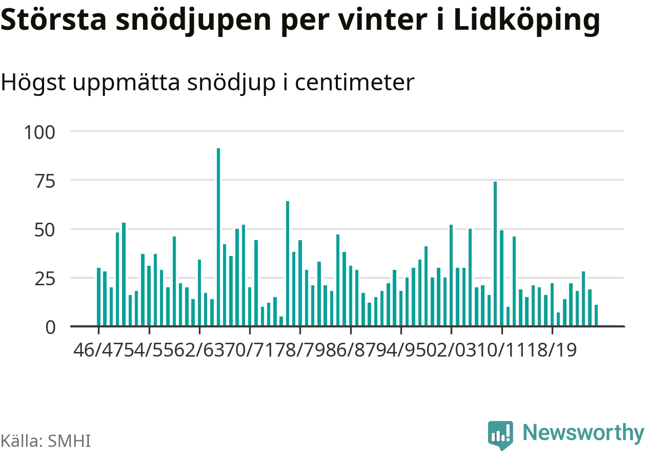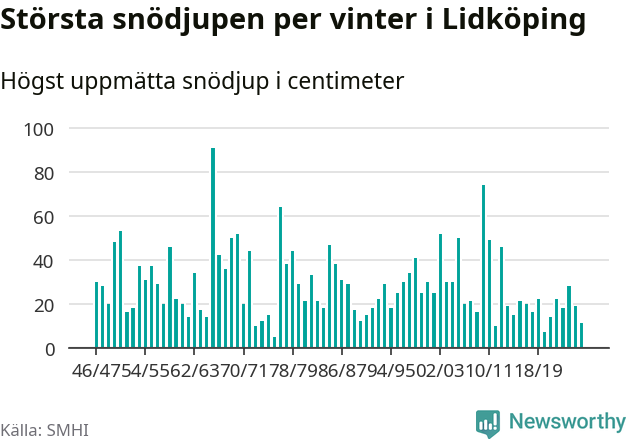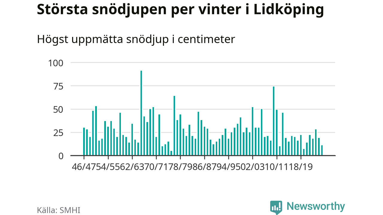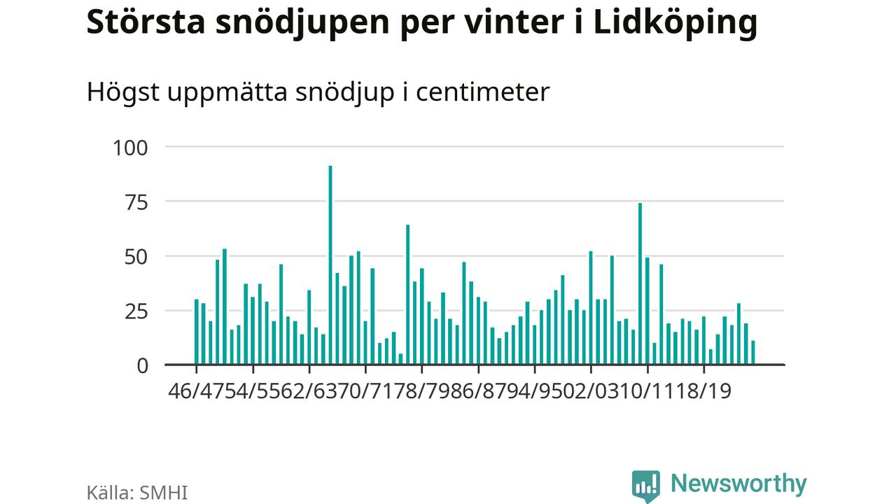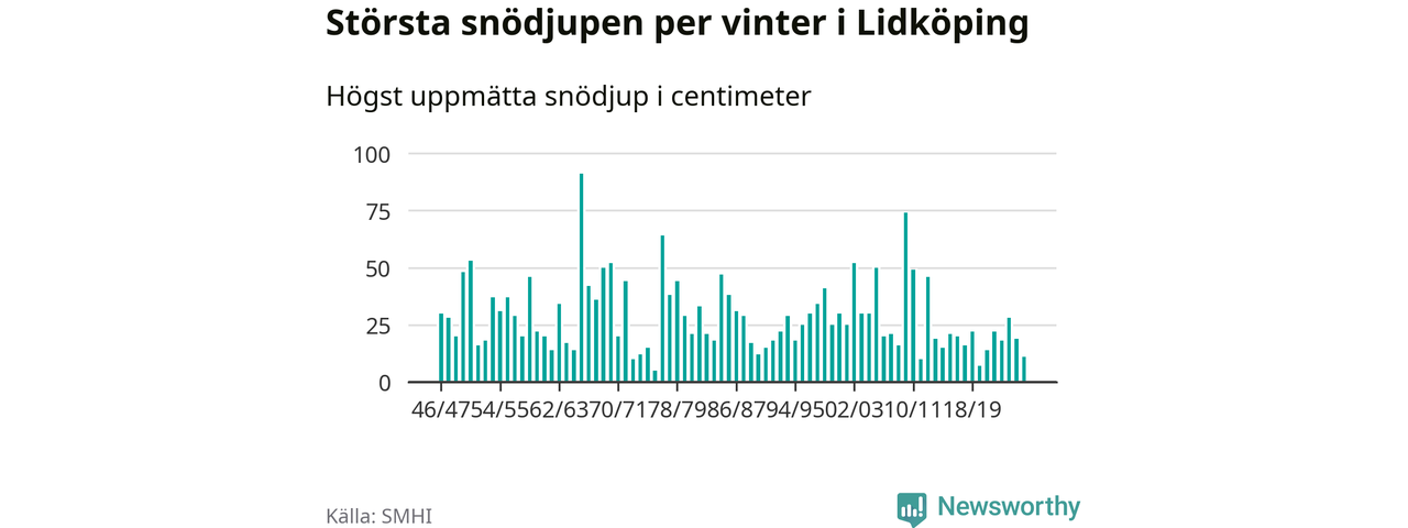 Men hur står sig det snödjupet historiskt sett? Newsworthy har tittat på det största snödjup som SMHI har uppmätt i Lidköpings kommun varje år sedan vintern 1946/47 – och hittills tar sig årets vinter inte in bland de 25 vintrarna med störst uppmätt snödjup i kommunen.