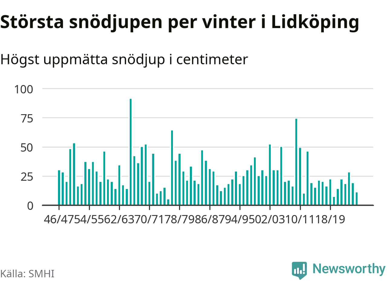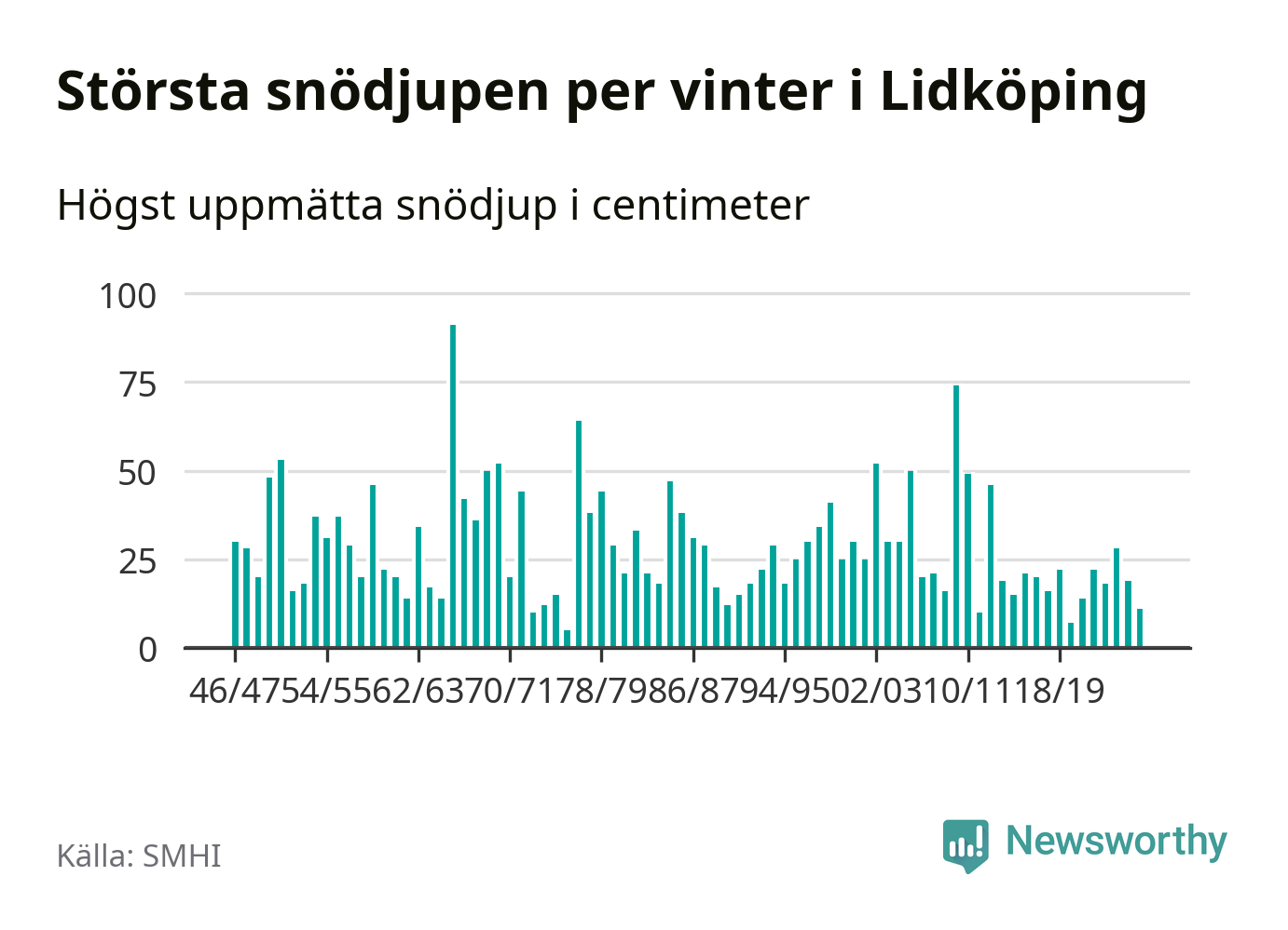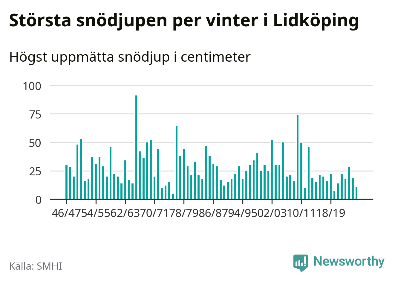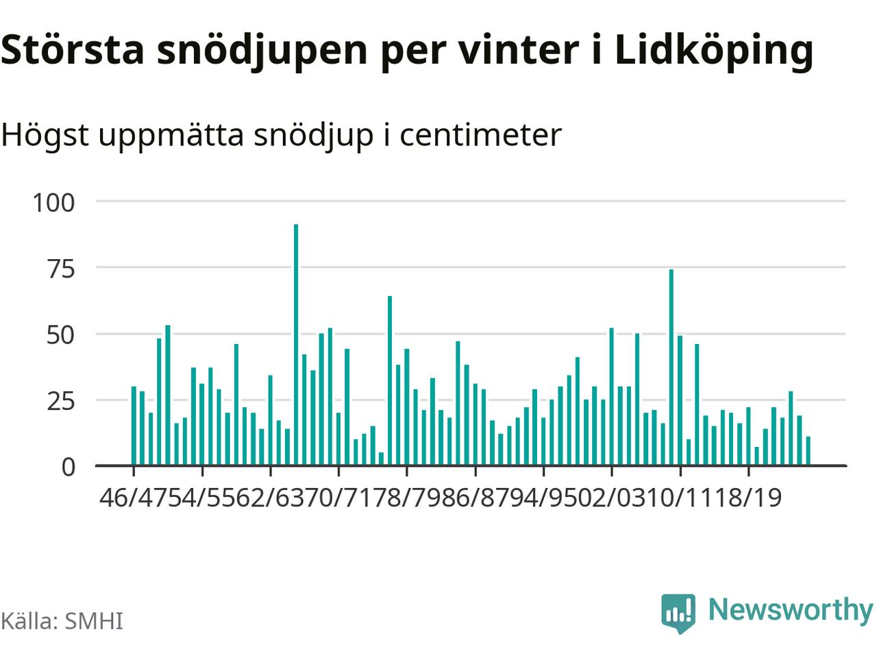 Men hur står sig det snödjupet historiskt sett? Newsworthy har tittat på det största snödjup som SMHI har uppmätt i Lidköpings kommun varje år sedan vintern 1946/47 – och hittills tar sig årets vinter inte in bland de 25 vintrarna med störst uppmätt snödjup i kommunen.