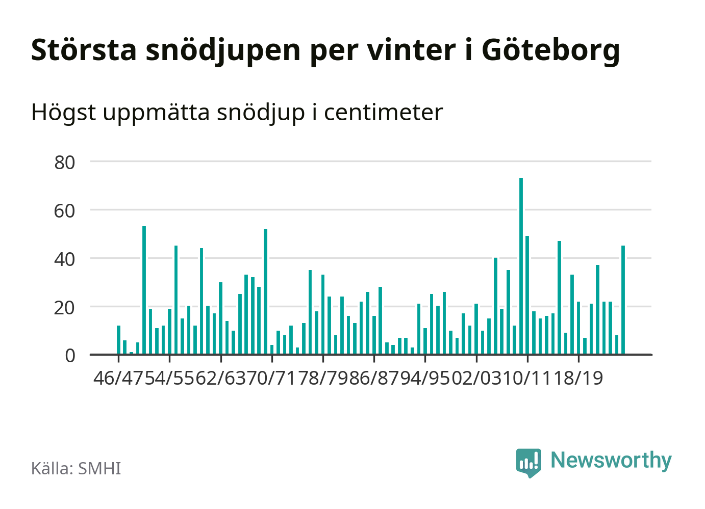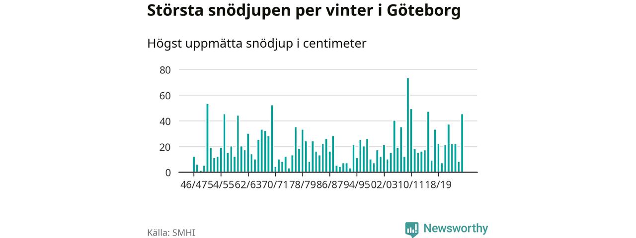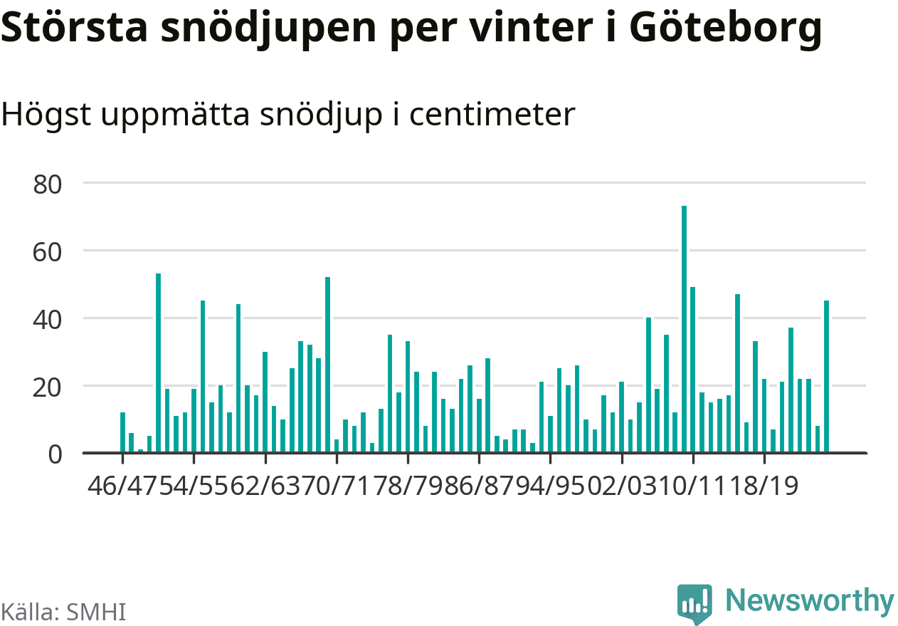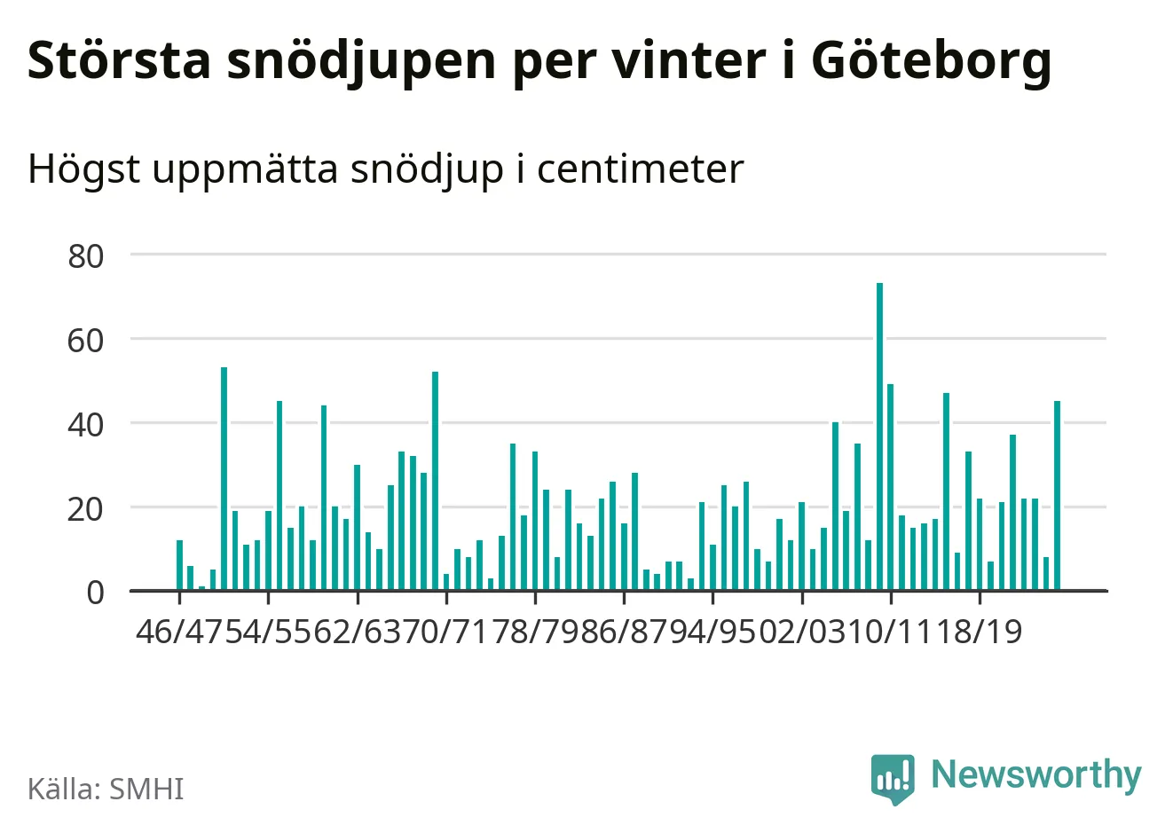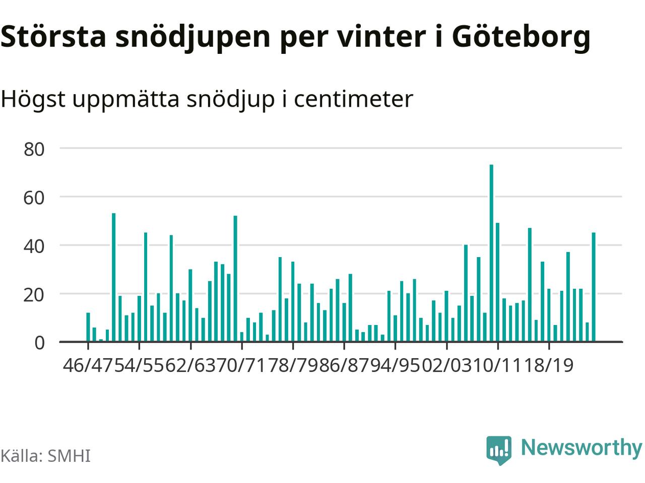 Men hur står sig det snödjupet historiskt sett? Newsworthy har tittat på det största snödjup som SMHI har uppmätt i Göteborgs kommun varje år sedan vintern 1946/47. Fem vintrar har det uppmätts större snödjup.